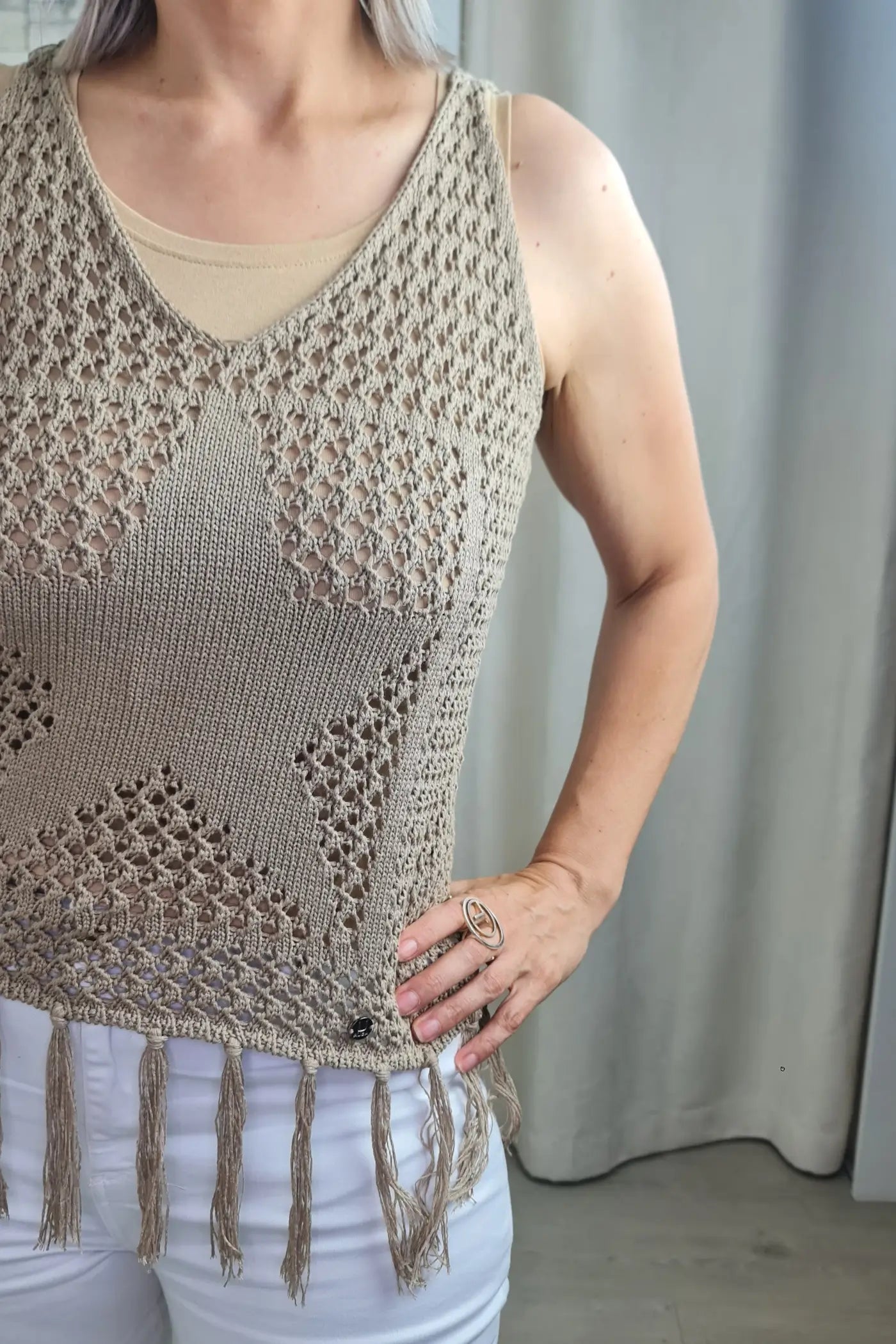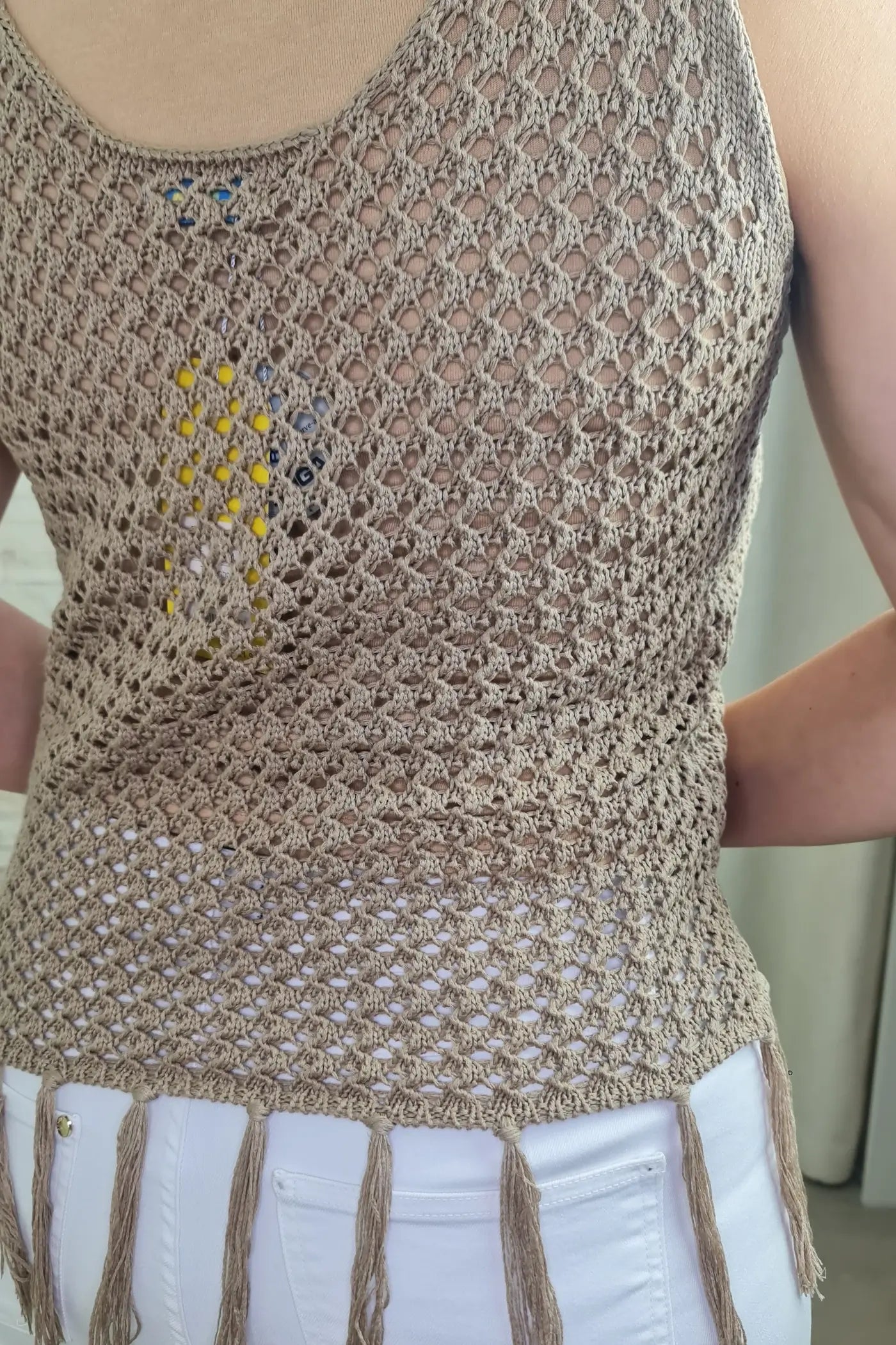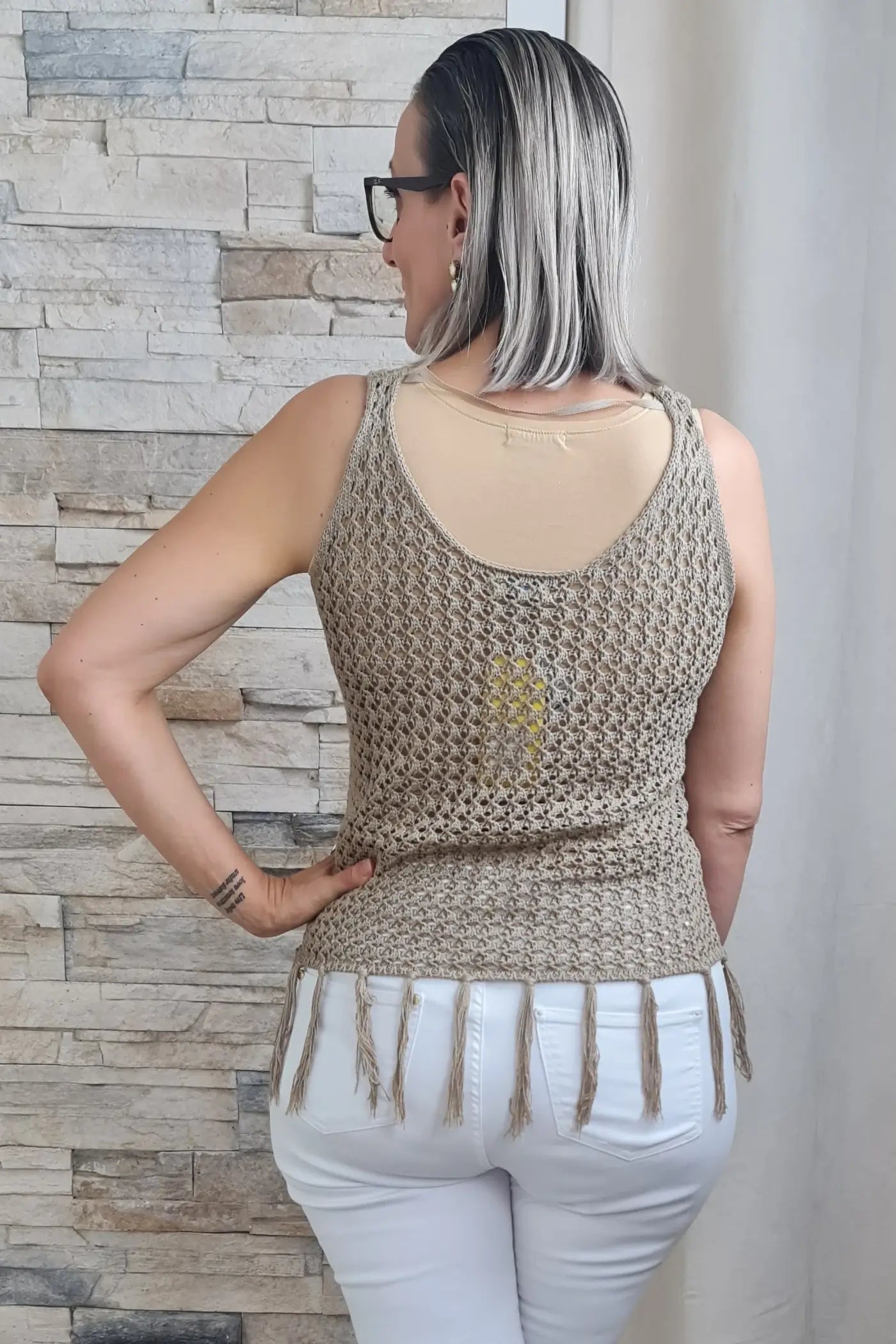 Ao vestir este top, o toque suave da malha rendada e o tom neutro transmitem uma sensação de calma e elegância discreta. O padrão de estrela, que se forma no tecido, não é apenas um detalhe, é um lembrete subtil do seu brilho interior, da sua força e singularidade. As franjas na bainha movem-se com cada passo, simbolizando a sua liberdade de expressão e a sua coragem de ser quem realmente é.