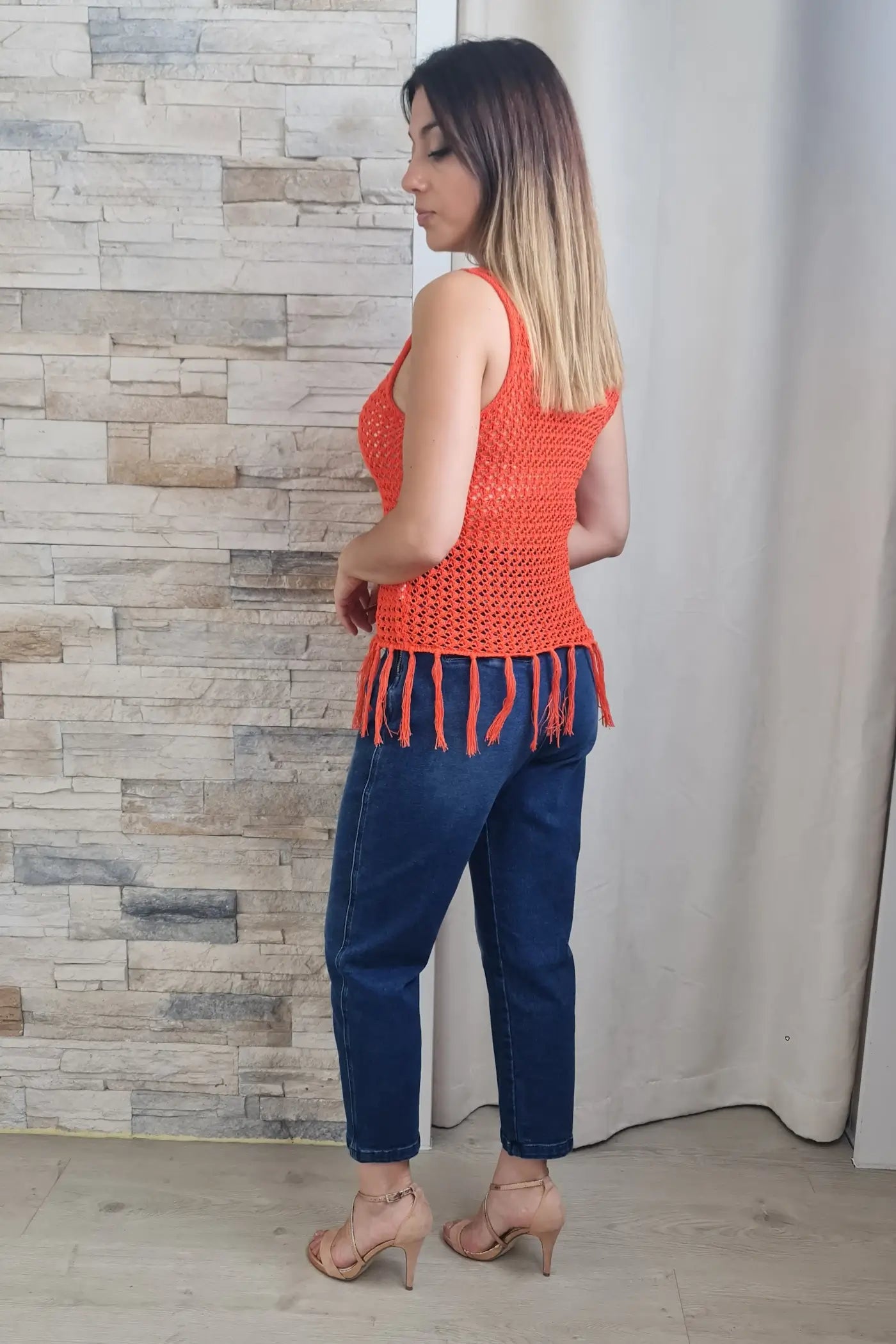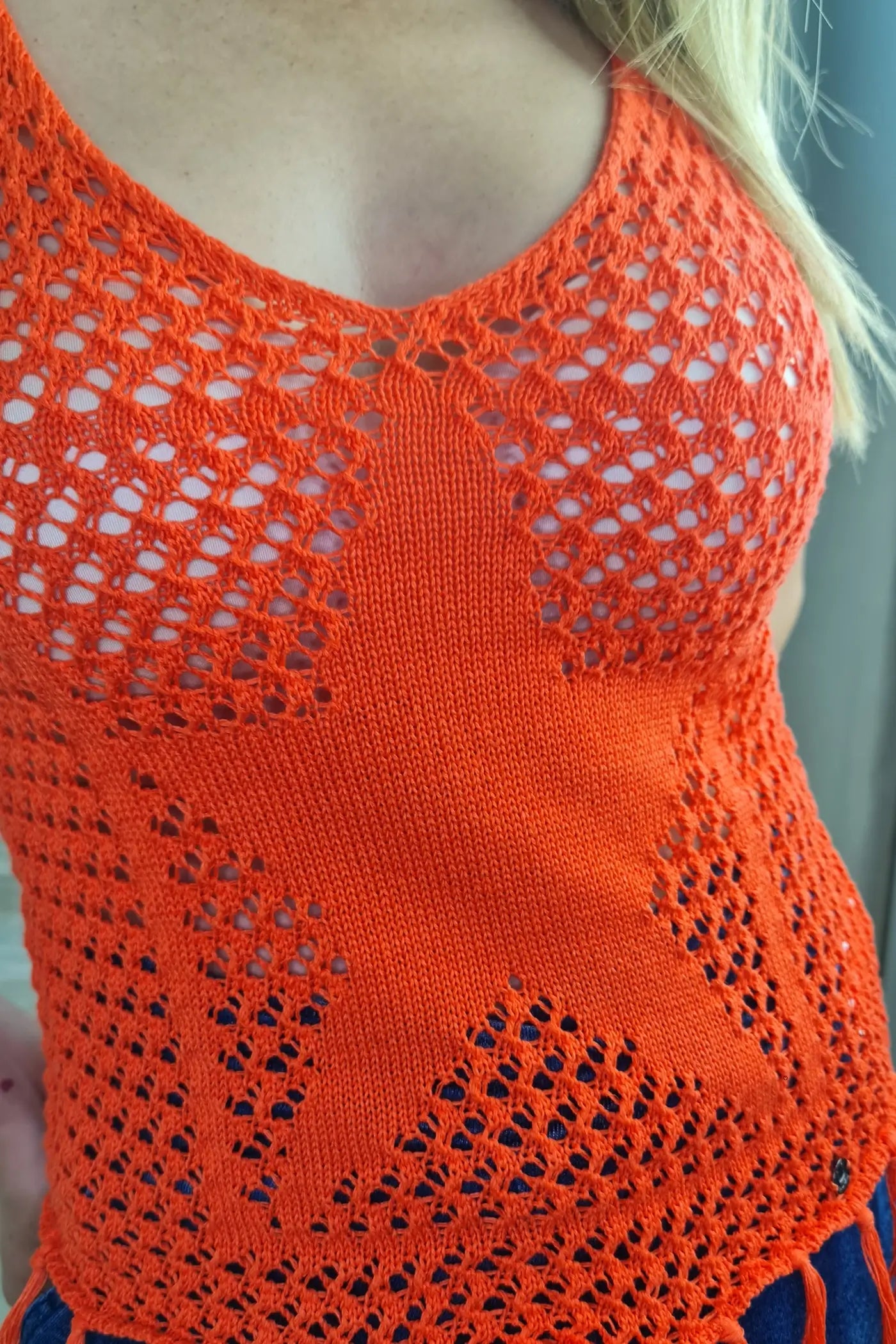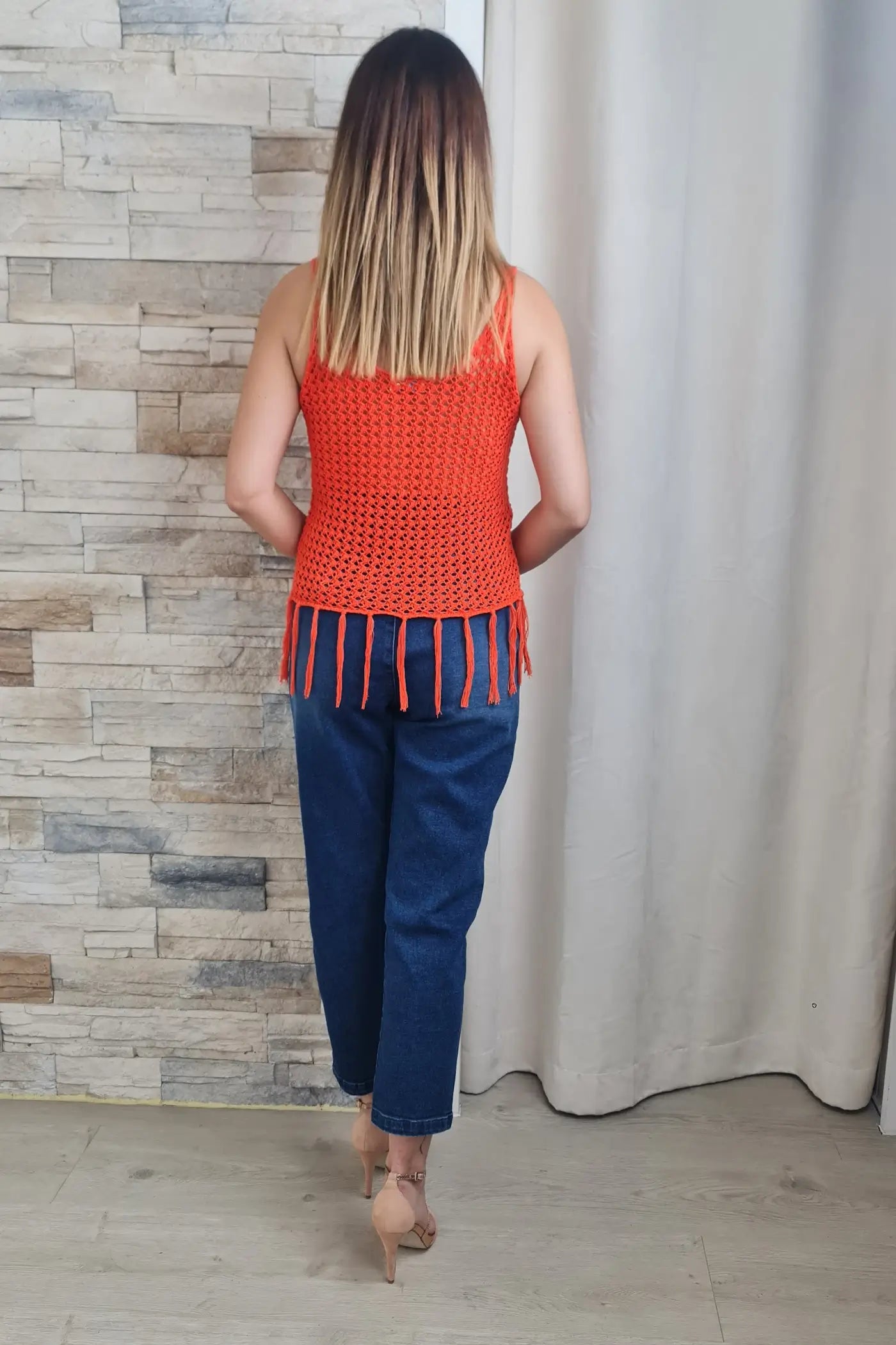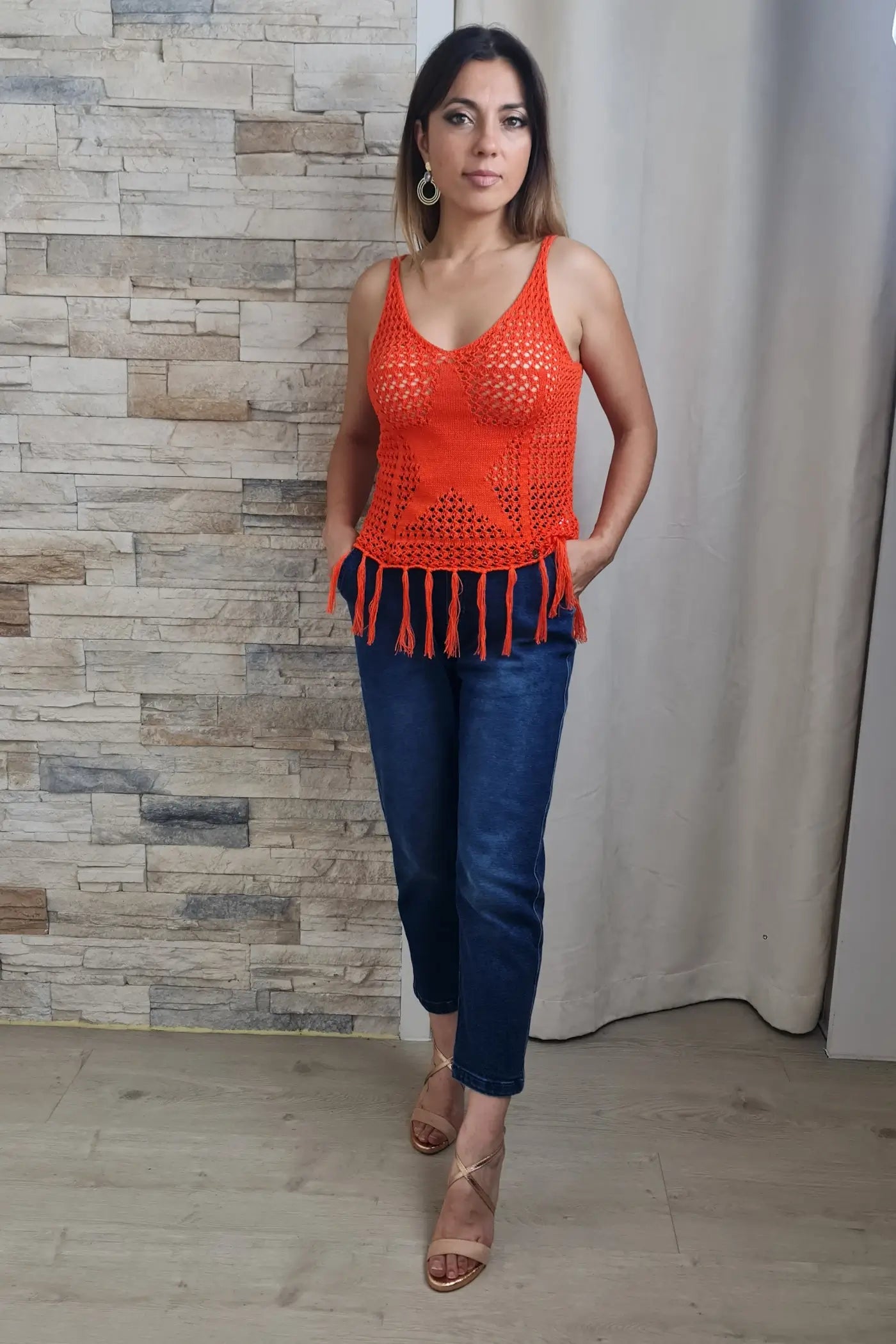 Ao vestir este top, o tom laranja vibrante é como uma injeção de energia positiva, elevando o seu ânimo e o seu visual. O tecido em malha rendada, com o padrão de estrela central, convida à ousadia e à celebração da sua personalidade. As franjas na bainha, que se movem com cada passo, são a representação da sua autenticidade e da sua vontade de se expressar sem restrições.