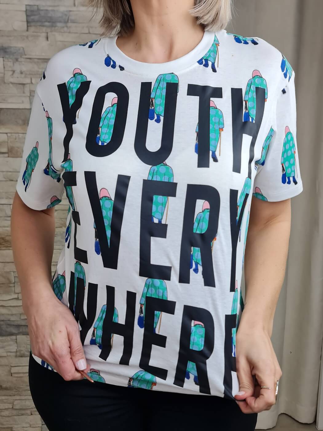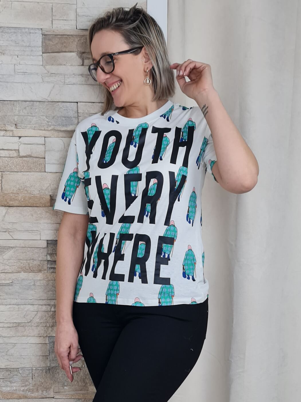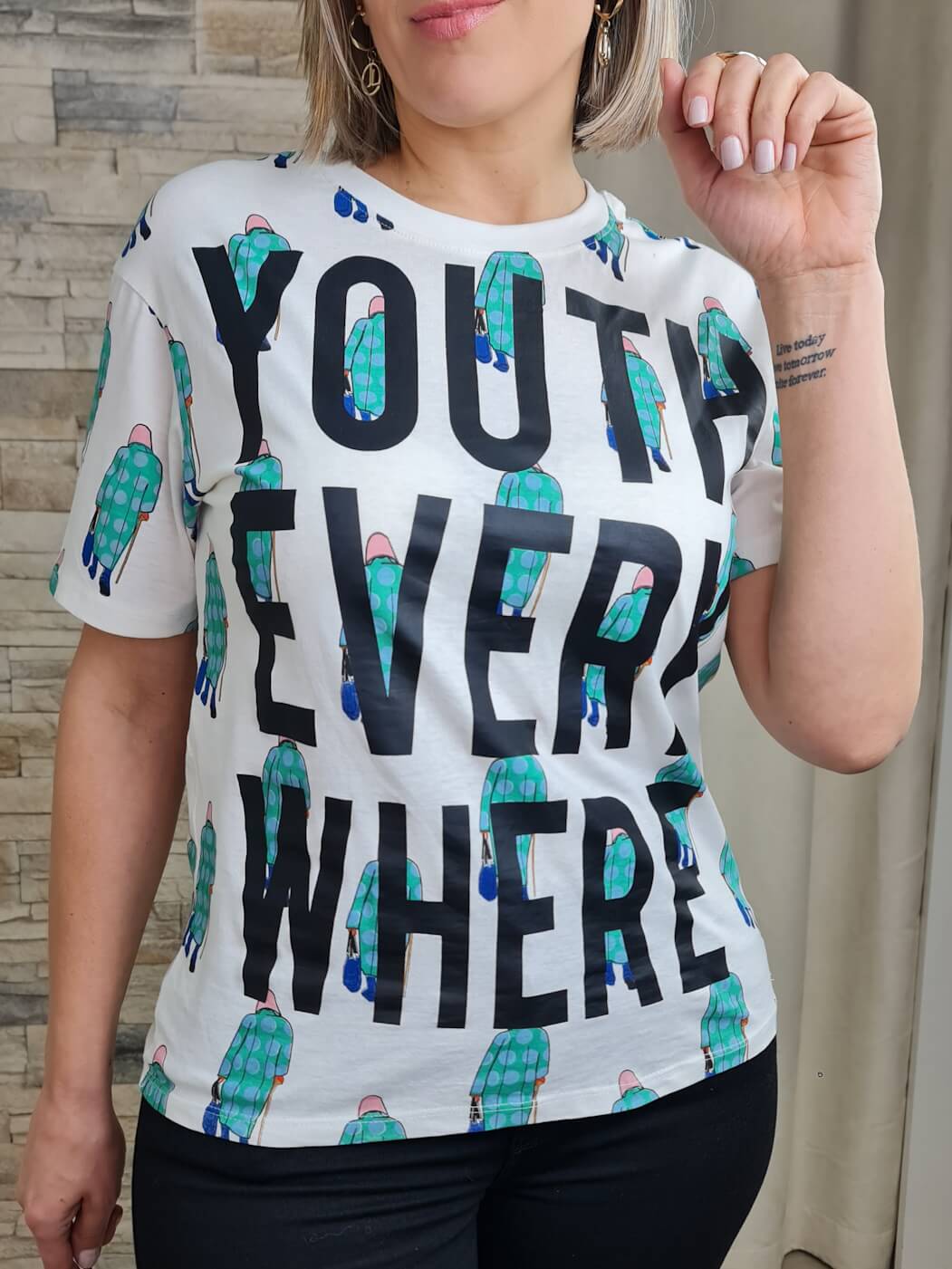 A t-shirt apresenta um design moderno e descontraído, com mangas curtas e decote redondo. A cor branca da peça serve de tela para uma estampa repetida de figuras em tons de verde e azul, criando um padrão divertido e original. A frase "YOUTH EVERYWHERE" estampada em letras pretas na parte frontal da t-shirt adiciona um toque de atitude e personalidade.