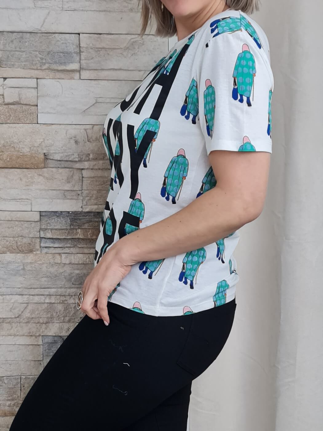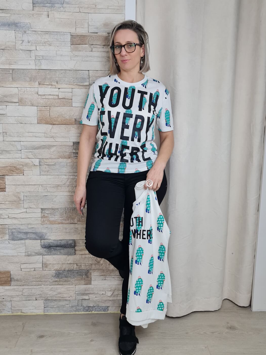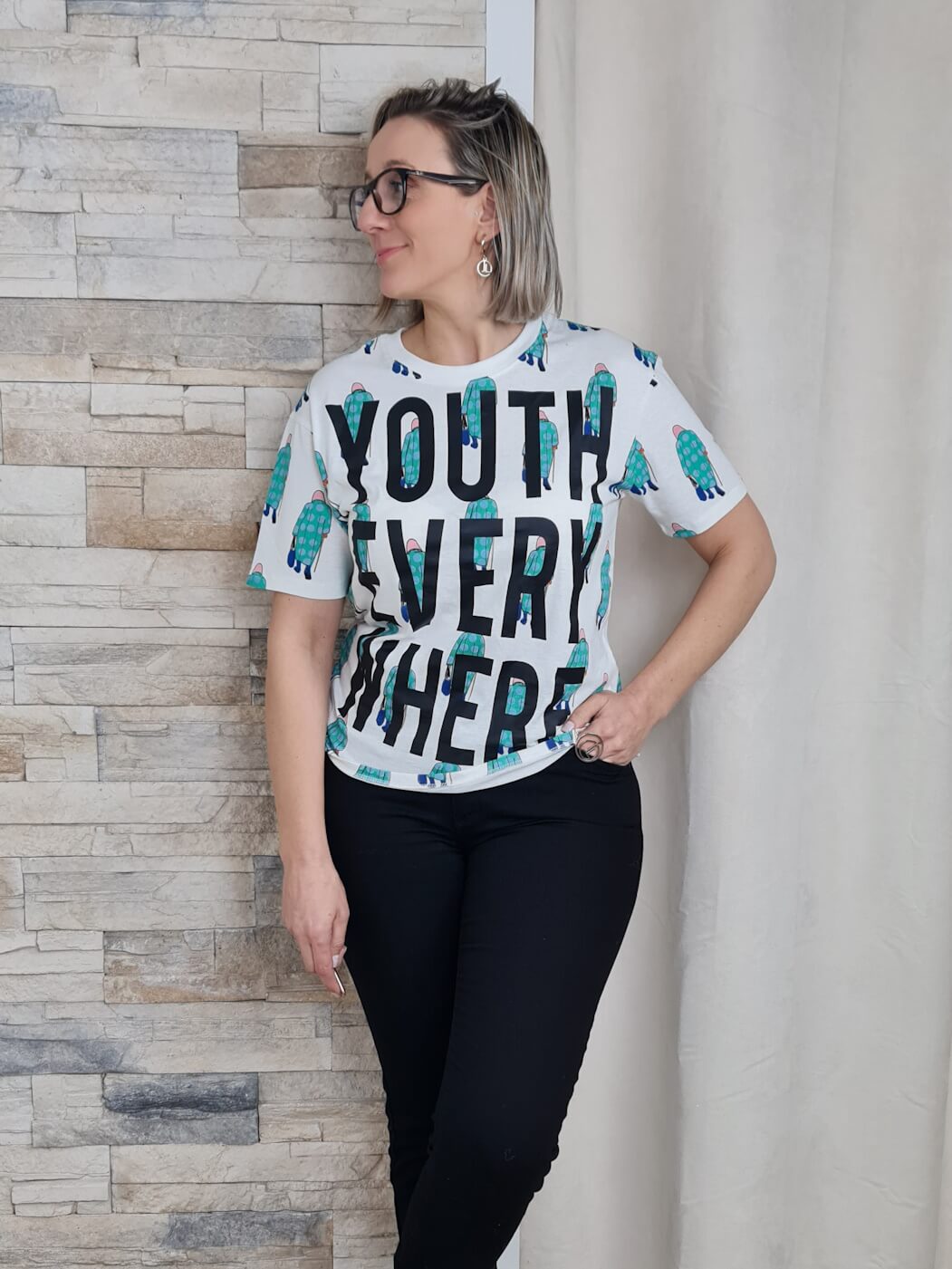 A t-shirt apresenta um design moderno e descontraído, com mangas curtas e decote redondo. A cor branca da peça serve de tela para uma estampa repetida de figuras em tons de verde e azul, criando um padrão divertido e original. A frase "YOUTH EVERYWHERE" estampada em letras pretas na parte frontal da t-shirt adiciona um toque de atitude e personalidade.