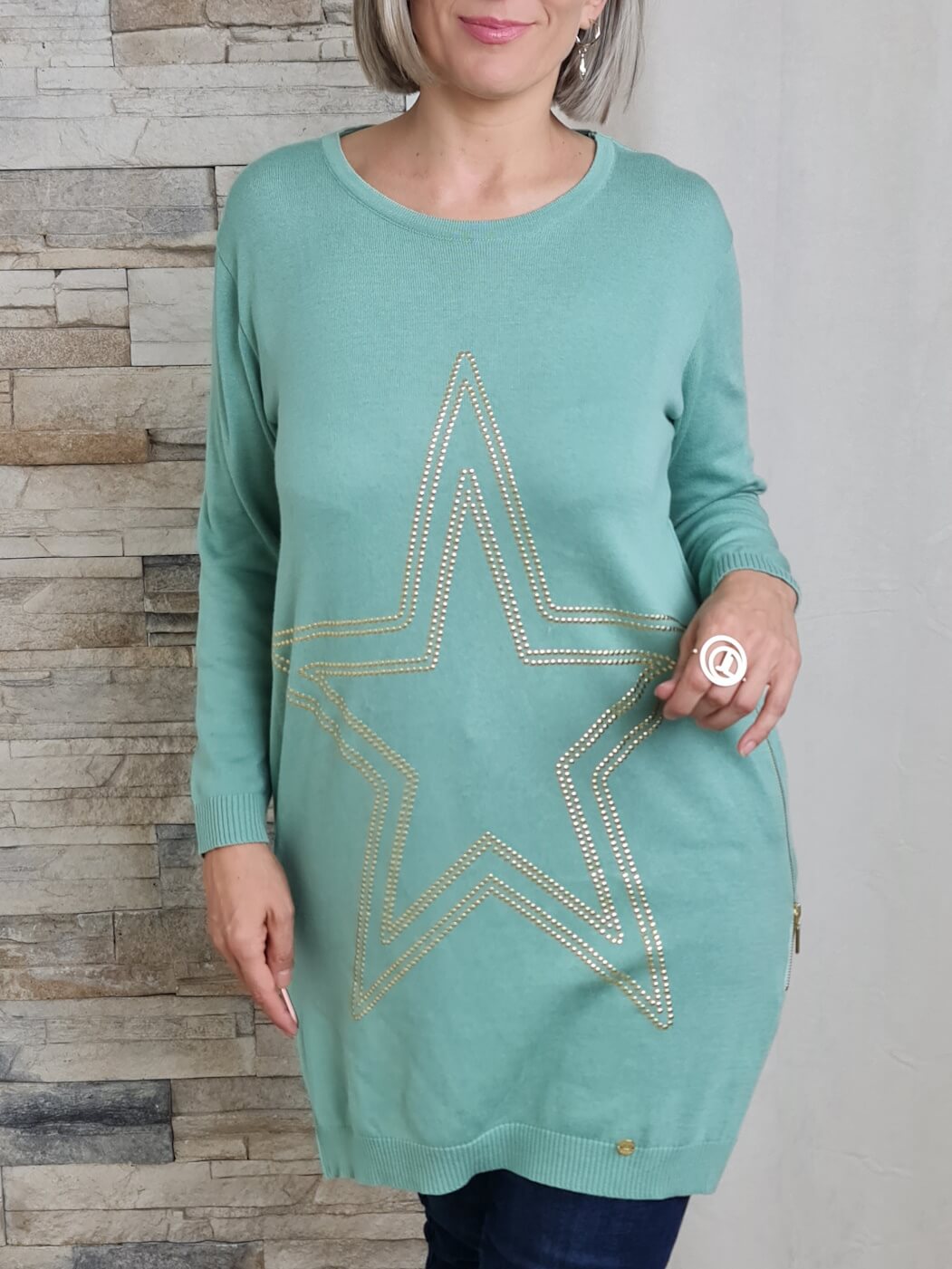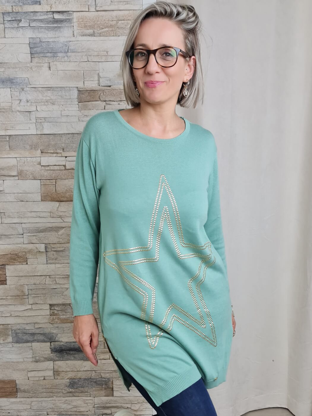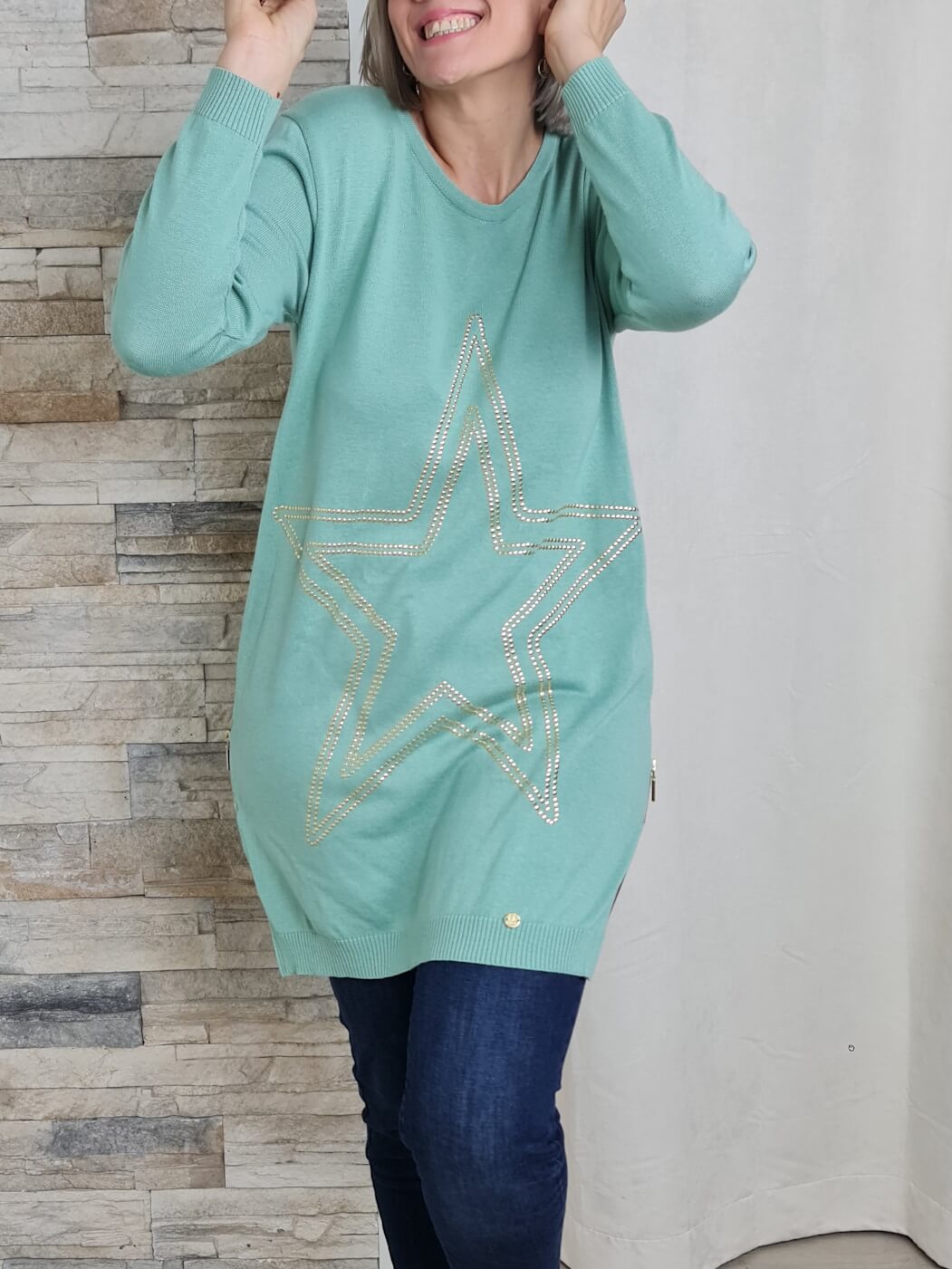O design é uma fusão de conforto e detalhes cintilantes. Com decote redondo e mangas compridas, destaca-se pela cor verde menta suave e uma estrela grande delineada com lantejoulas douradas na parte frontal, adicionando um toque de doçura e brilho. Possui também fechos laterais para um ajuste versátil.