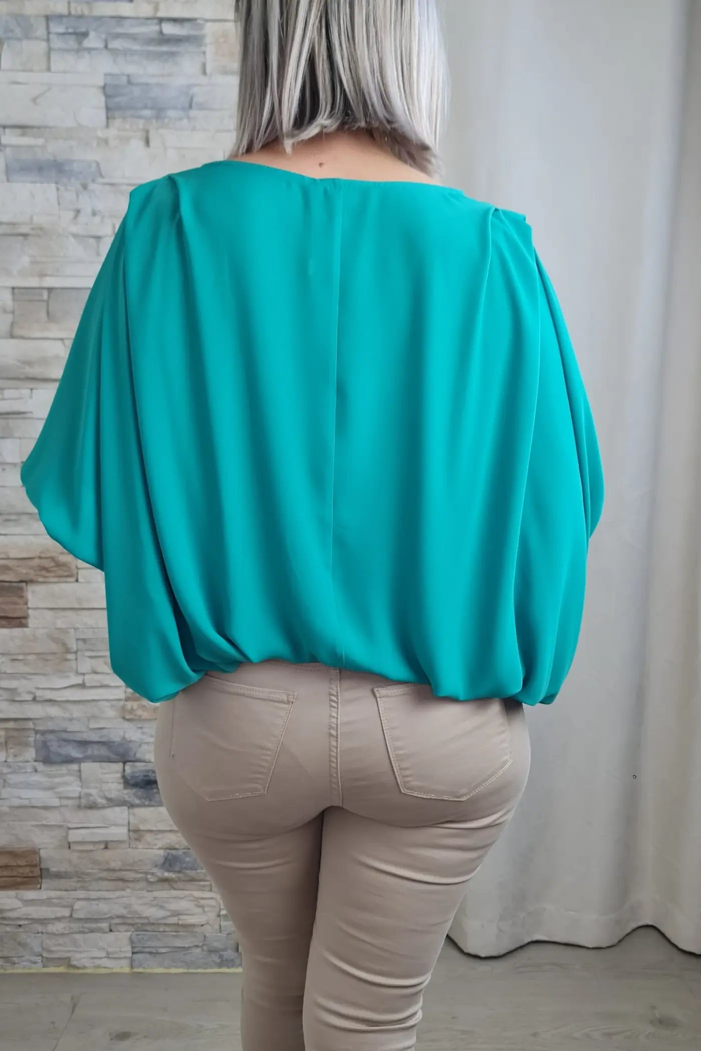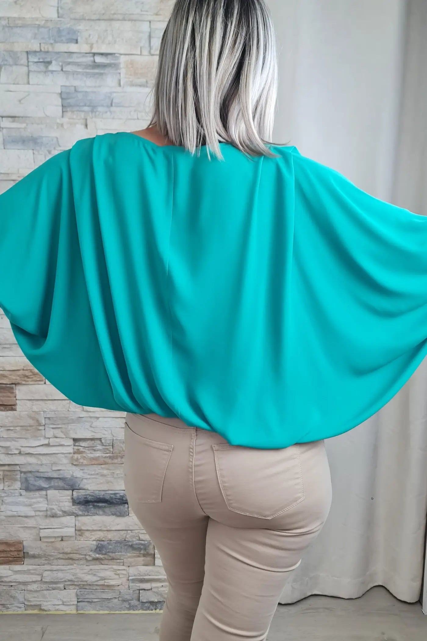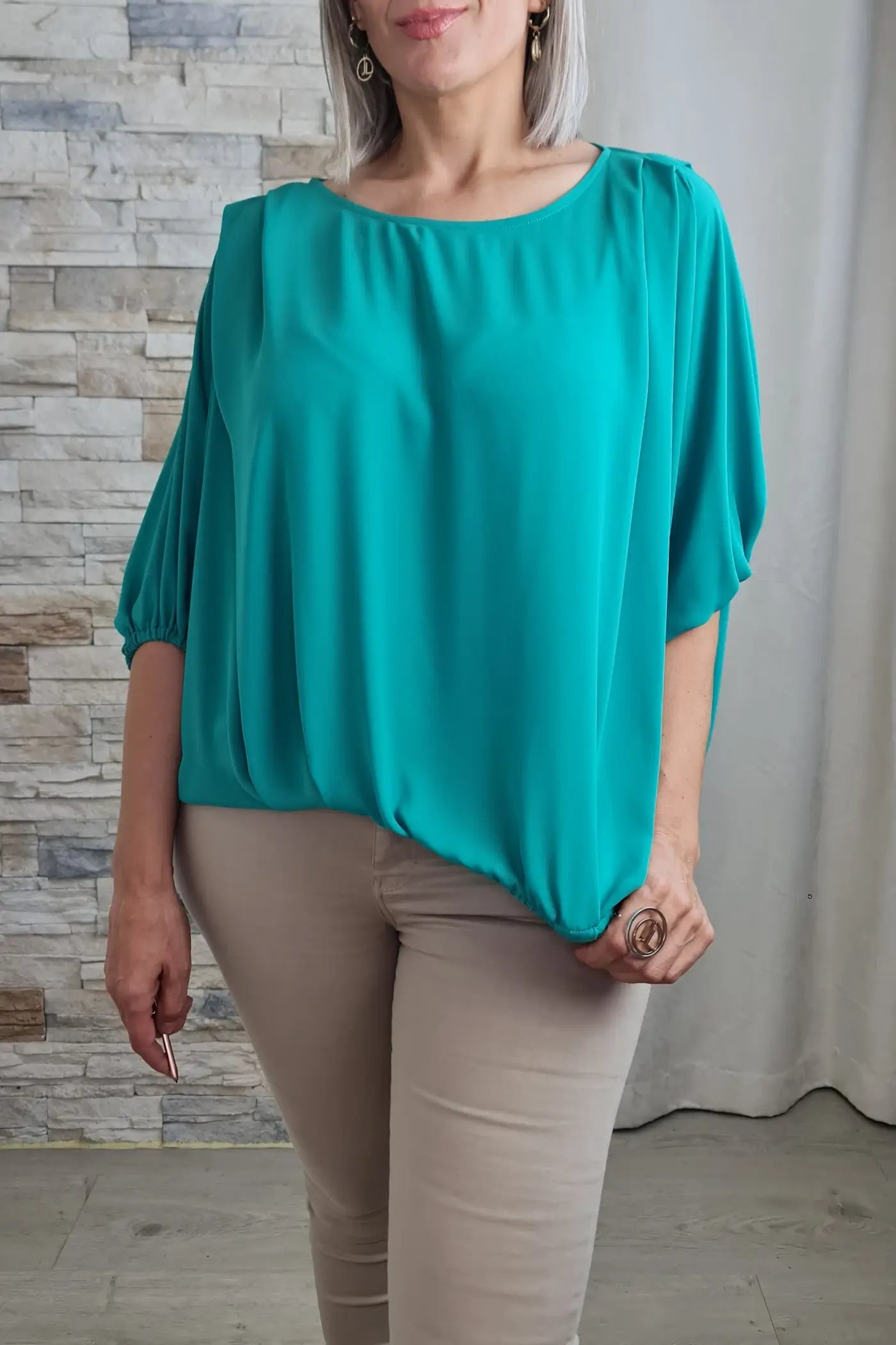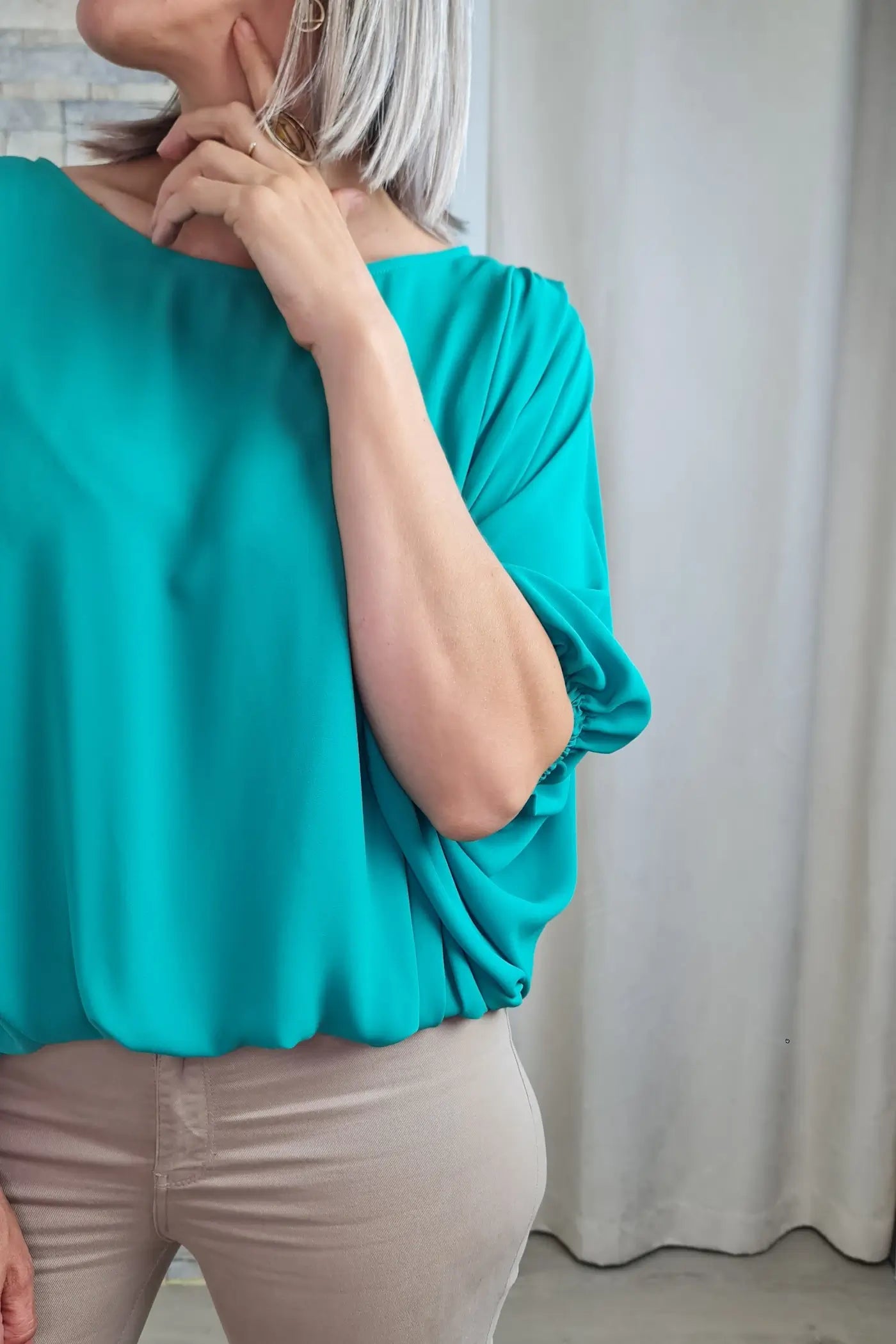 Ao vestir esta túnica, a sua cor azul turquesa, que evoca a serenidade do oceano e a leveza do céu, transmite uma sensação imediata de calma e otimismo. O seu corte com mangas tipo morcego, conferem um toque de originalidade, convidando-a a expressar a sua personalidade de forma autêntica e descomplicada. O seu decote em barco é um lembrete subtil da sua beleza interior, fazendo-a sentir-se confiante para irradiar a sua luz por onde for.