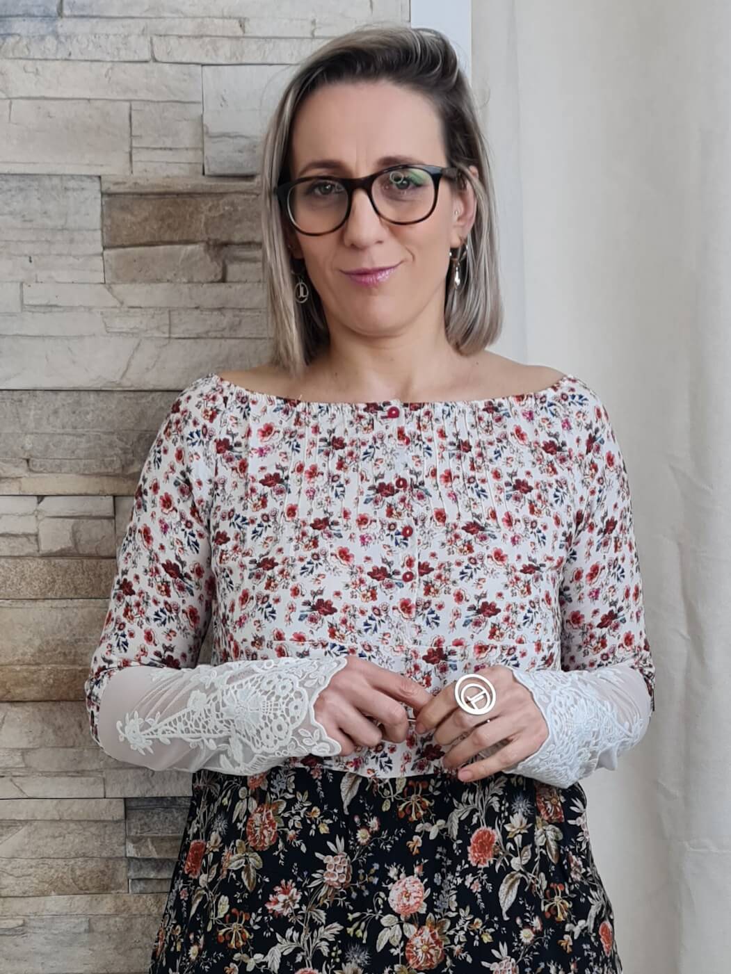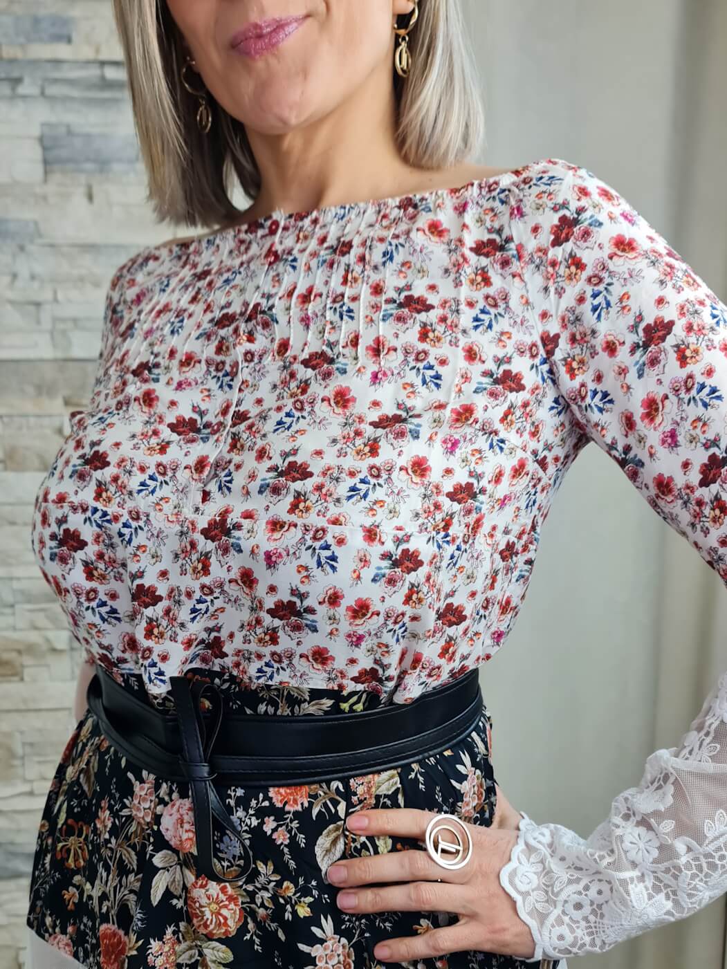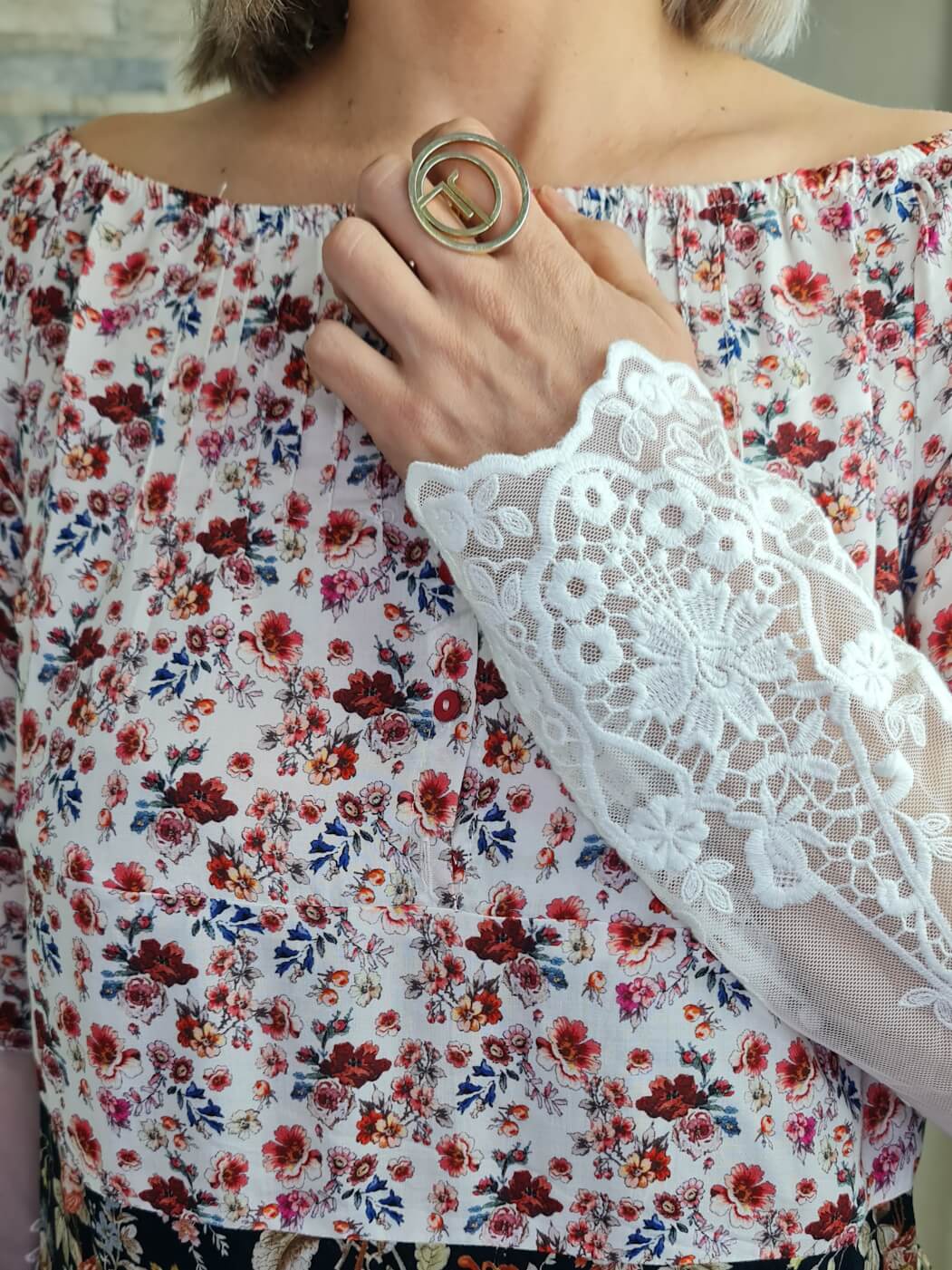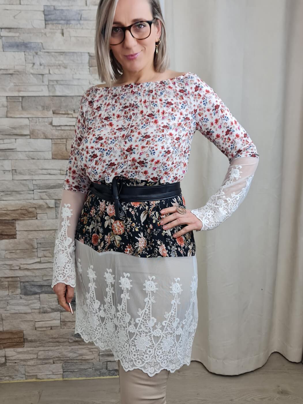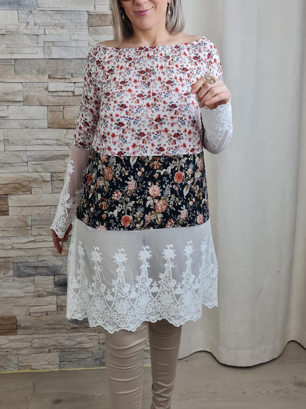 O destaque fica por conta das três faixas horizontais que compõem o corpo da blusa. A faixa central em tecido preto com estampado floral em tons de rosa e laranja cria um contraste marcante. A faixa inferior em renda branca com detalhes florais adiciona um toque delicado e feminino.