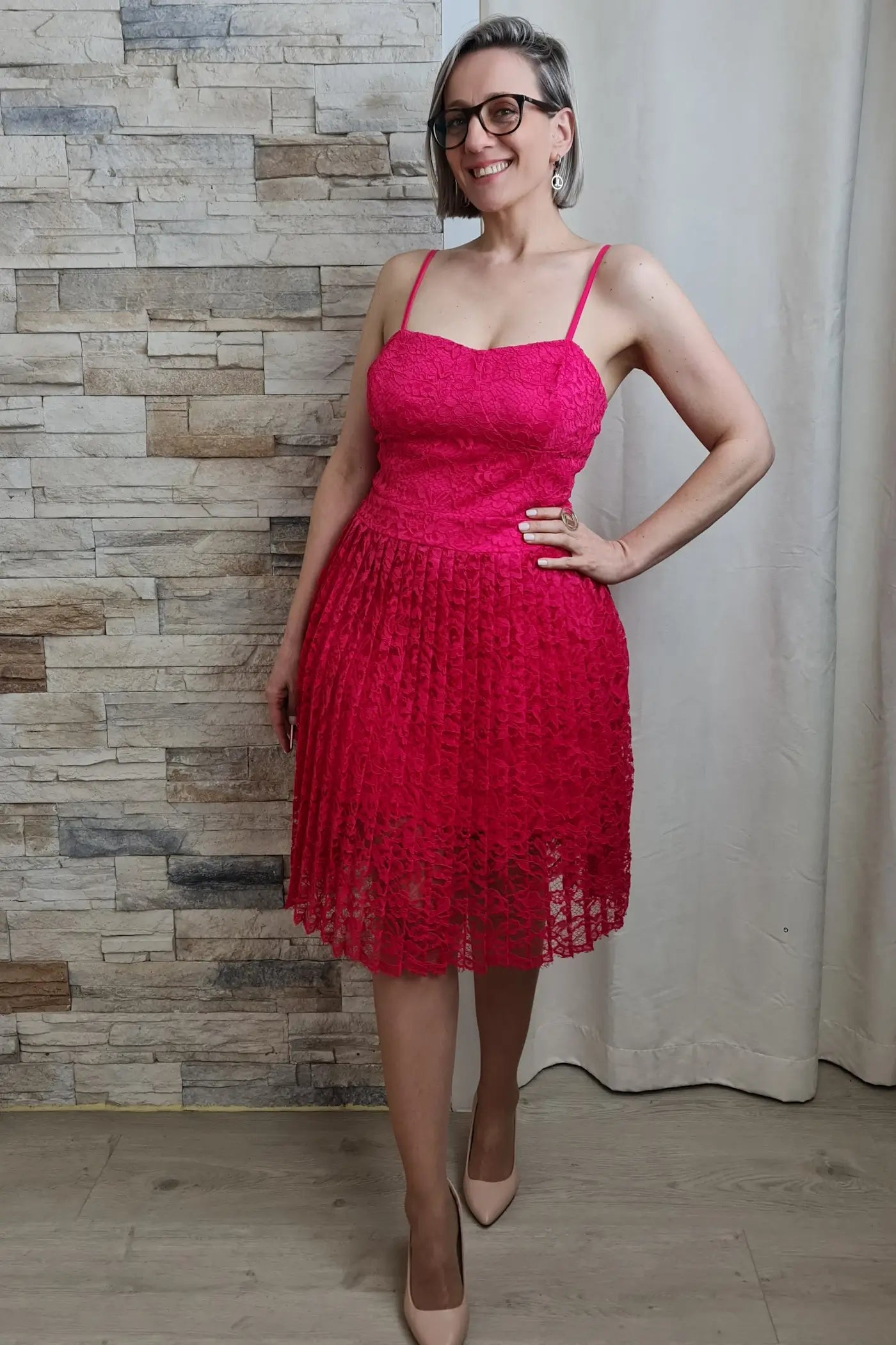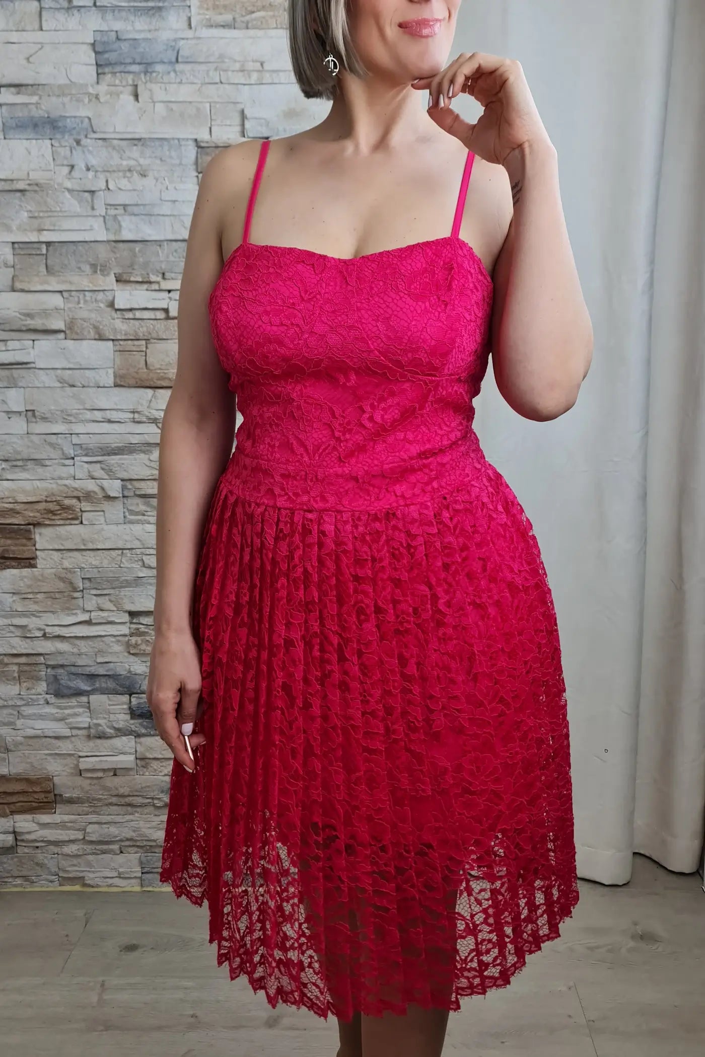 O vestido é uma peça moderna e elegante, ideal para diversas ocasiões. Apresenta um corte curto com alças finas e decote coração, valorizando o colo. O tecido é todo em renda floral na cor fúcsia vibrante, conferindo um toque romântico e sofisticado ao look.