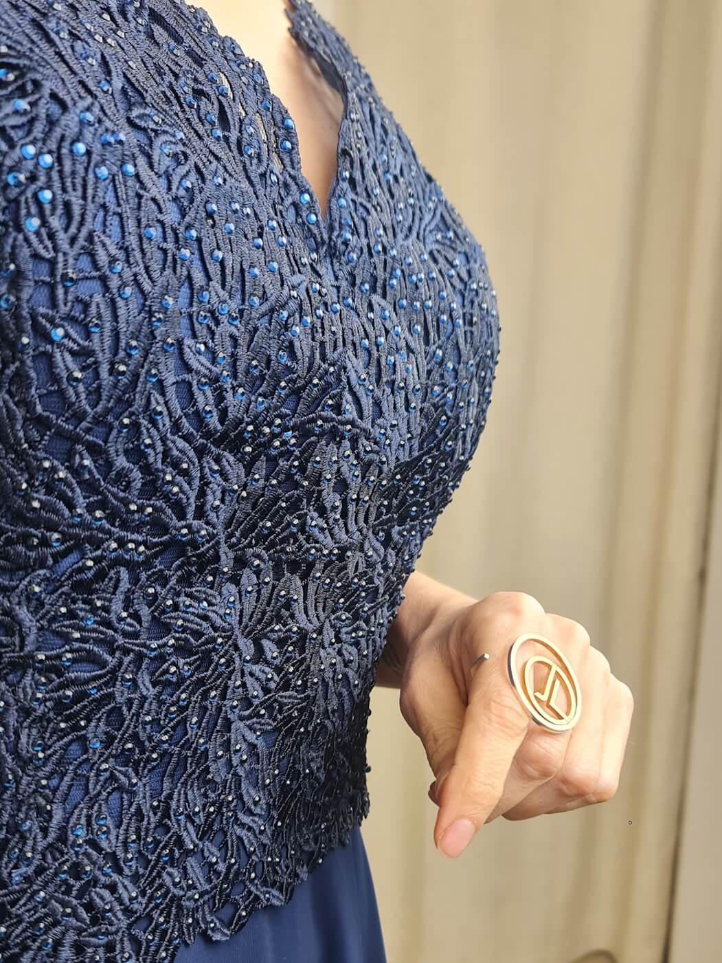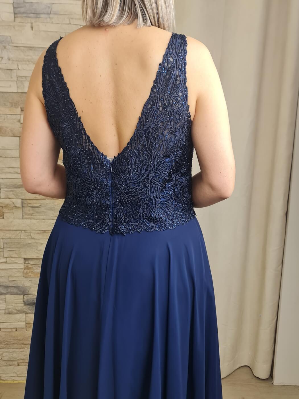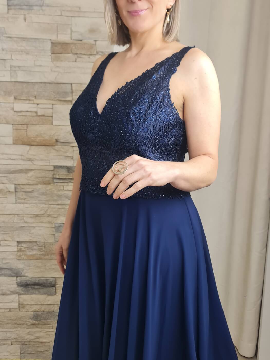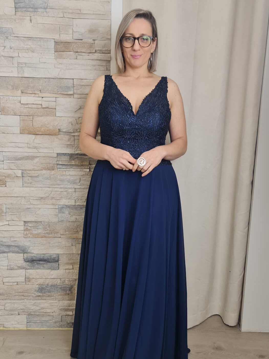 Vestido longo azul com bordado preto na parte superior. Pequenos brilhantes azuis adicionam um toque de sofisticação à zona do peito. Decote em V simétrico e ligeiro ajuste na cintura para realçar a silhueta. Caimento fluído para um look elegante e harmonioso. Perfeito para eventos especiais.