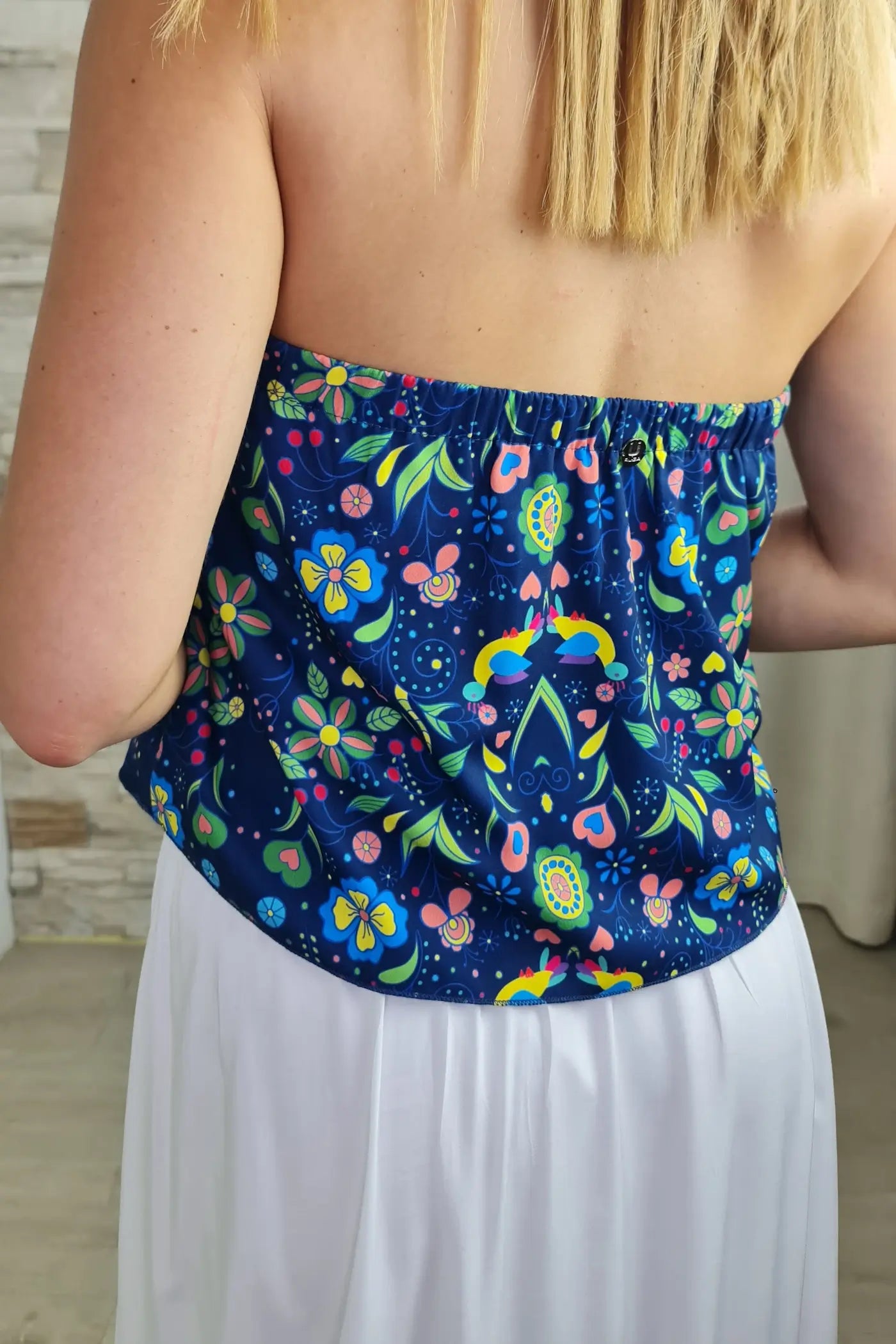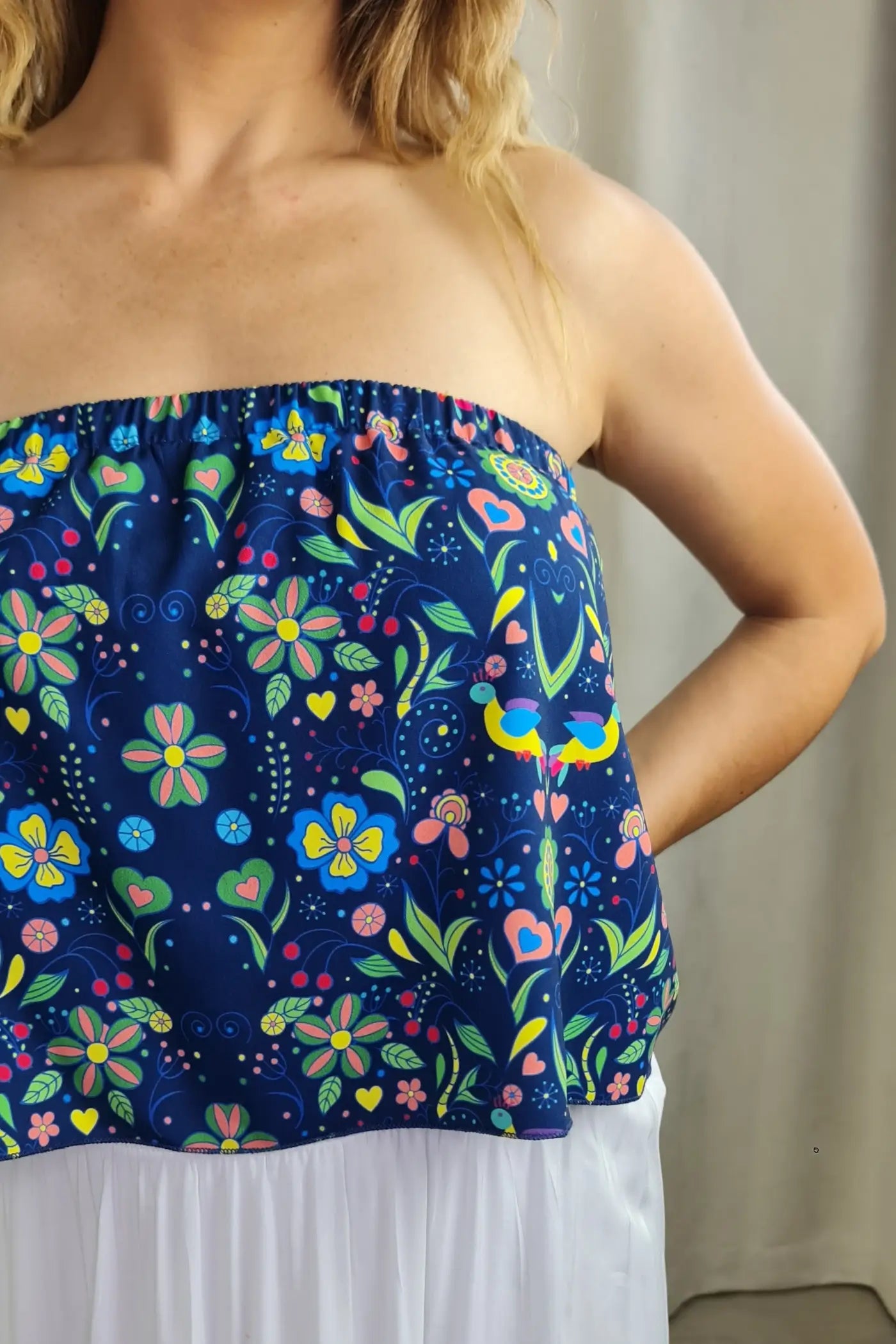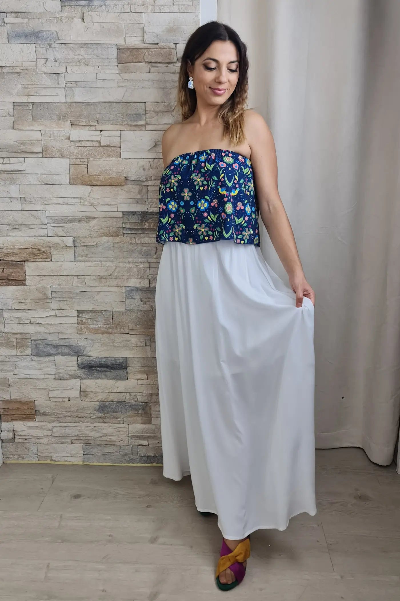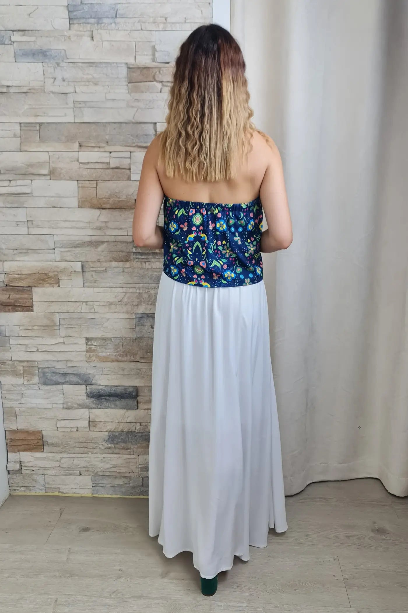 O design é prático e moderno. Com um decote cai-cai e um corpo ajustado em tecido com estampado floral multicolorido, destaca-se pela sua originalidade e irreverência. A saia comprida e fluida em tecido branco, garante um visual descontraído e divertido, perfeito para os dias de verão.