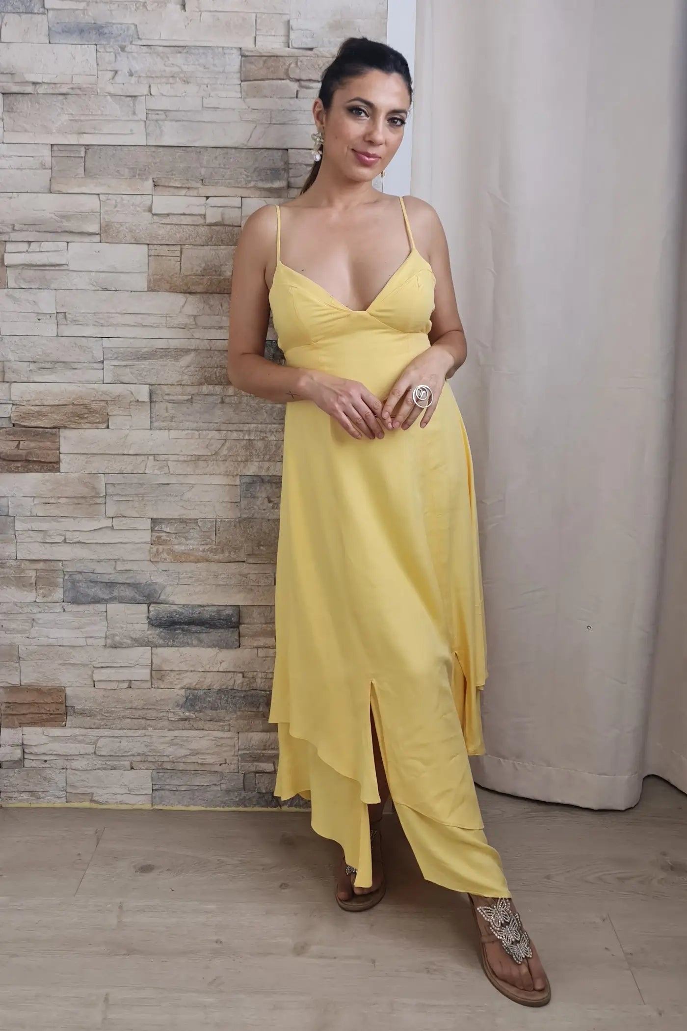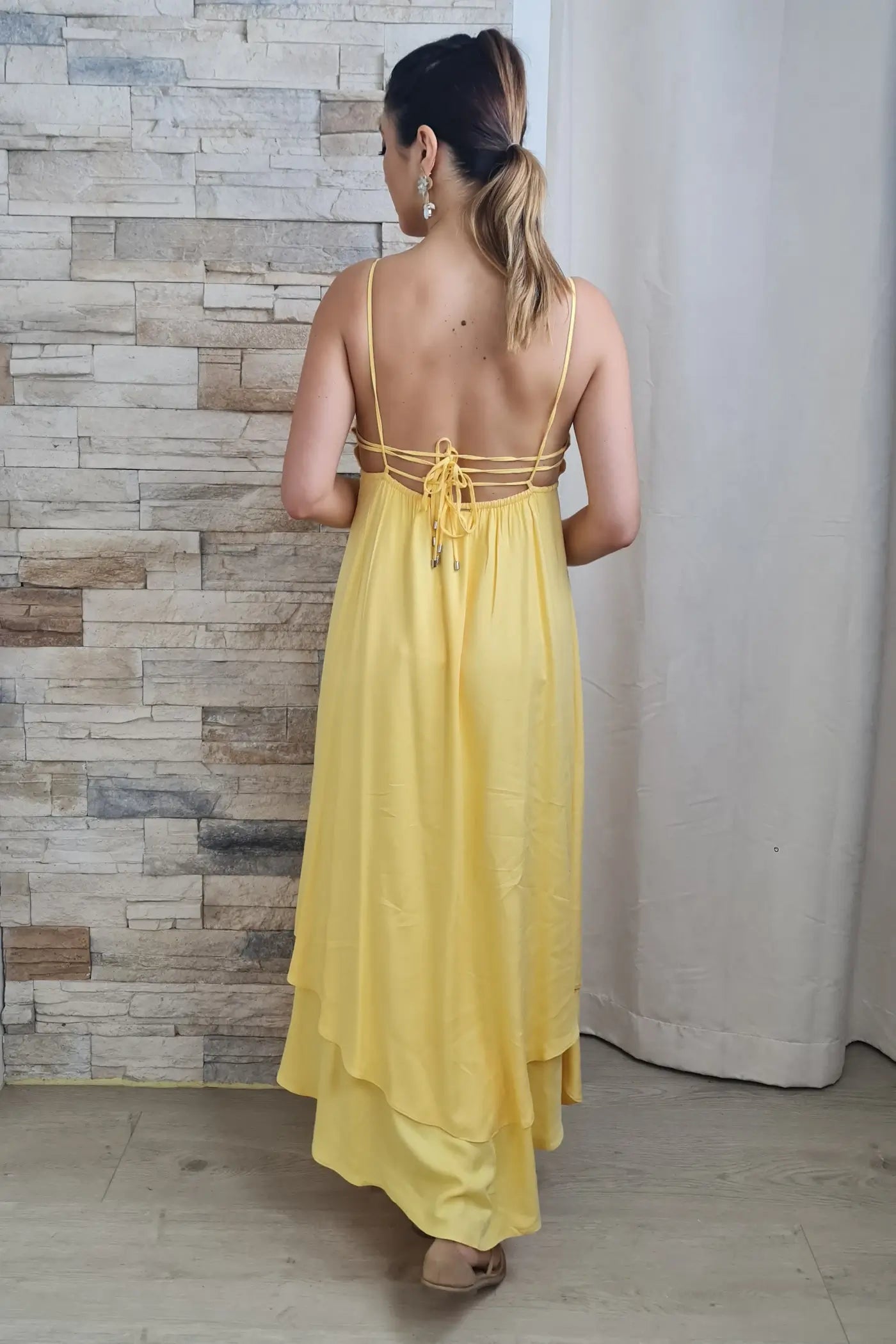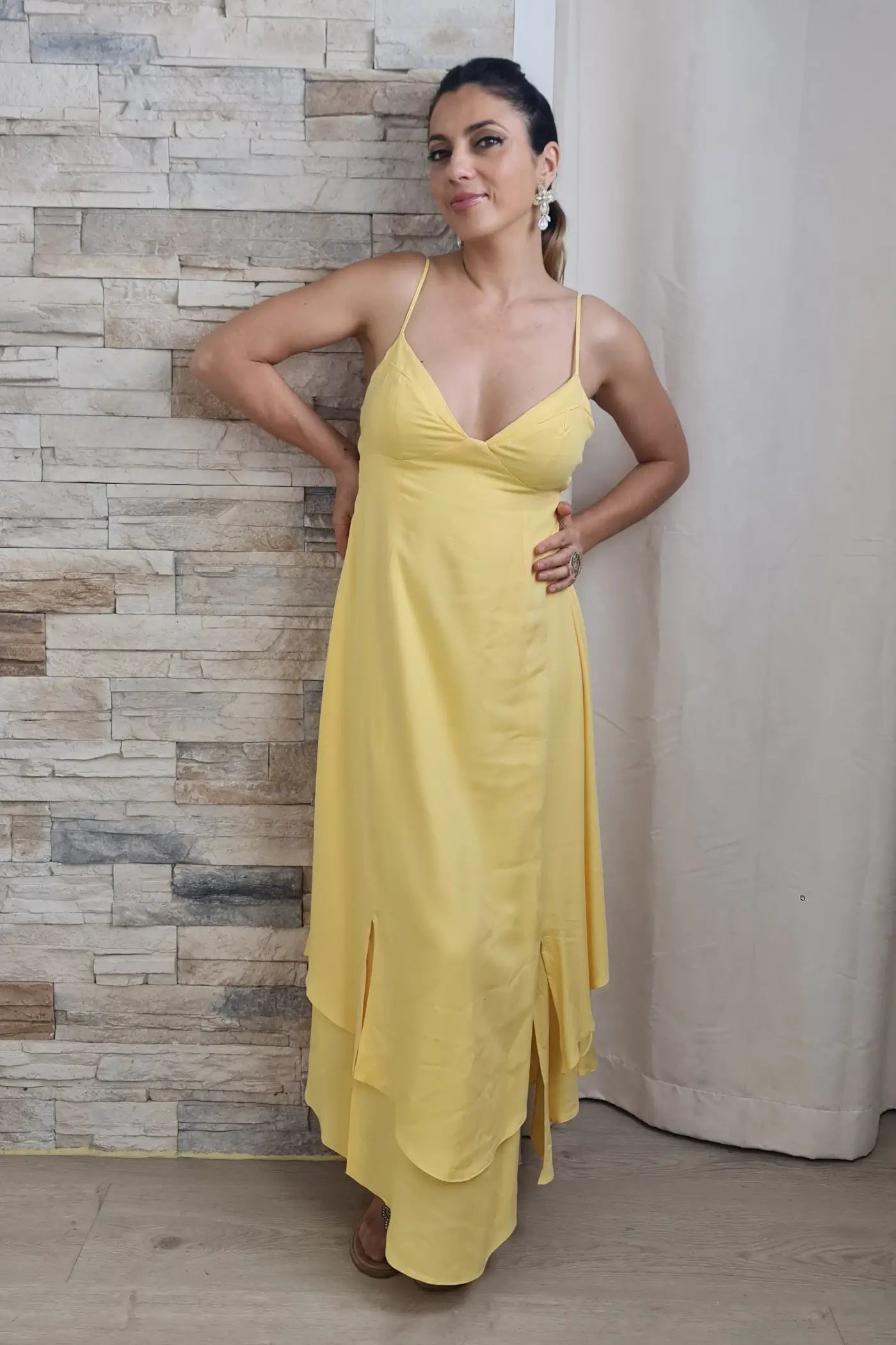 O design é casual e vibrante. Com decote em V e alças finas, destaca-se pela cor amarela intensa e viva, que remete ao sol e à alegria. As camadas assimétricas na saia adicionam movimento e um toque moderno à peça.