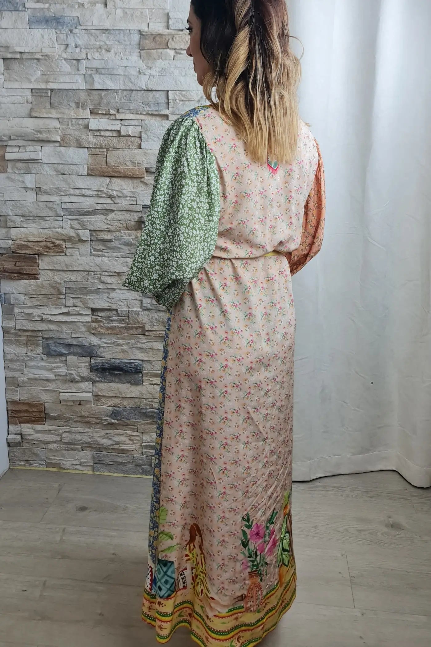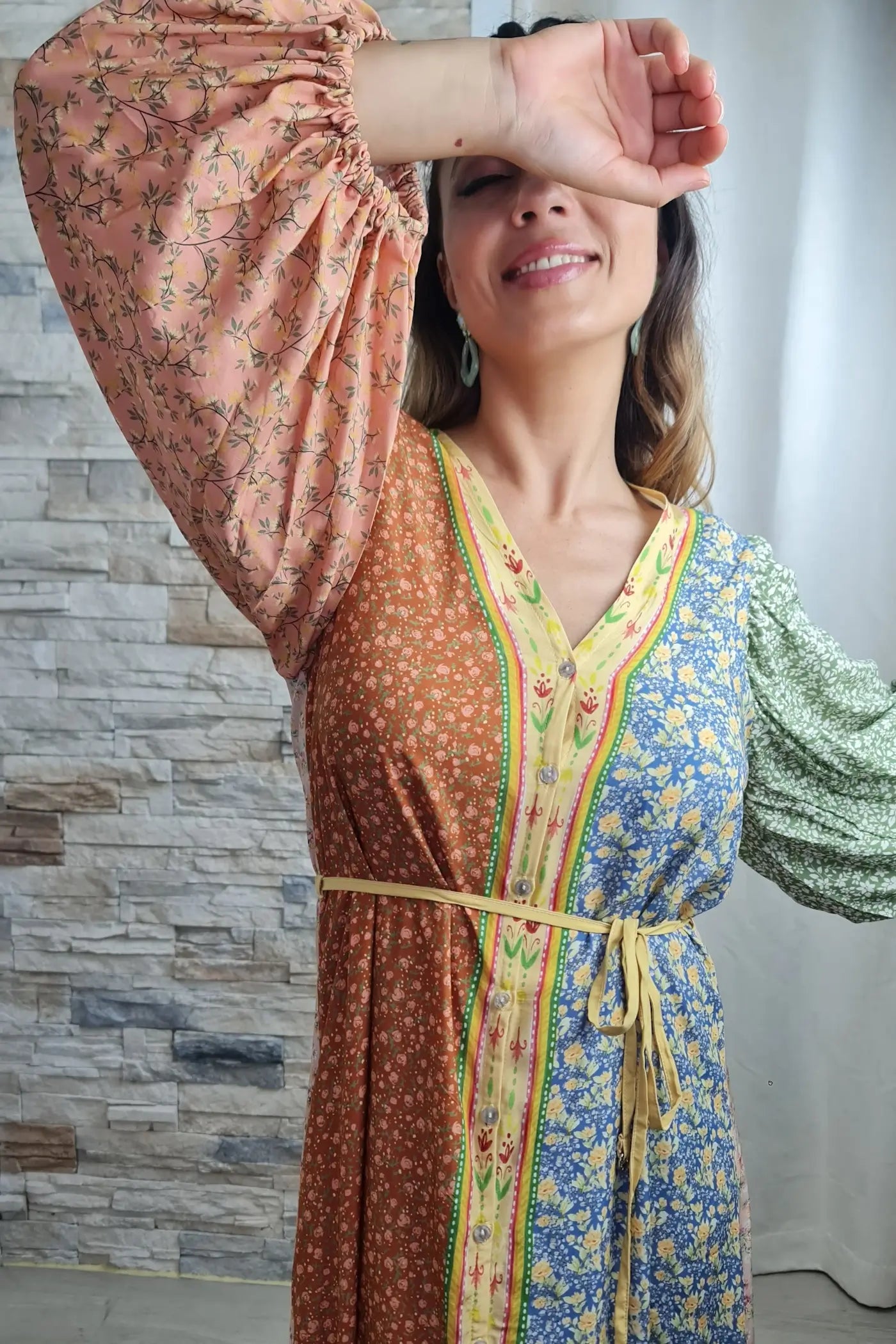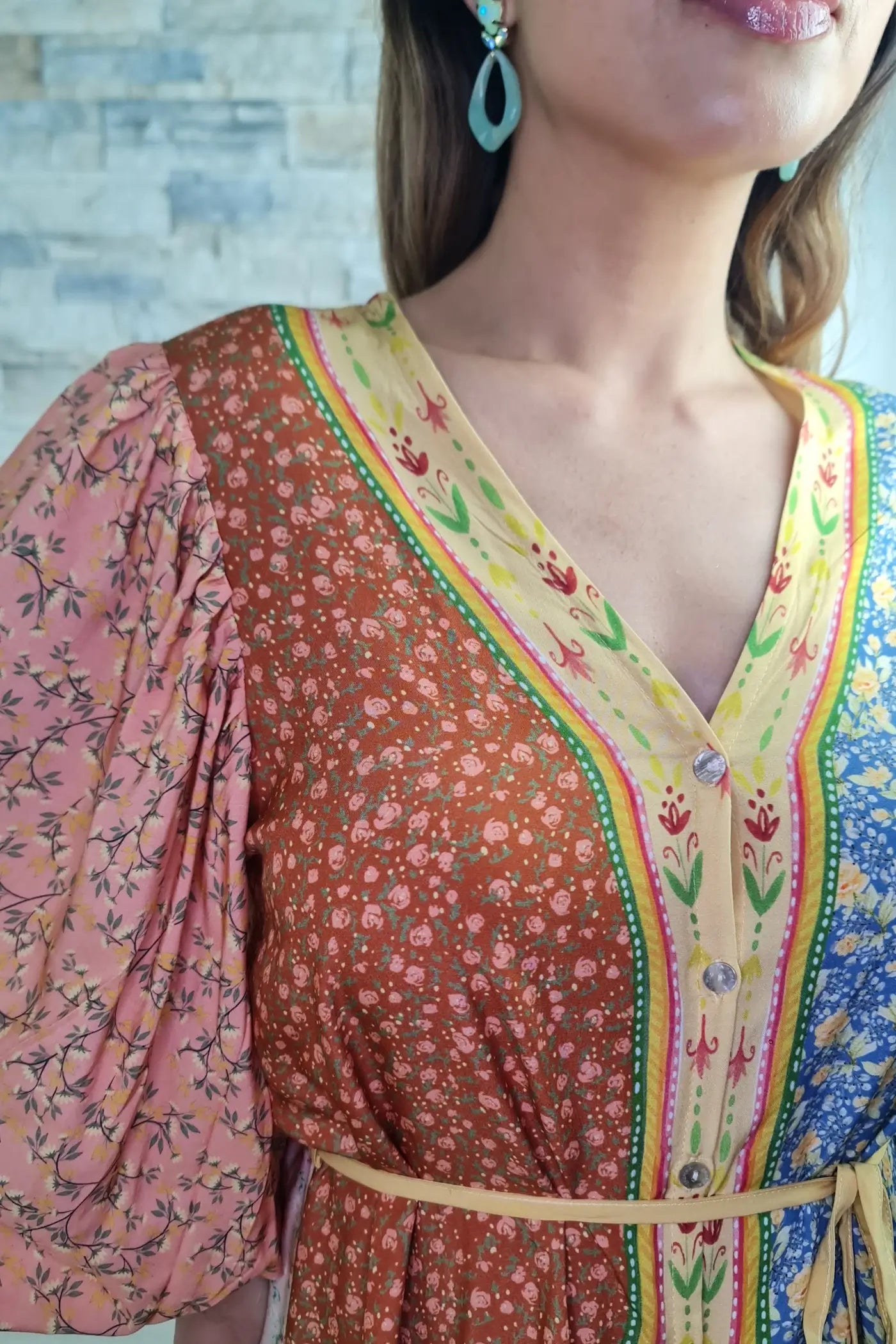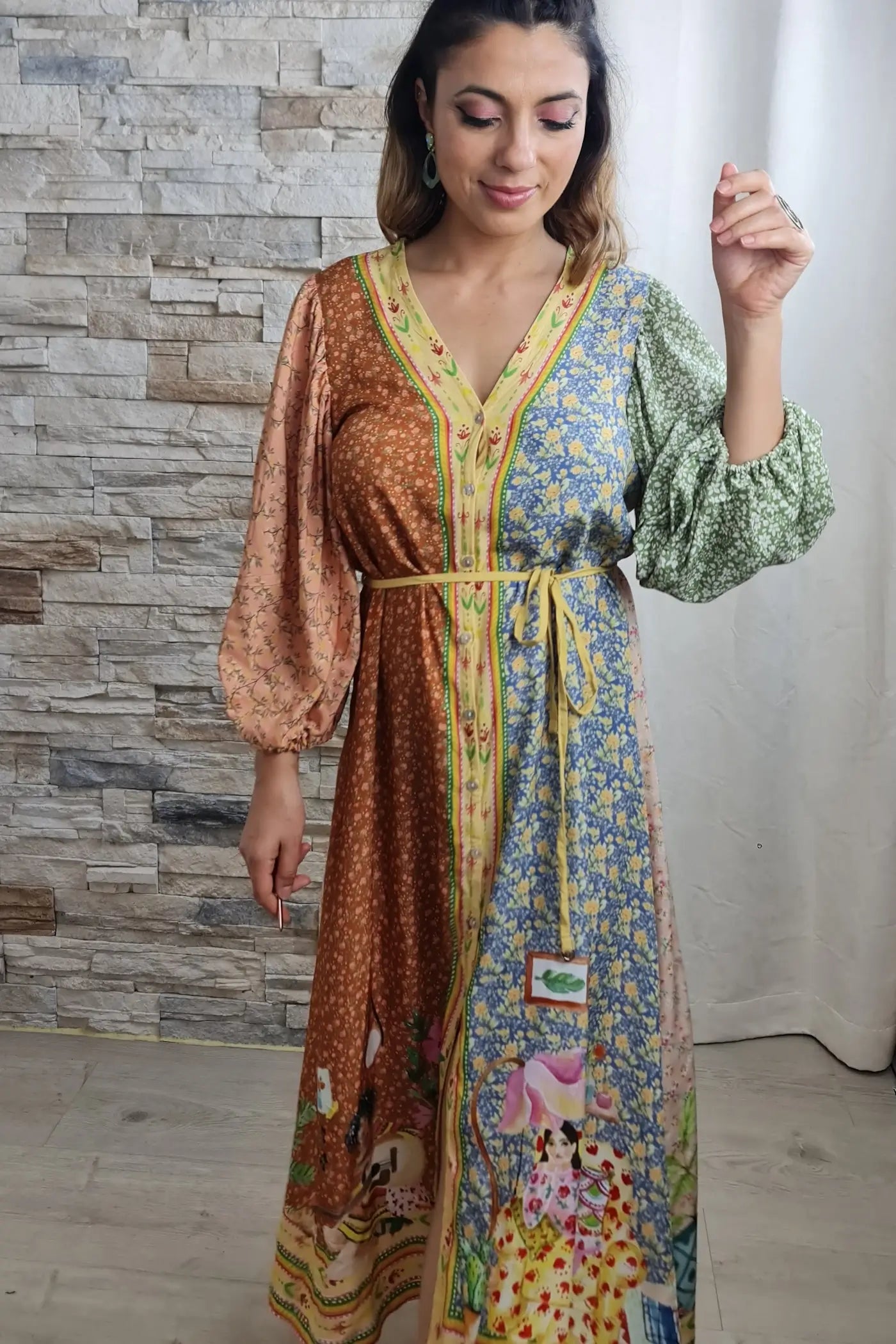 O design é uma fusão de camiseiro e boémio. Com decote em V e mangas compridas bufantes, destaca-se pelo padrão estampado em blocos de cor e diferentes motivos, que combinam tons de castanho, azul, verde, rosa e amarelo, criando um visual rico e diversificado. Possui um cinto fino que realça a cintura e adiciona um toque final.