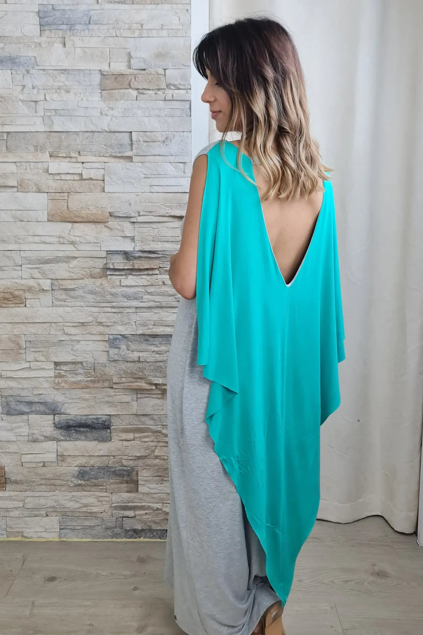 O design é uma fusão de elegância e funcionalidade. Com corte longo e reto, decote redondo e cavas ligeiramente mais profundas, destaca-se pela inovadora capa estilo "asas de anjo" em tom contrastante (verde-água), que adiciona movimento e originalidade. Confeccionado em malha macia e de alta qualidade, garante caimento perfeito e conforto duradouro.