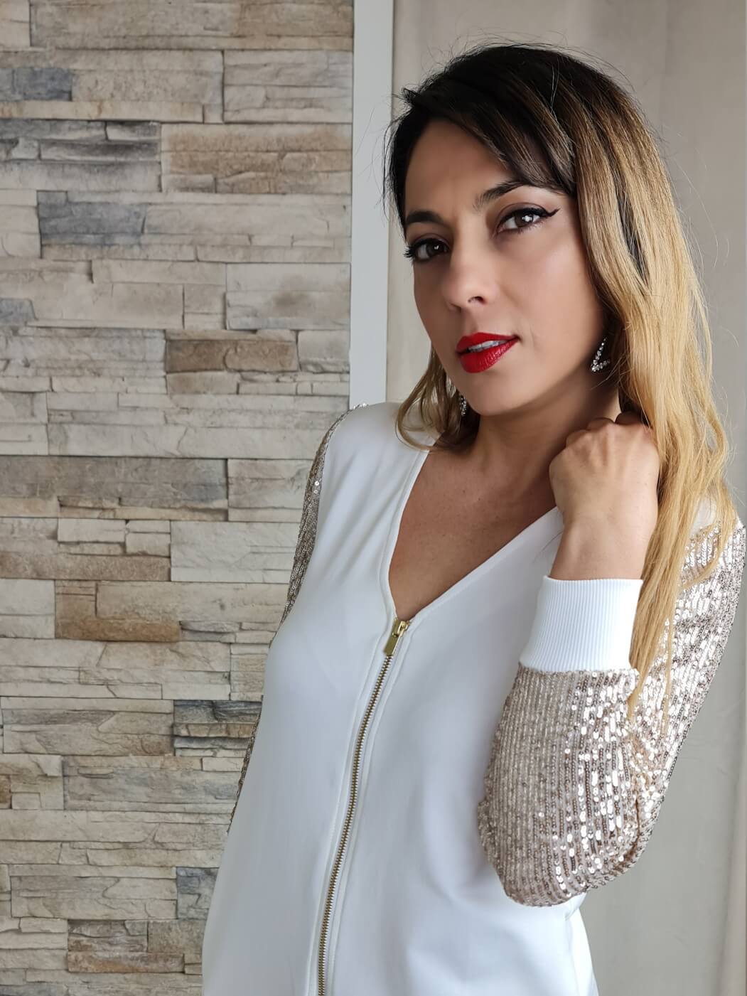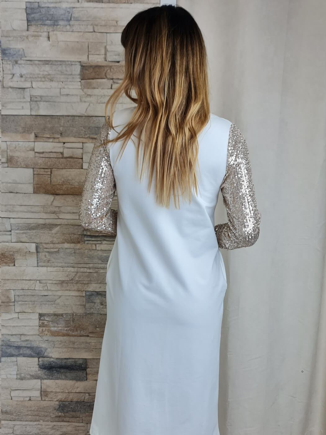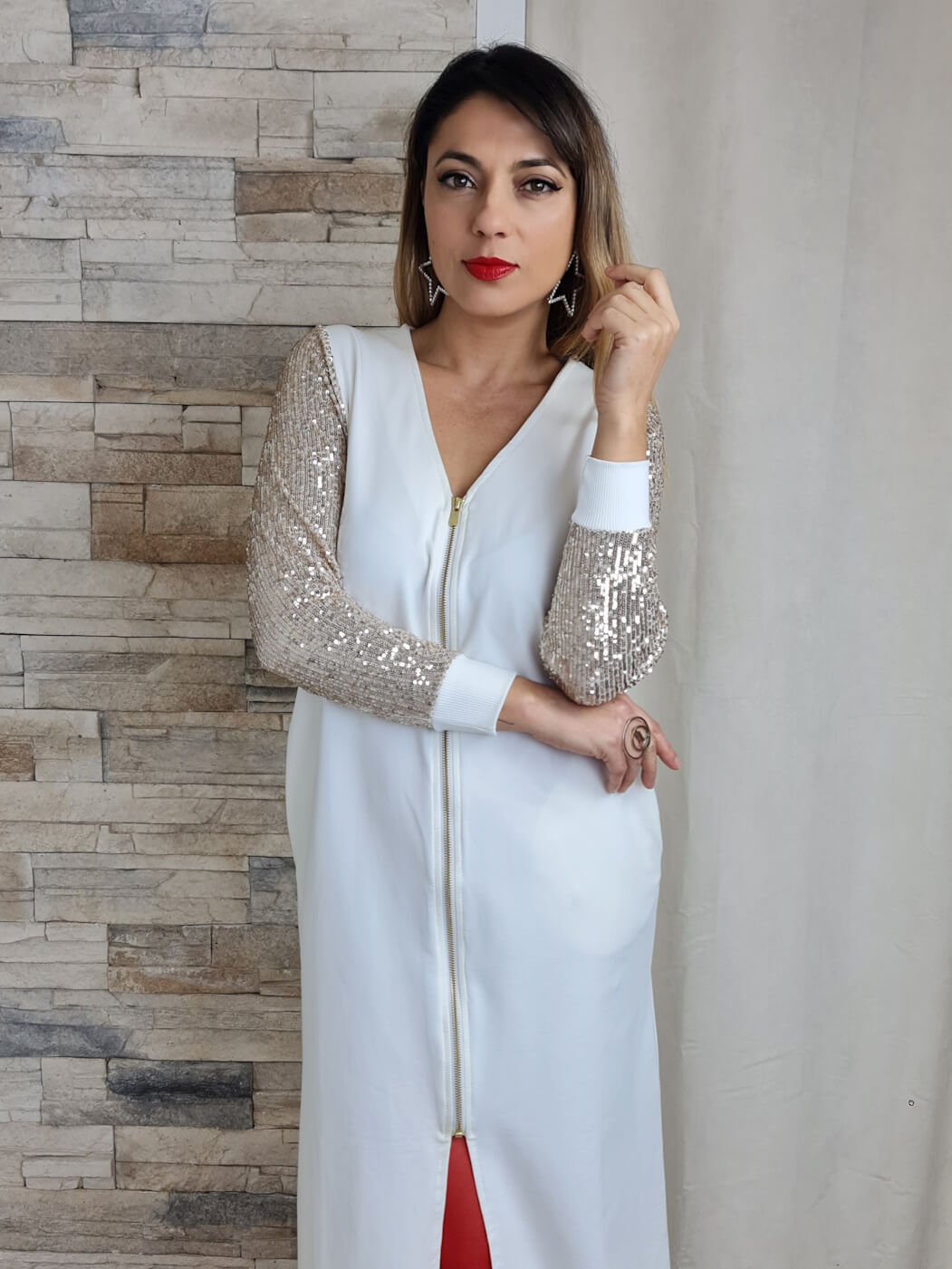O vestido-casaco exibido é uma peça moderna e versátil, ideal para looks estilosos e marcantes. O design apresenta um corte reto com fecho éclair frontal e mangas compridas em tecido com lantejoulas douradas, que conferem um toque glamoroso e festivo ao look. Os bolsos laterais adicionam um toque funcional à peça.