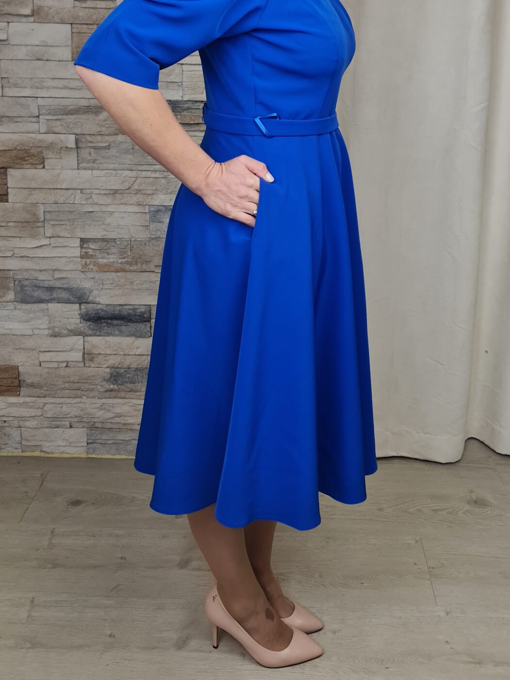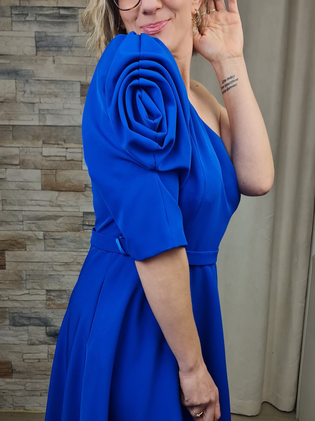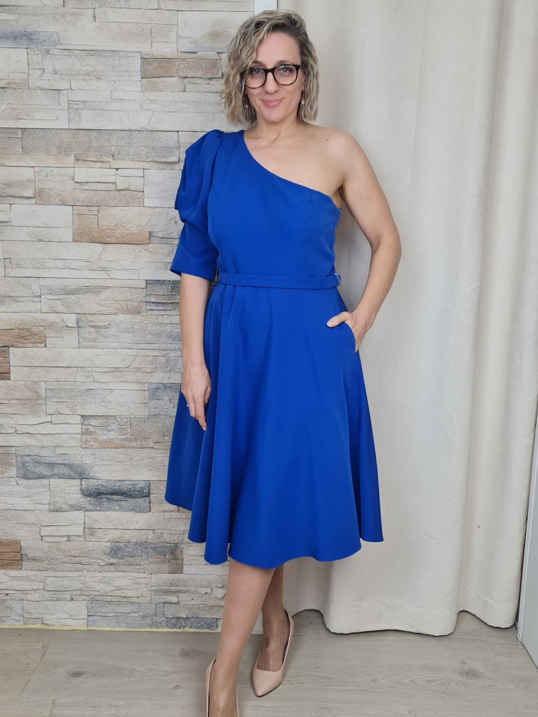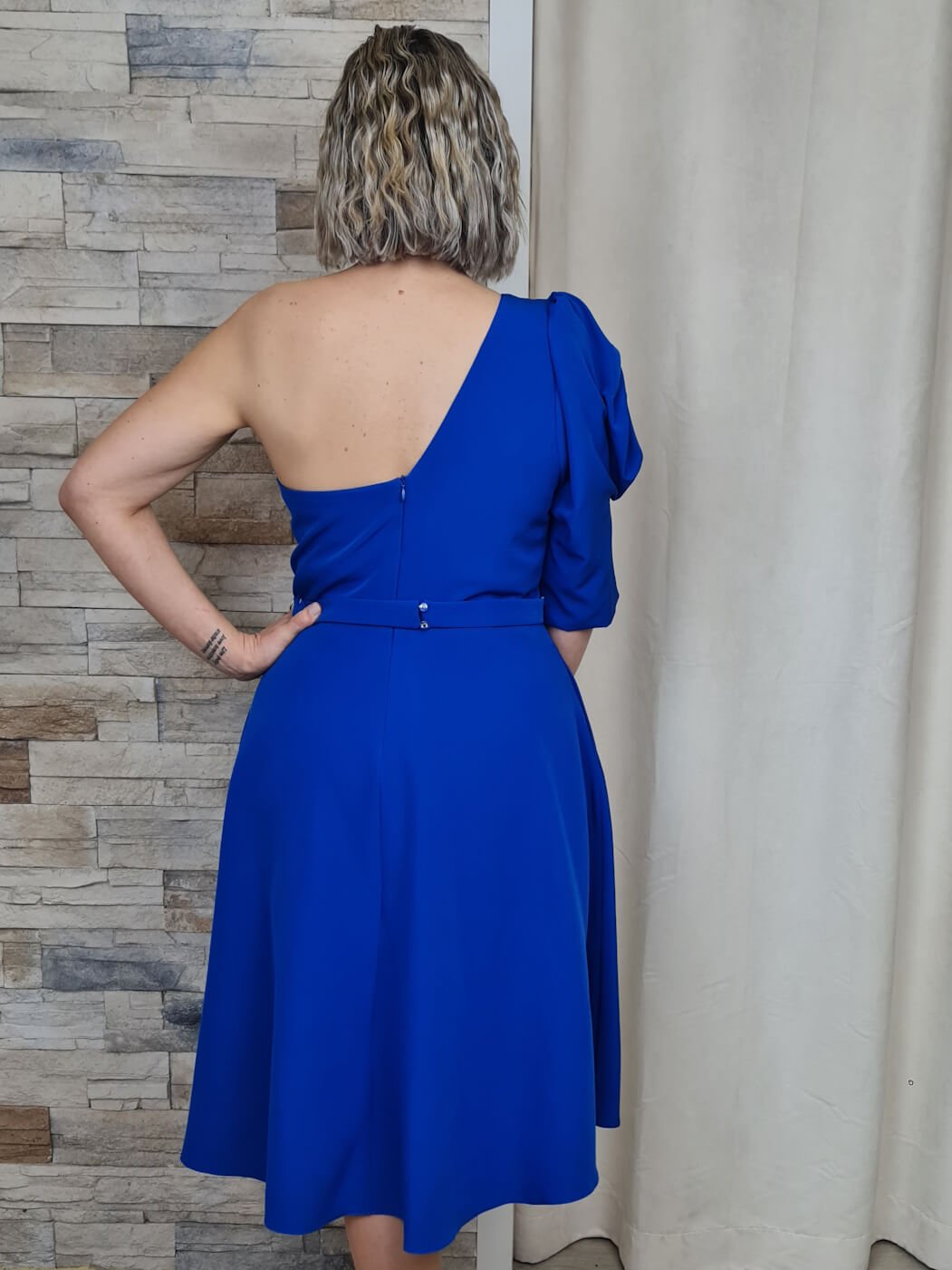 Este vestido azul royal é uma peça moderna e elegante, ideal para eventos especiais. O design assimétrico, com um ombro só e uma manga volumosa, adiciona um toque dramático e sofisticado. O tecido estruturado e o comprimento midi criam uma silhueta feminina e elegante, enquanto a faixa na cintura define a forma.