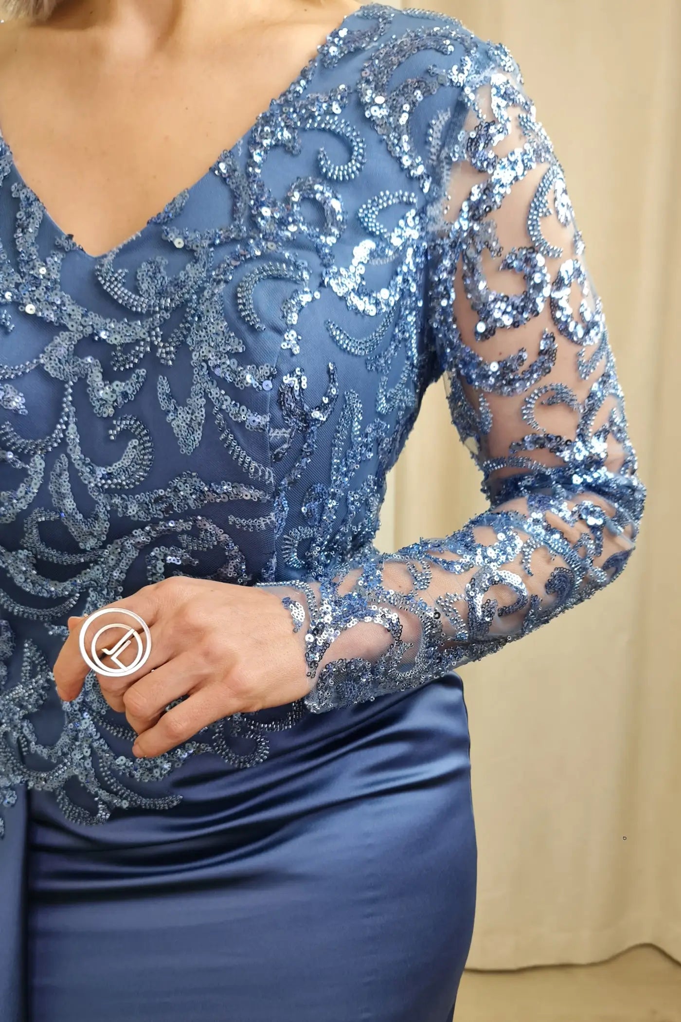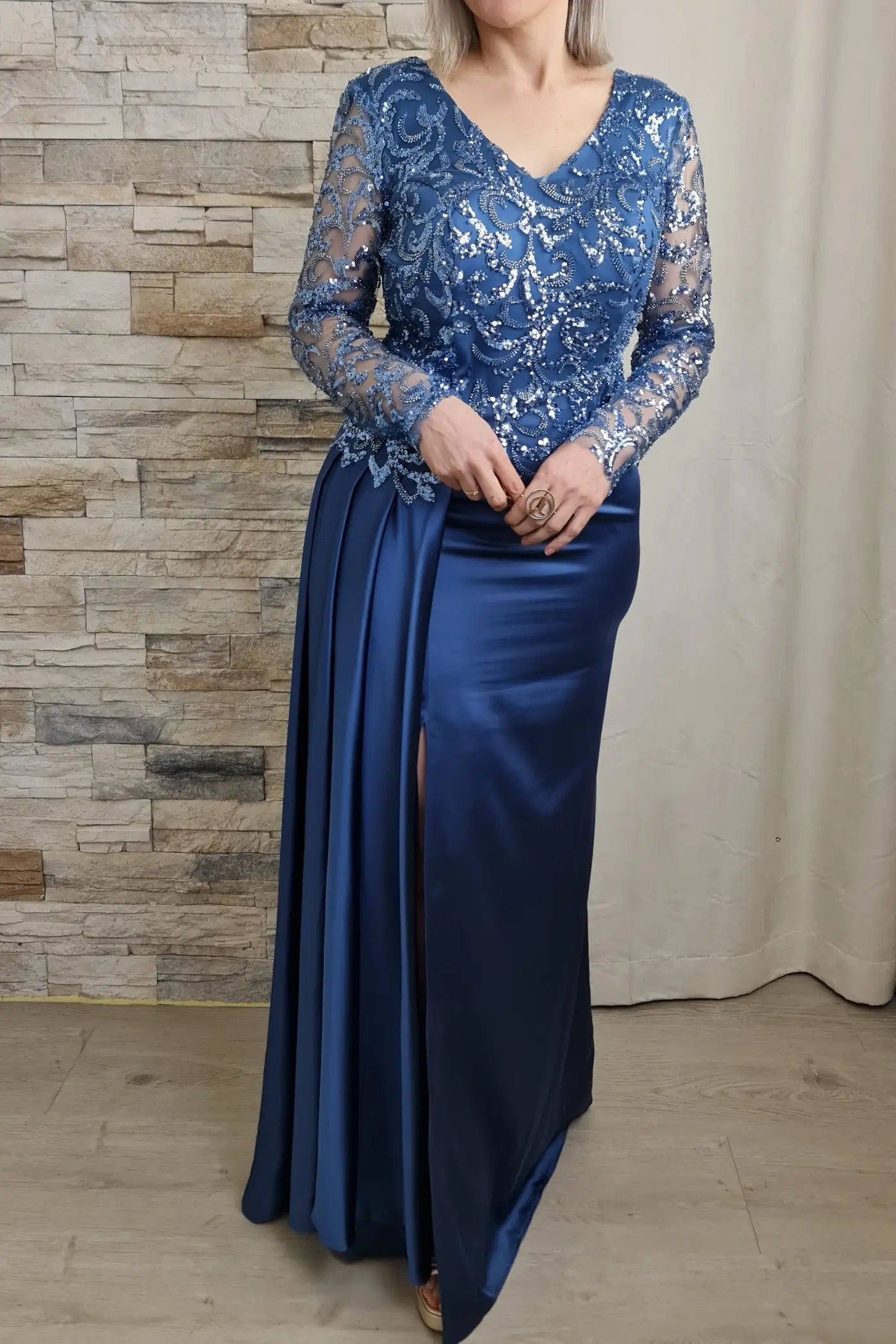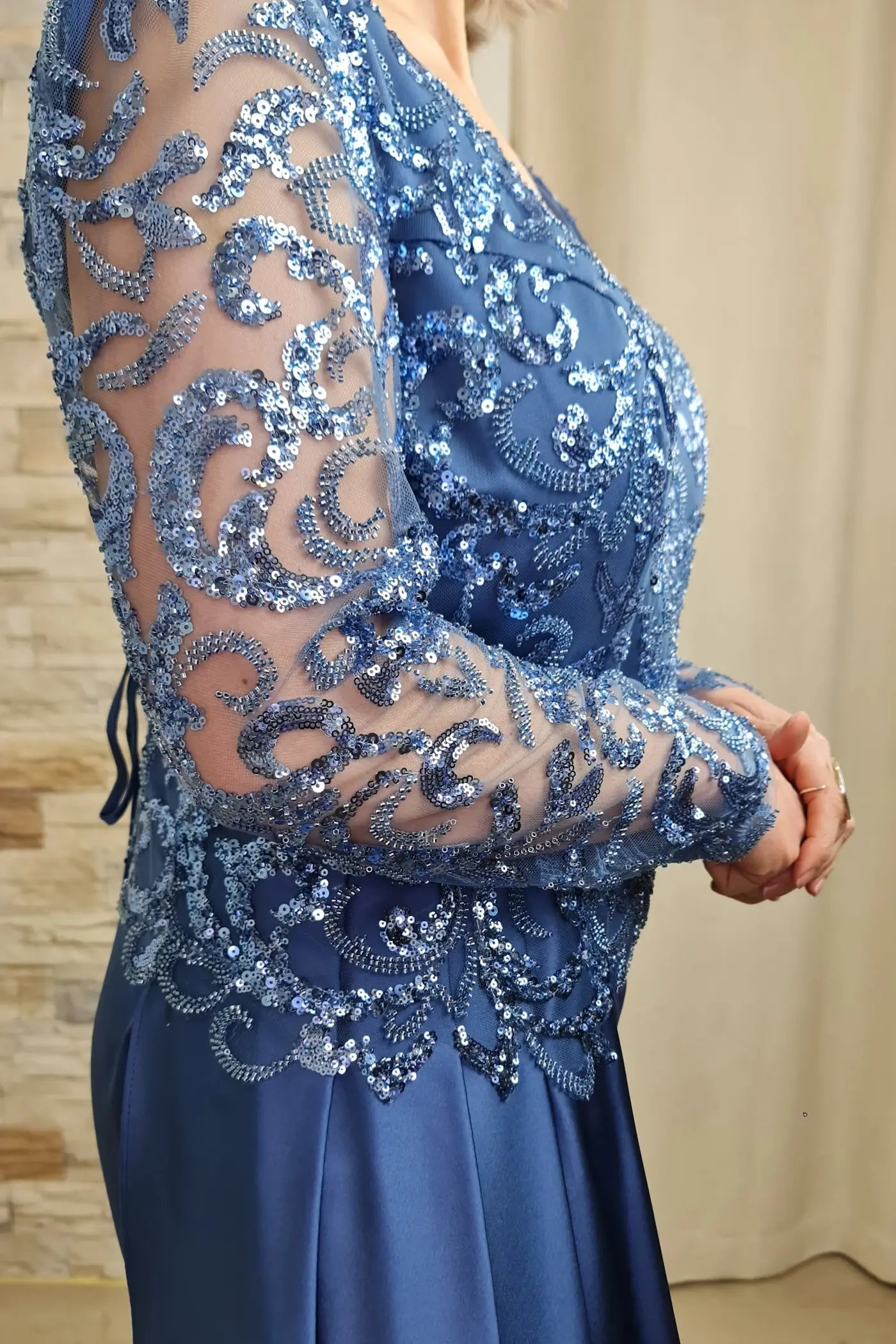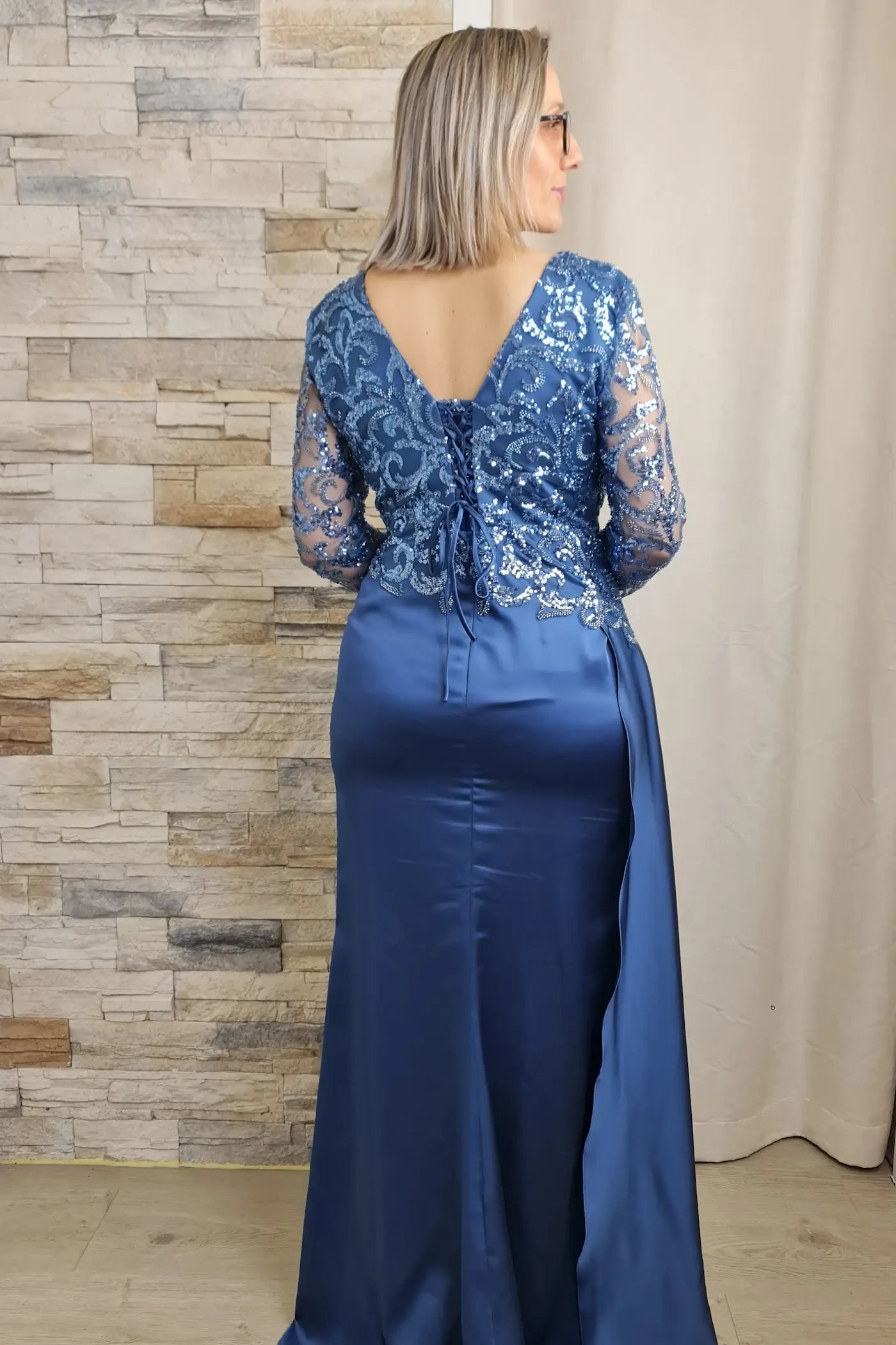 O vestido azul petróleo é uma peça elegante e sofisticada, ideal para eventos especiais. O design apresenta um efeito corpete com detalhes em renda floral e aplicações de brilho, adicionando um toque romântico e luxuoso. As mangas compridas em renda transparente criam um efeito visual interessante e sensual.