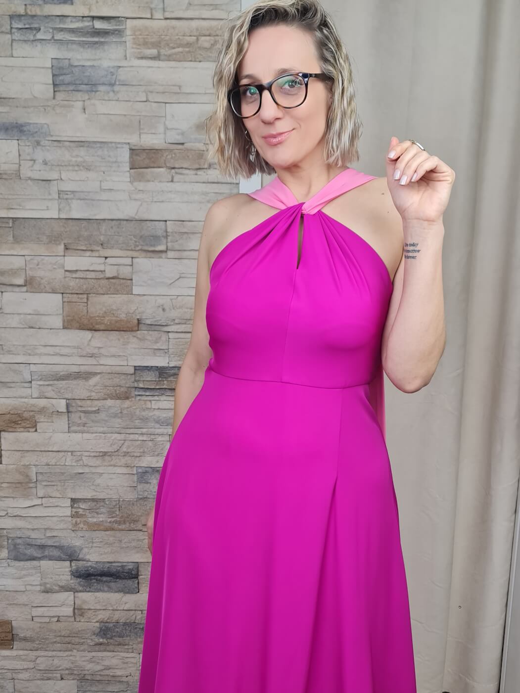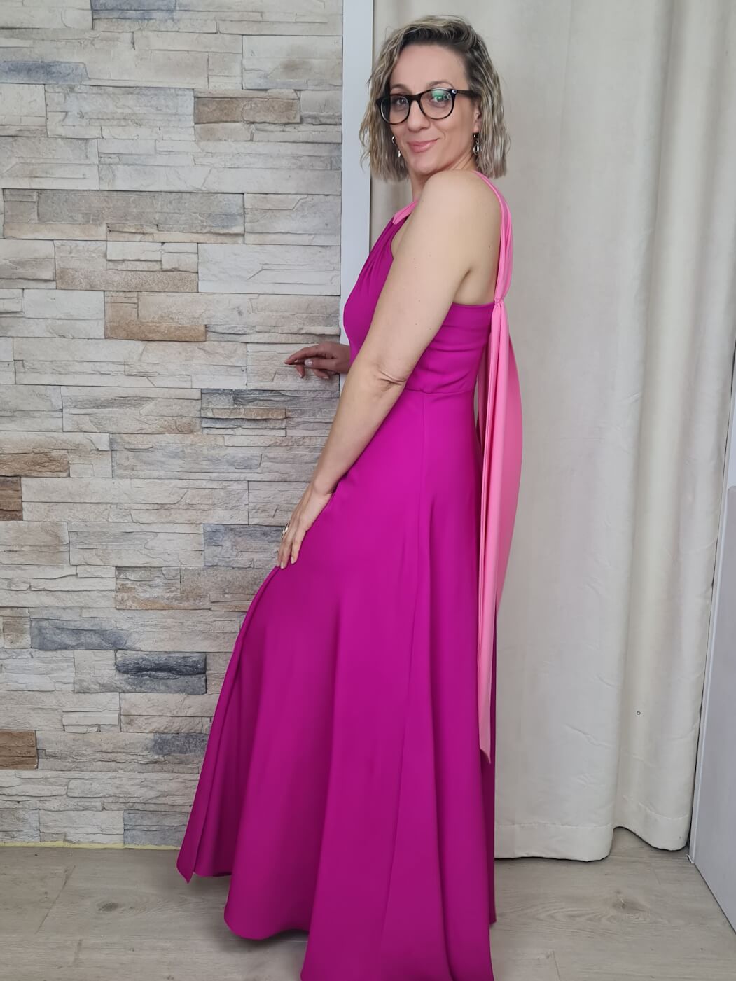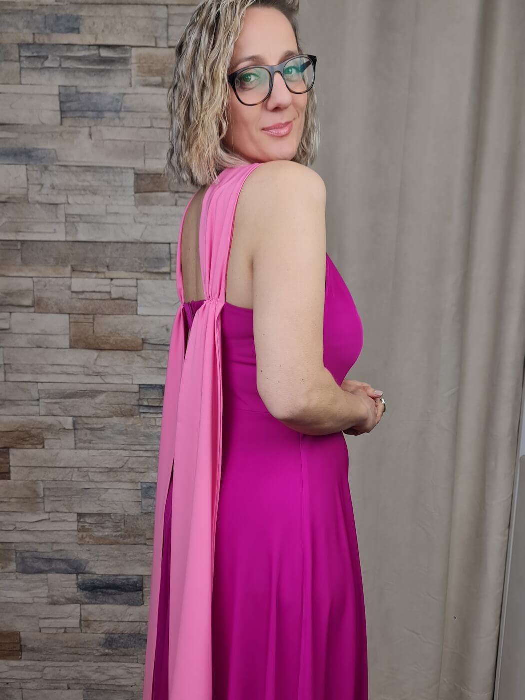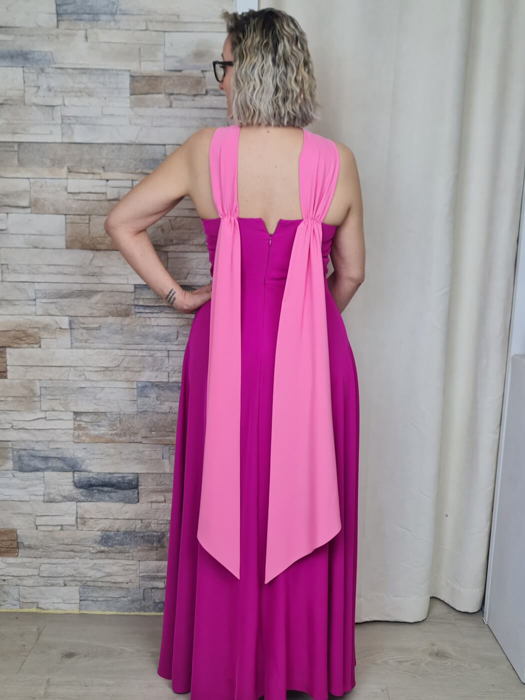 O vestido rosa é uma peça vibrante e sofisticada, ideal para eventos especiais. O design apresenta um decote halter com detalhes de tecido franzido, que adiciona um toque dramático e elegante. O tecido fluido e o comprimento longo criam uma silhueta esguia e elegante, enquanto a fenda lateral adiciona um toque de ousadia e sensualidade.