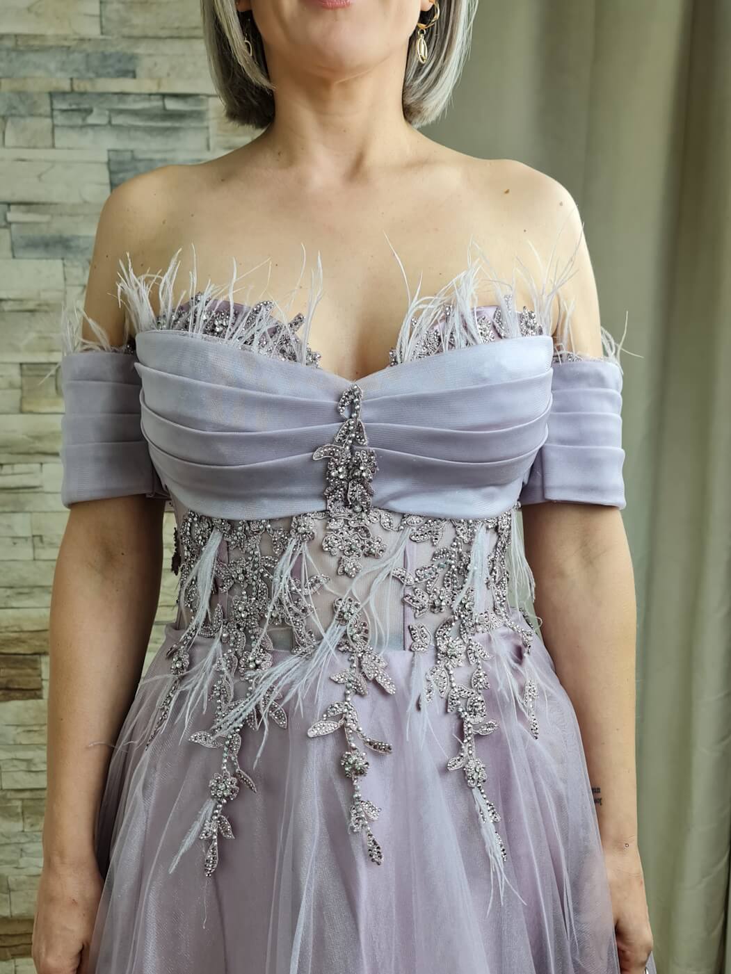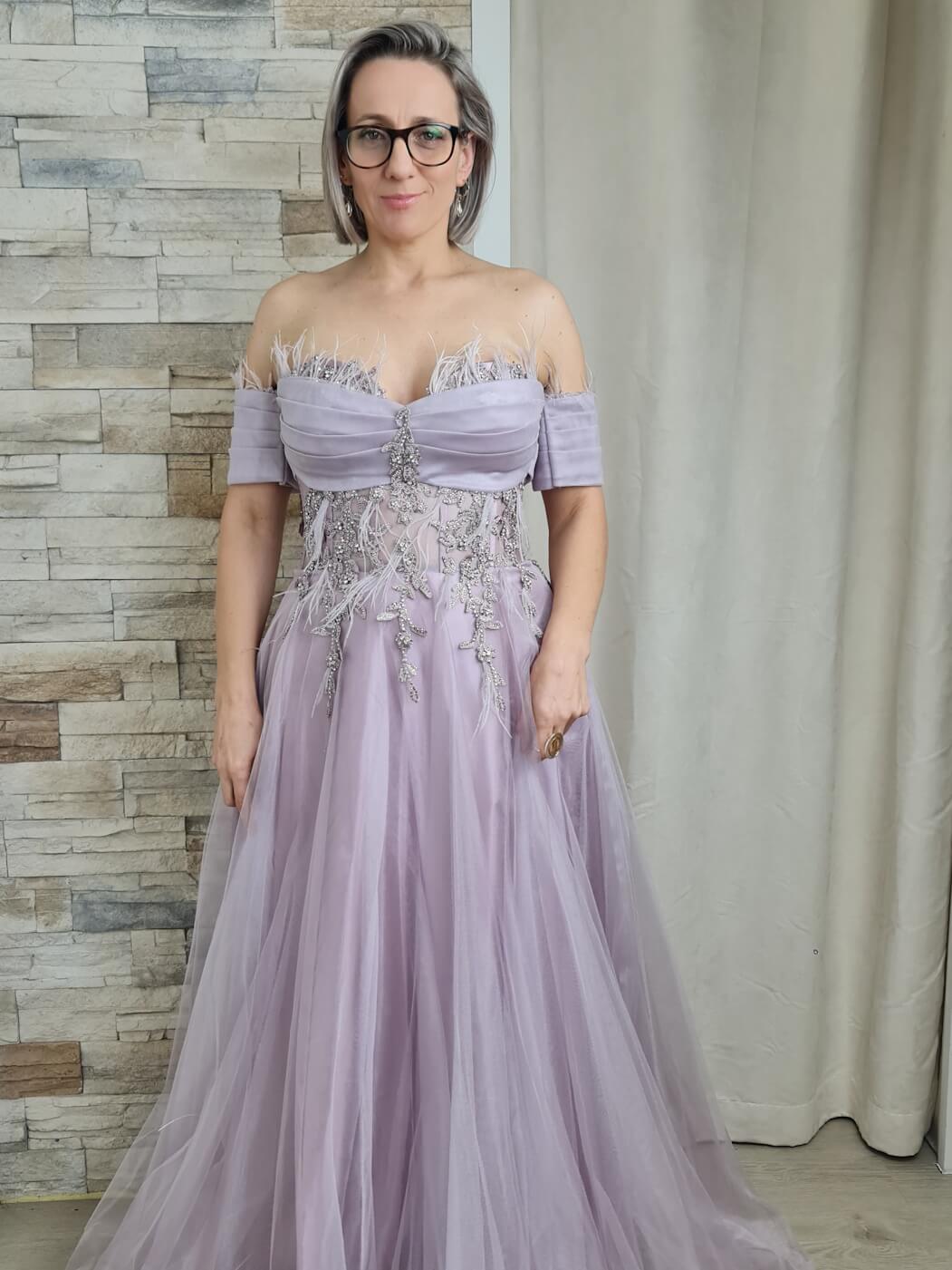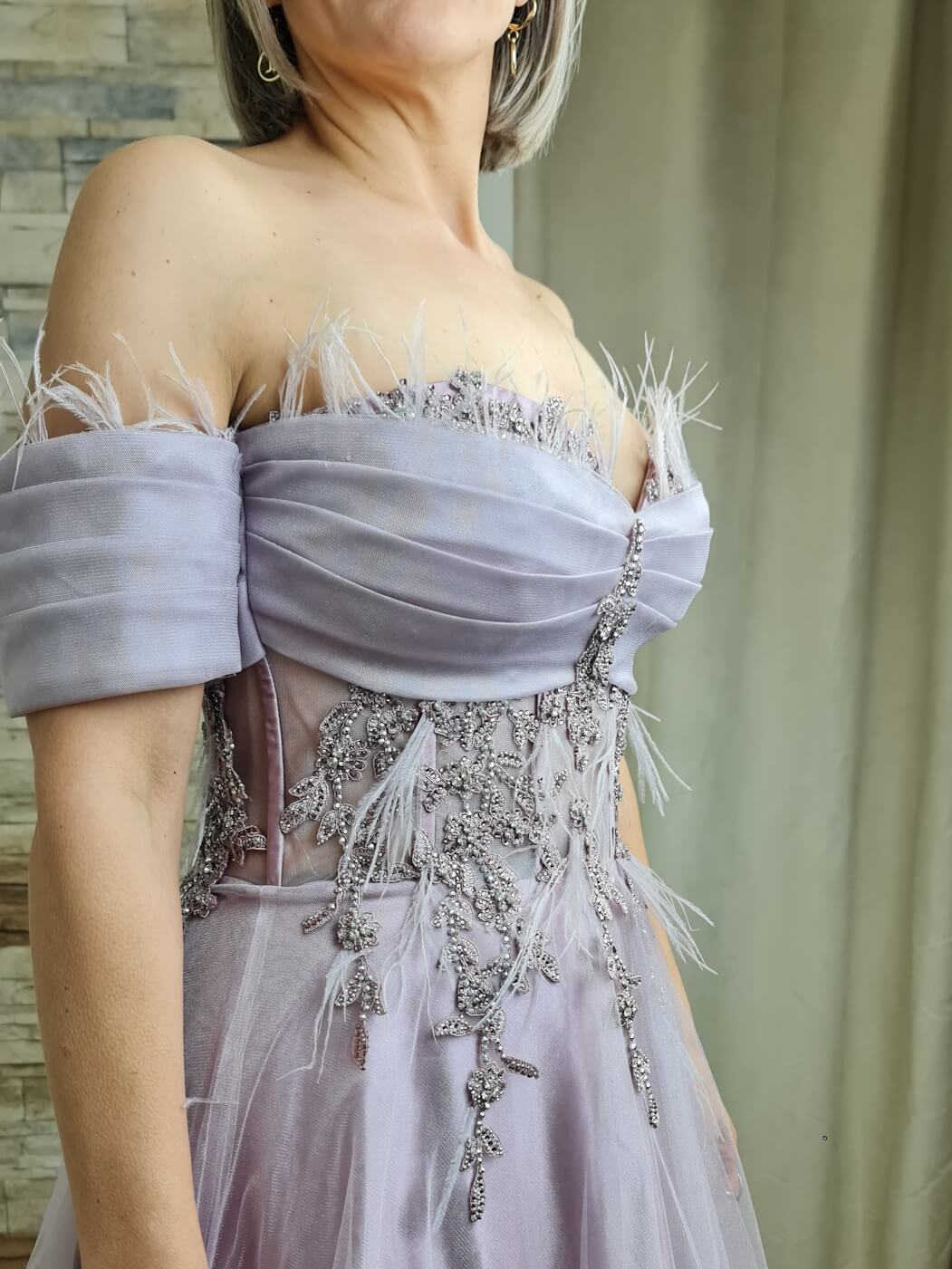 O vestido lilás é uma peça romântica e elegante, ideal para eventos especiais. O design apresenta um corpete tomara que caia com detalhes de renda floral e aplicações de brilho, adicionando um toque sofisticado e delicado. A saia longa e fluida em tule, com um leve brilho, cria um efeito visual etéreo e glamoroso.