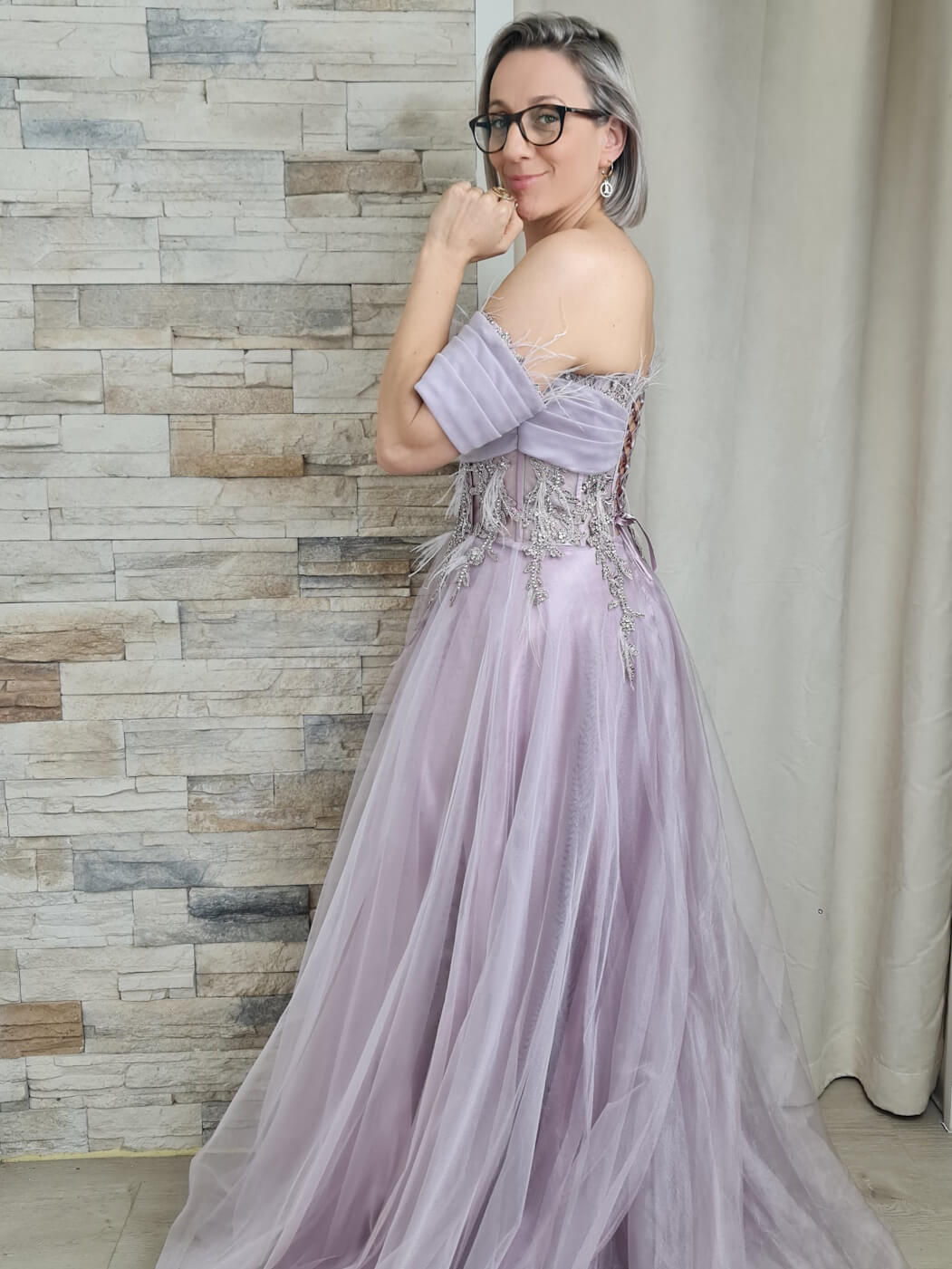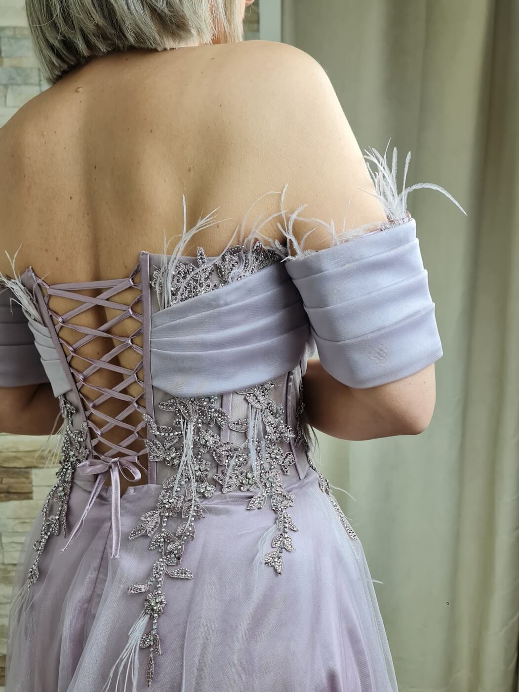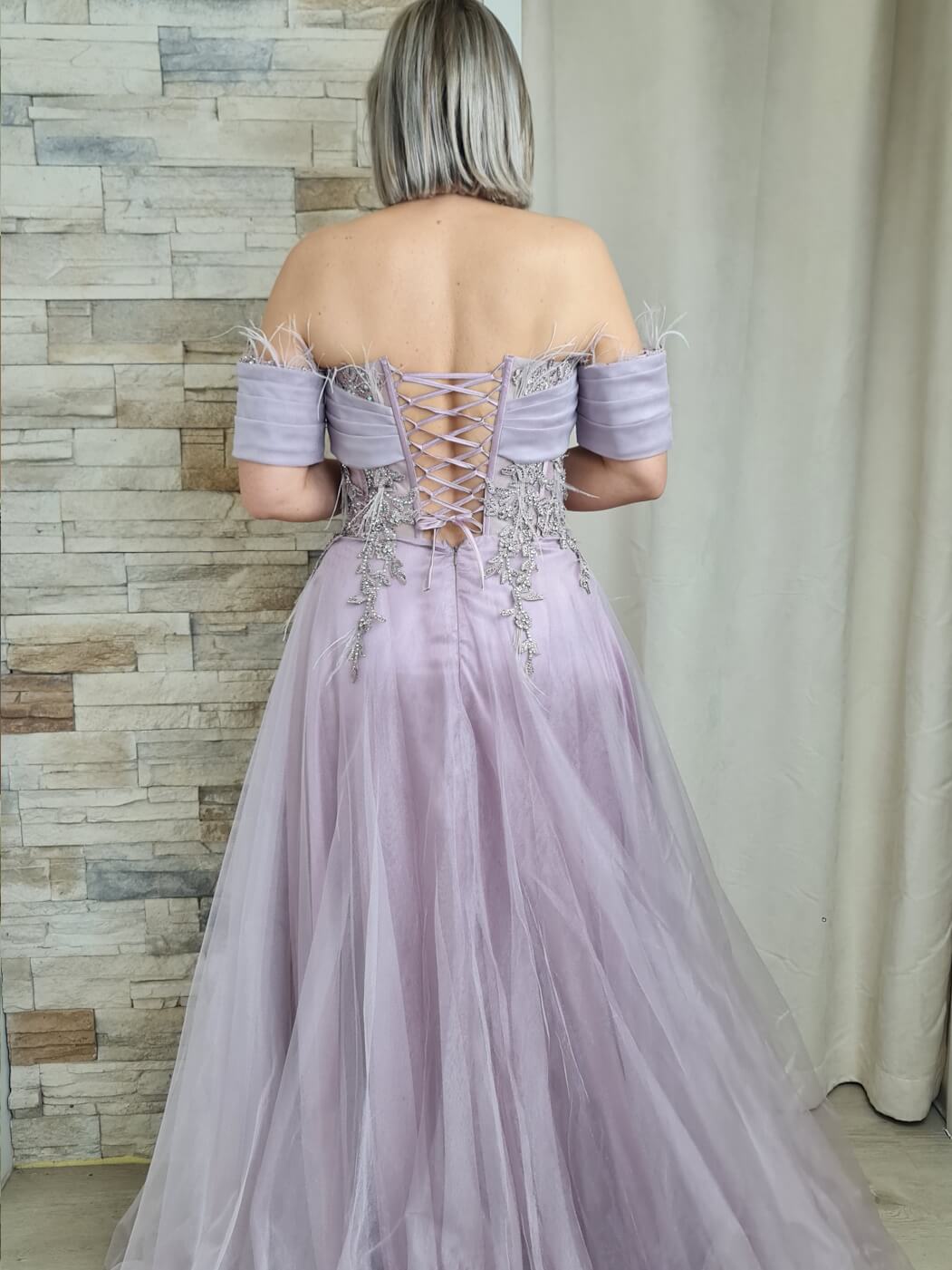 O vestido lilás é uma peça romântica e elegante, ideal para eventos especiais. O design apresenta um corpete tomara que caia com detalhes de renda floral e aplicações de brilho, adicionando um toque sofisticado e delicado. A saia longa e fluida em tule, com um leve brilho, cria um efeito visual etéreo e glamoroso.