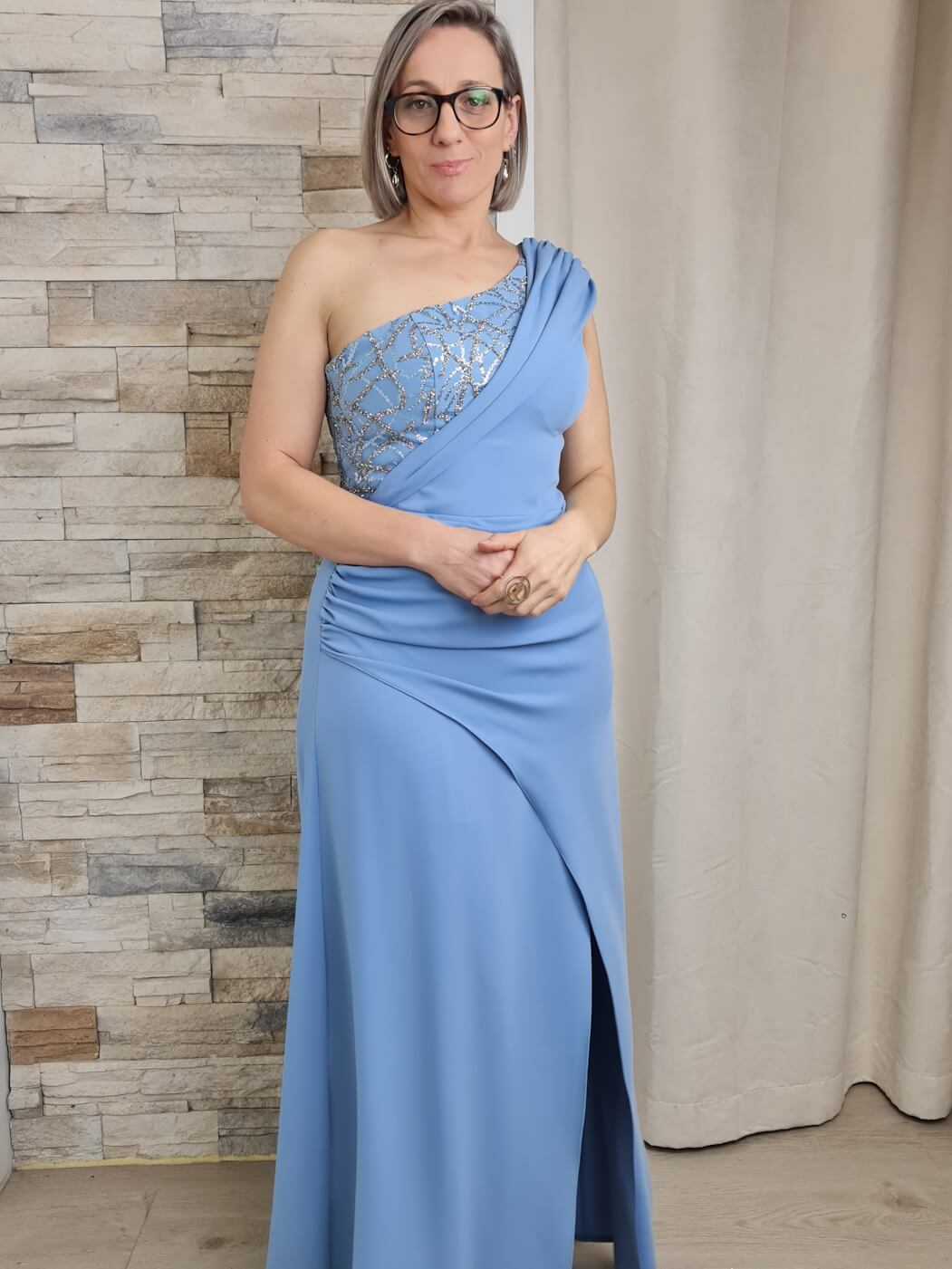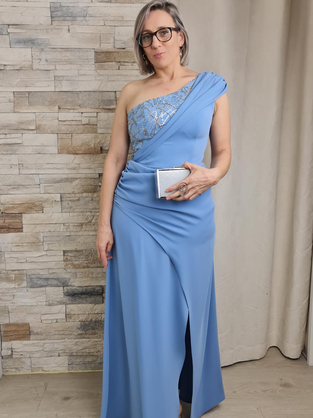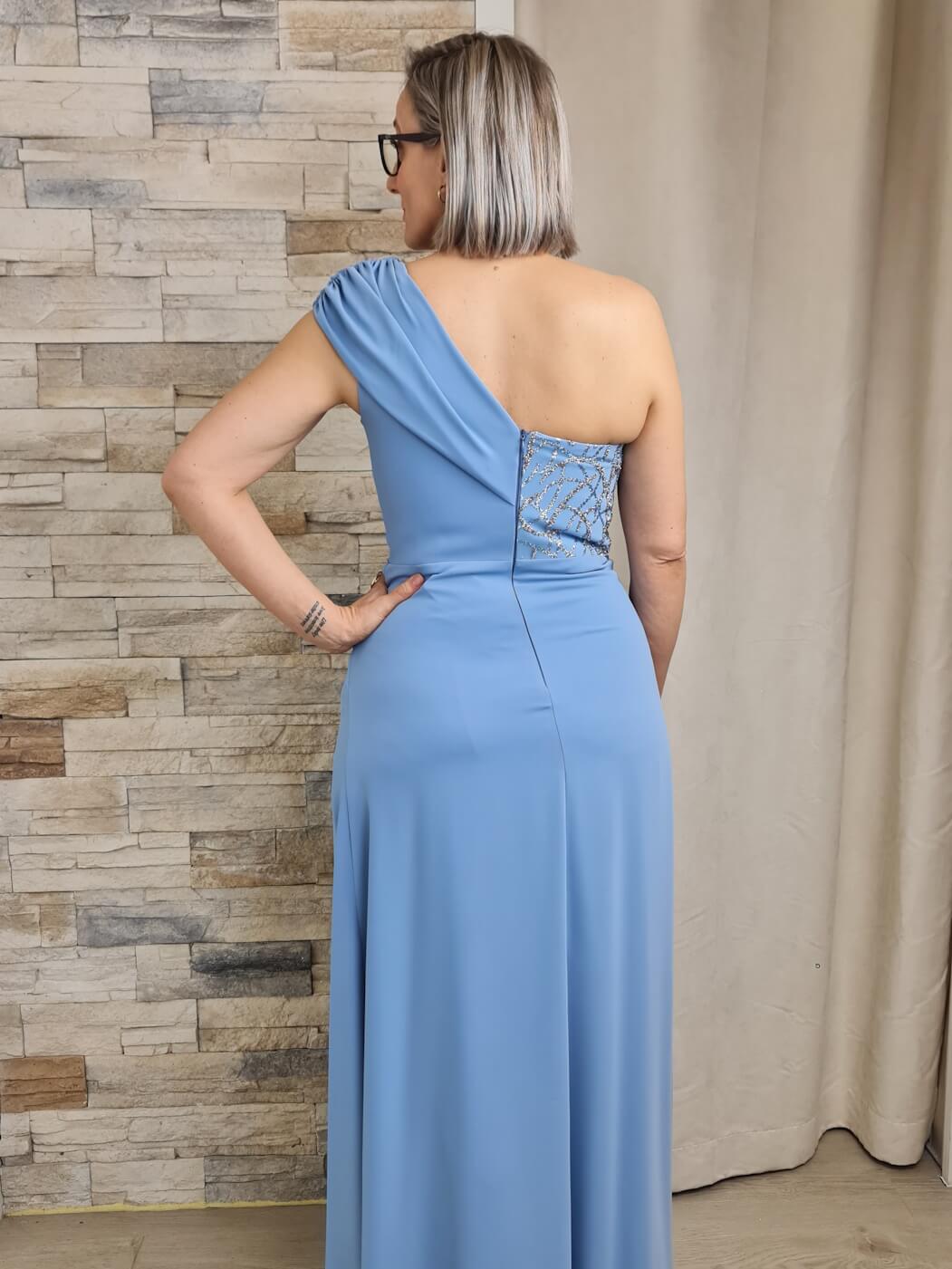O vestido azul claro é uma peça elegante e sofisticada, ideal para eventos especiais. O design apresenta um ombro só, com detalhes drapeados no corpete, que adicionam um toque dramático e romântico. O detalhe de renda floral com aplicações de brilho no ombro esquerdo cria um efeito visual interessante e luxuoso.