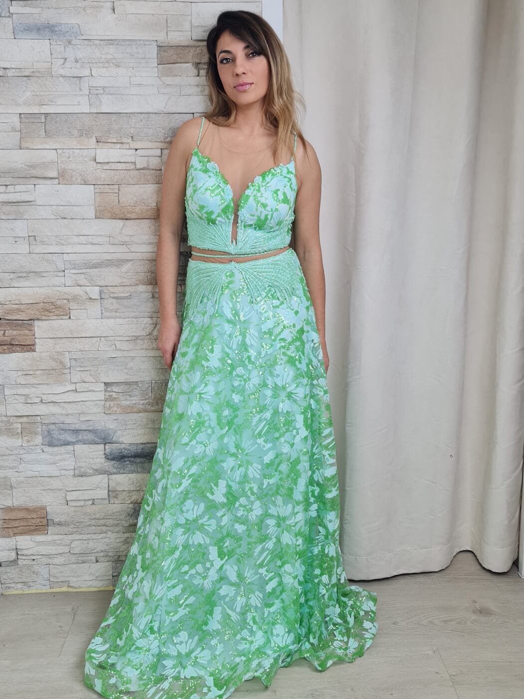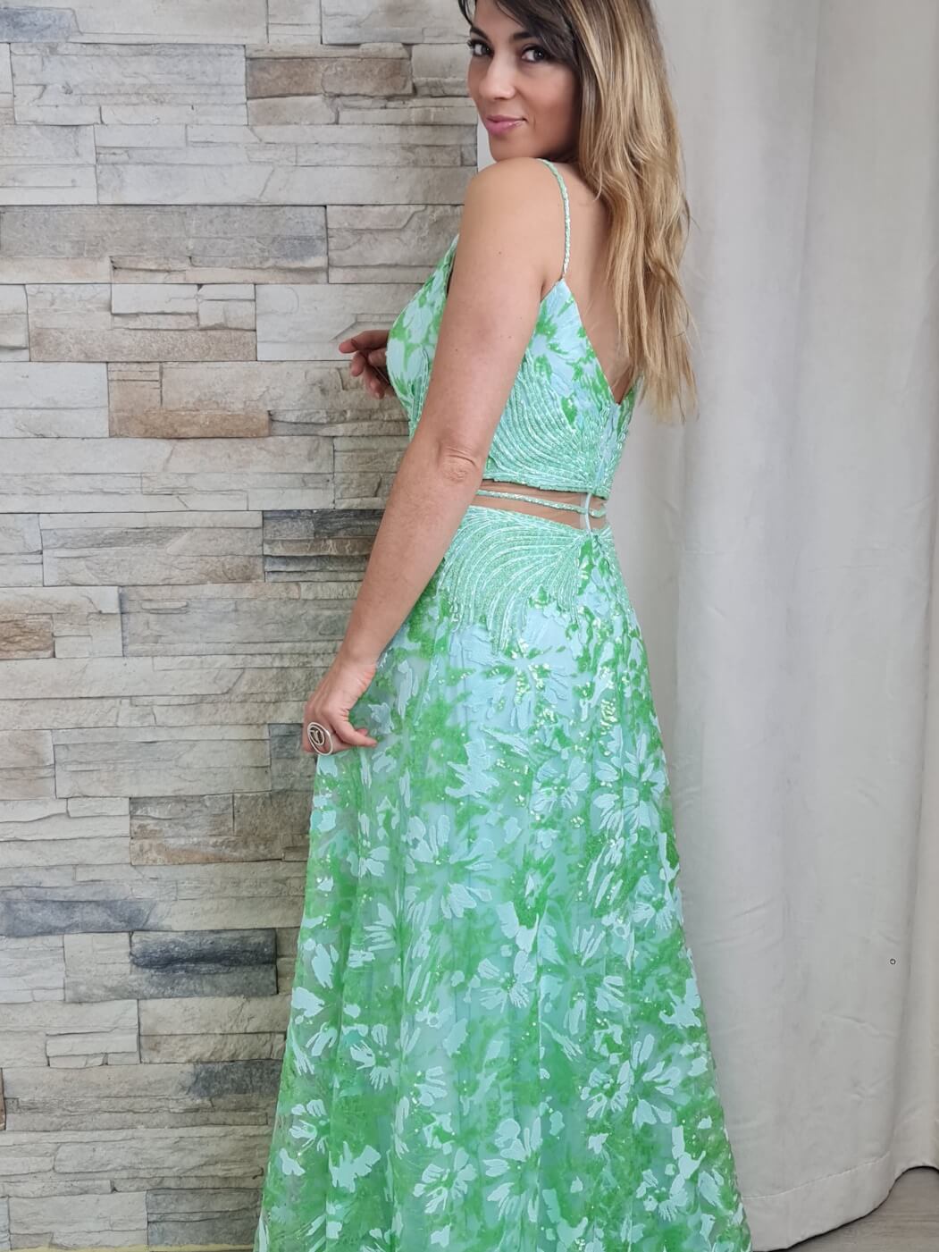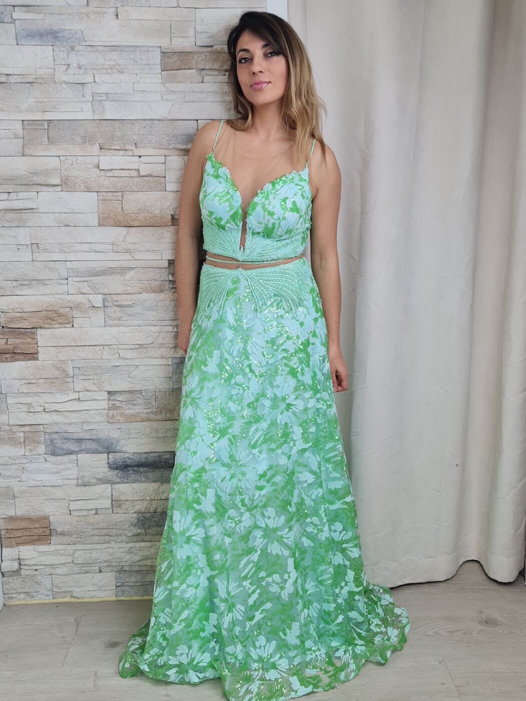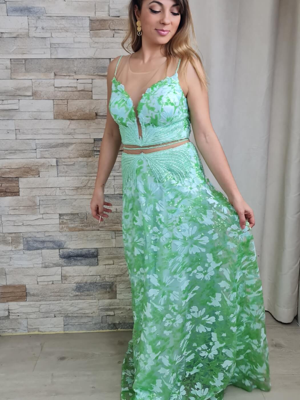 O vestido é uma peça longa e elegante, com um design em duas partes que cria a ilusão de um conjunto de top e saia. A parte superior do vestido apresenta um decote em V profundo com uma inserção de tecido transparente na parte central, subindo até às alças finas. O corpete é adornado com aplicações brilhantes e um padrão floral em tons de verde claro e verde mais vibrante.