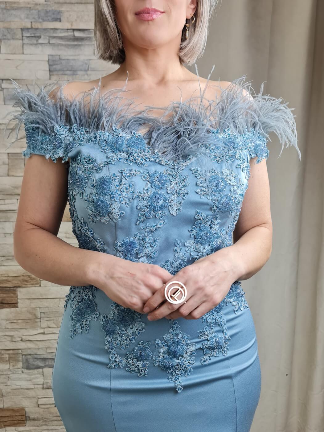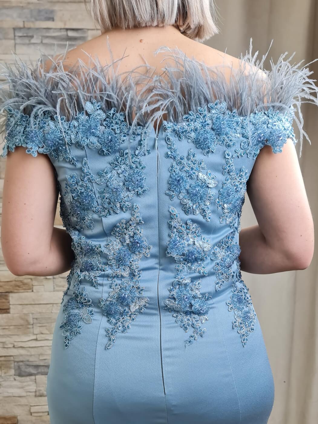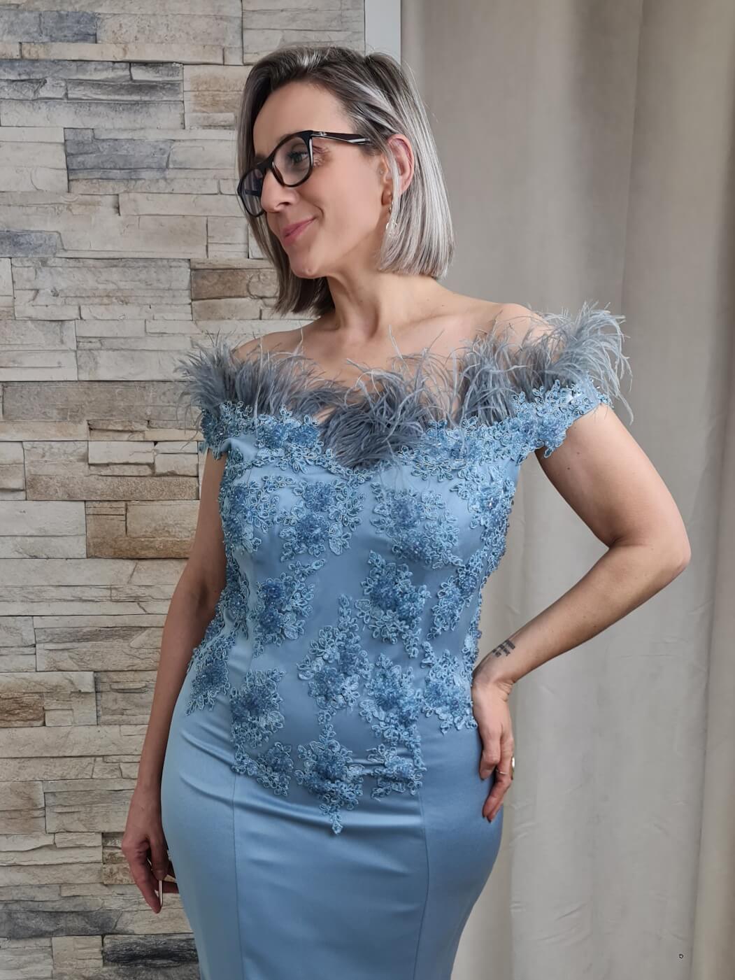 O vestido azul claro é uma peça elegante e sofisticada, ideal para eventos especiais. O design apresenta um corpete caicai com detalhes de renda floral e aplicações de brilho, adicionando um toque romântico e luxuoso. As mangas curtas com aplicações de plumas criam um efeito visual interessante e glamoroso.