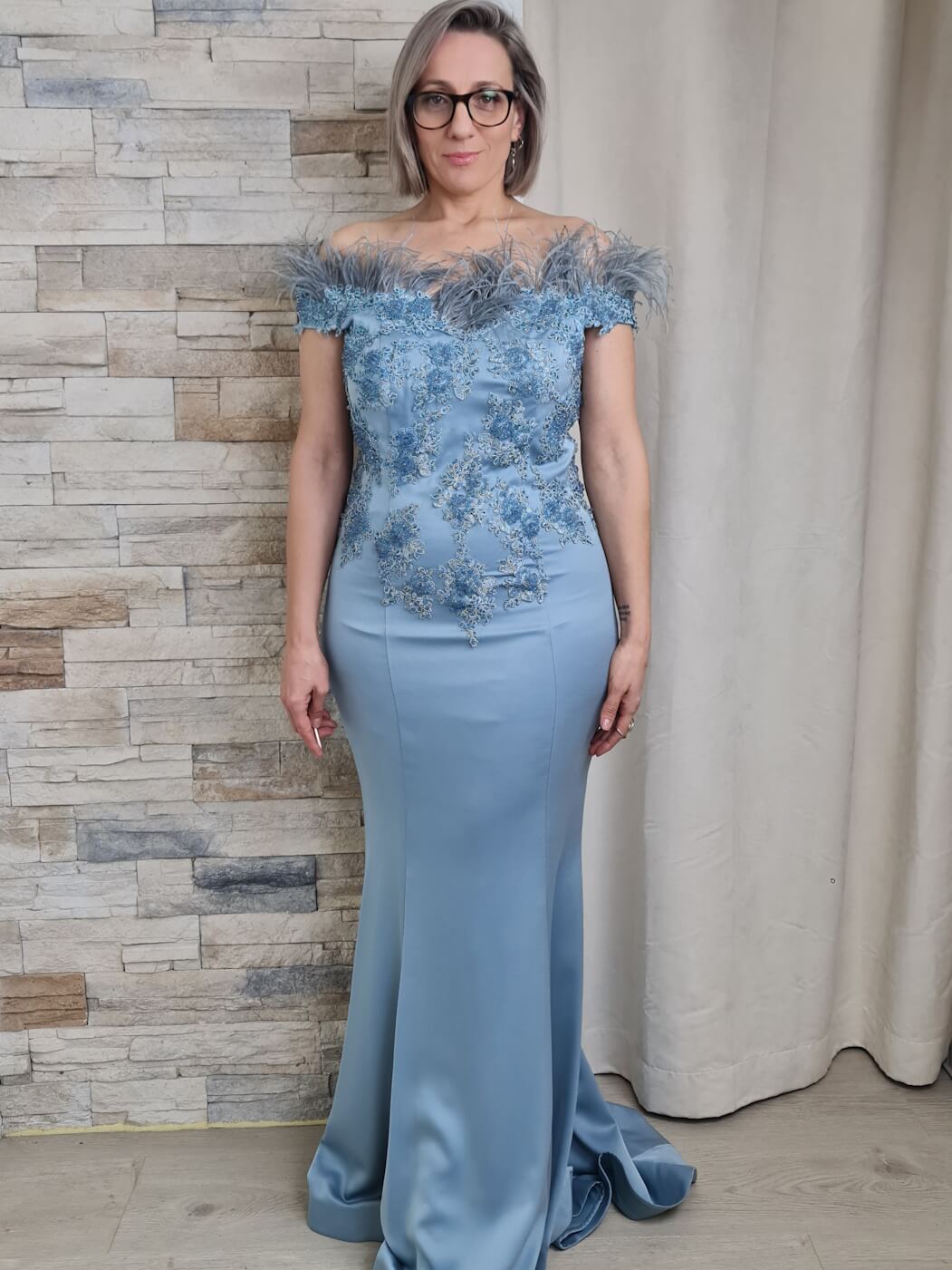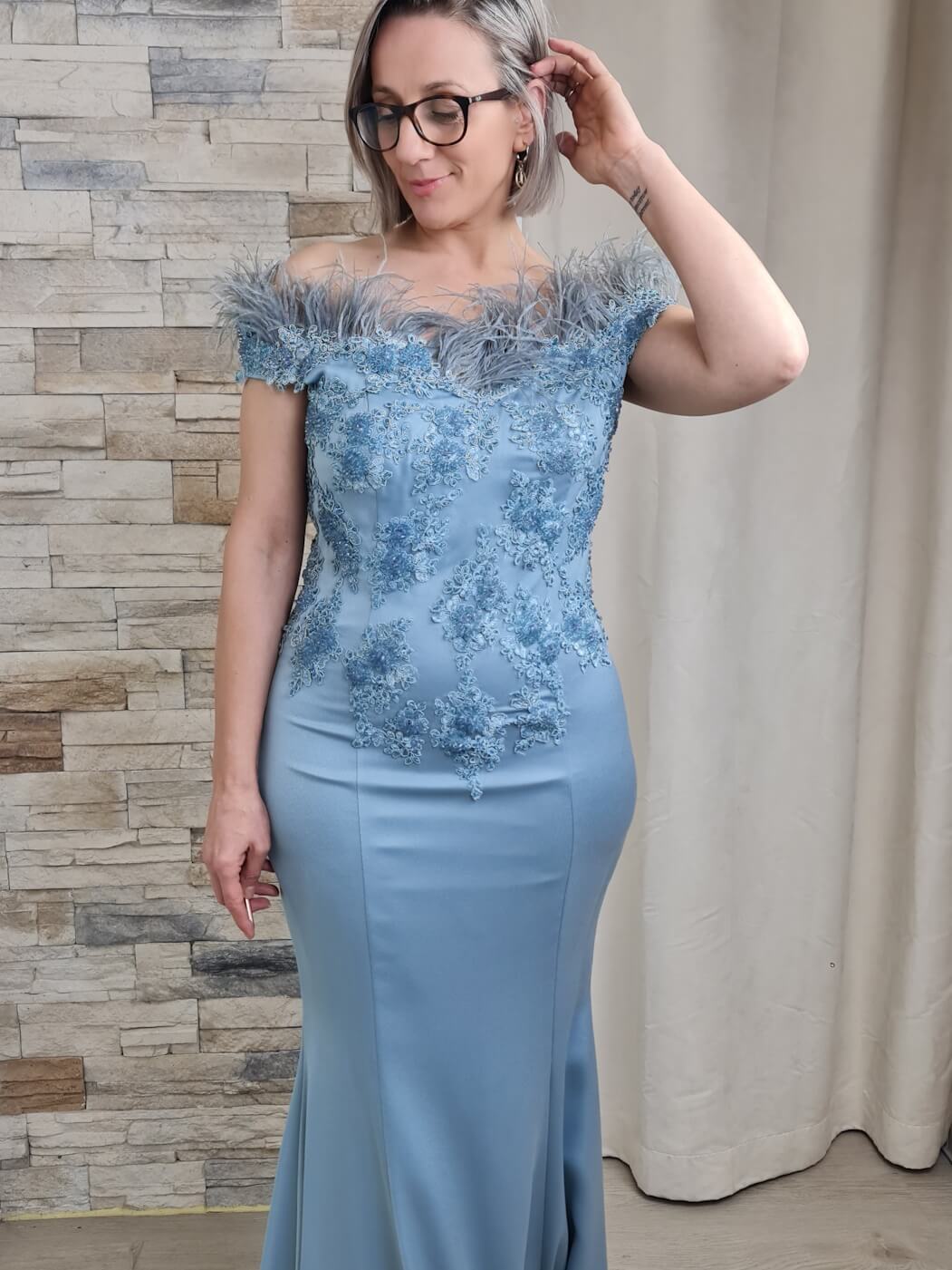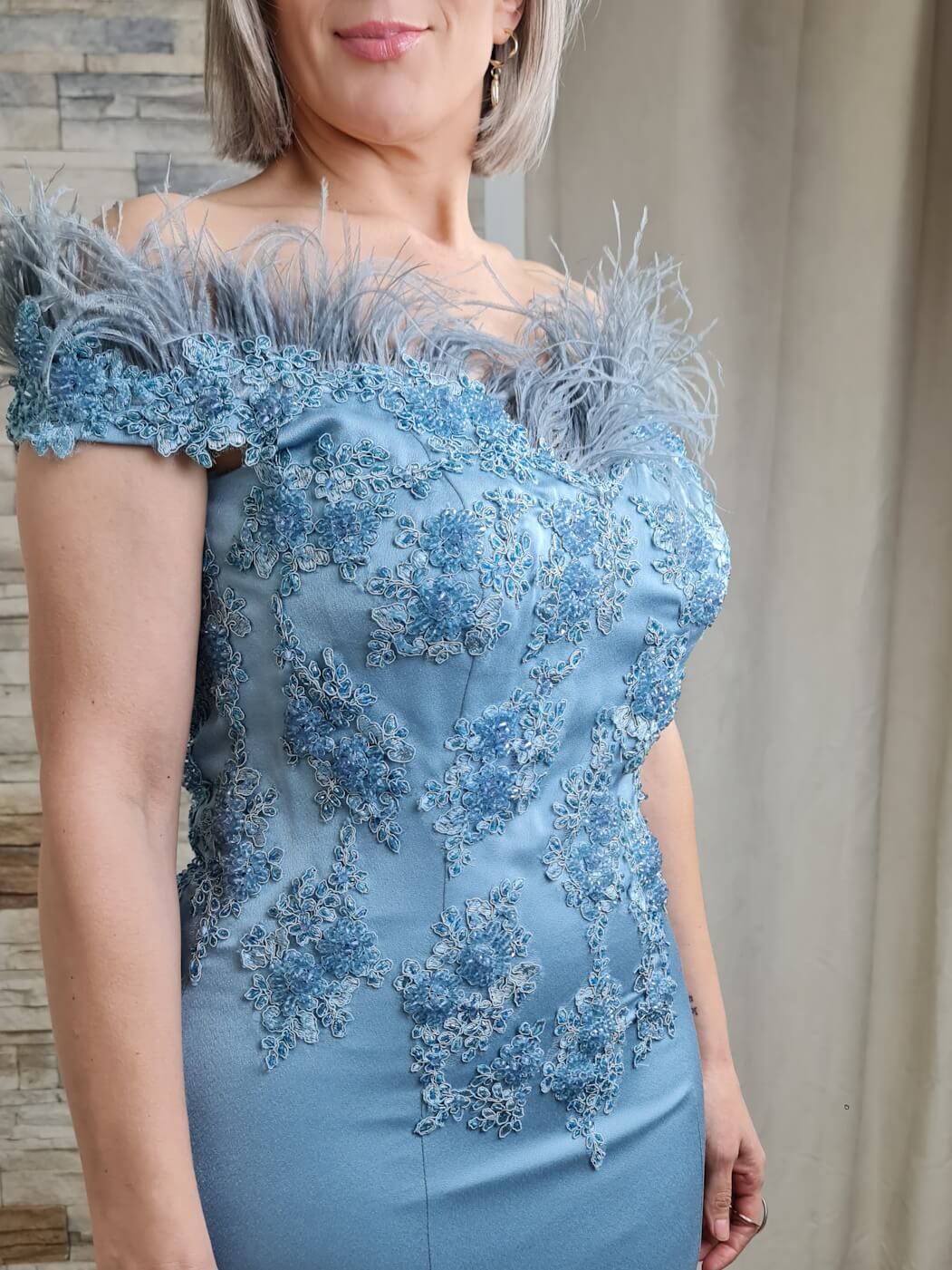 O vestido azul claro é uma peça elegante e sofisticada, ideal para eventos especiais. O design apresenta um corpete caicai com detalhes de renda floral e aplicações de brilho, adicionando um toque romântico e luxuoso. As mangas curtas com aplicações de plumas criam um efeito visual interessante e glamoroso.