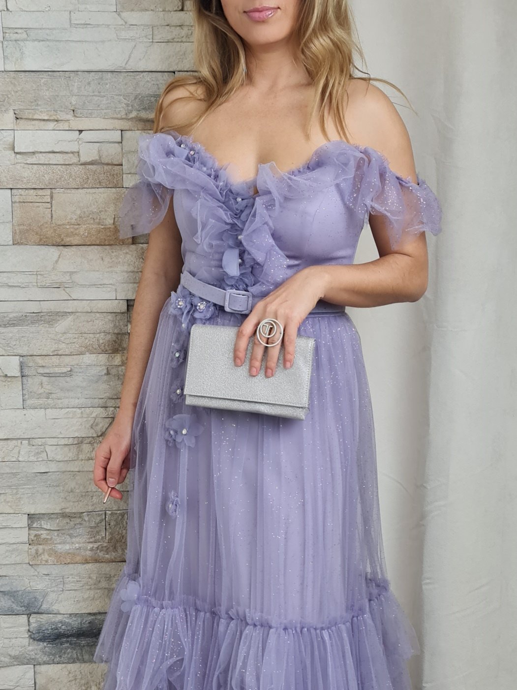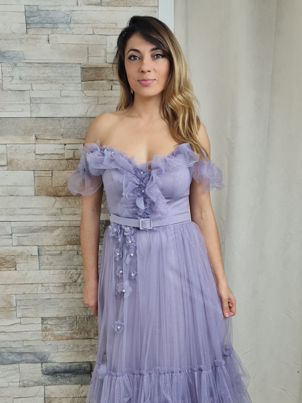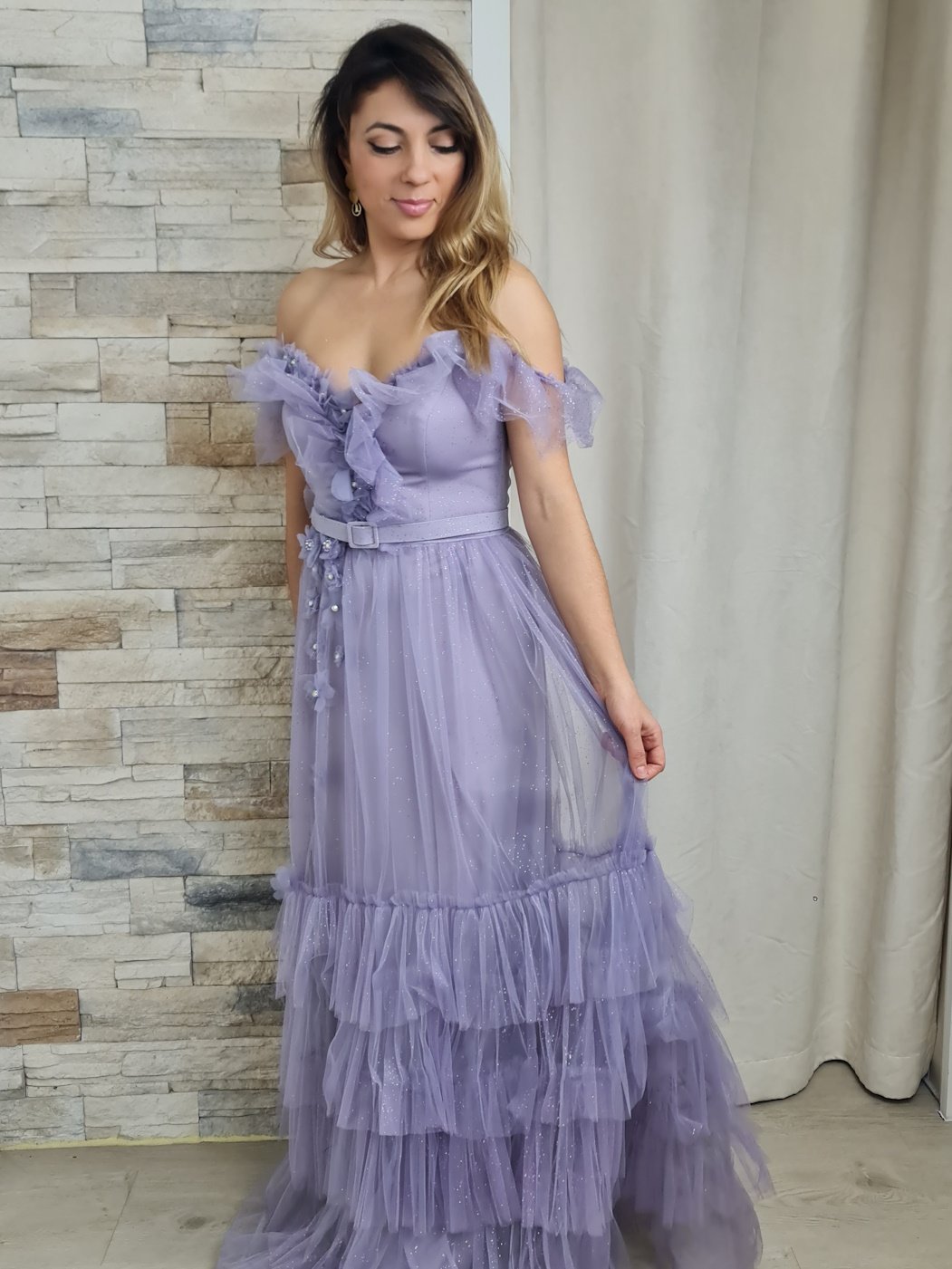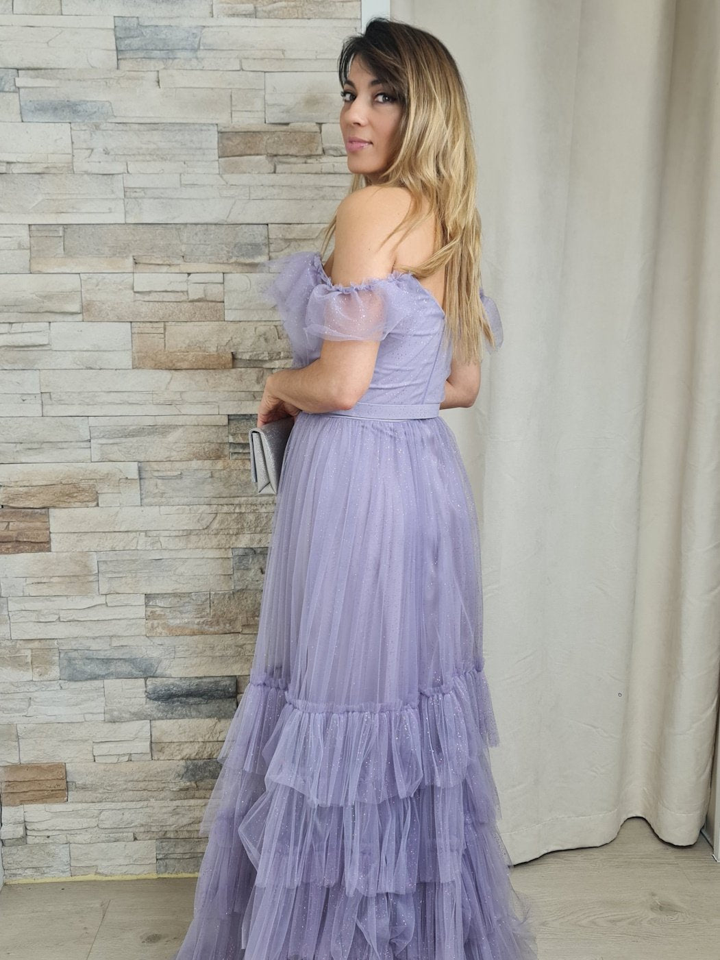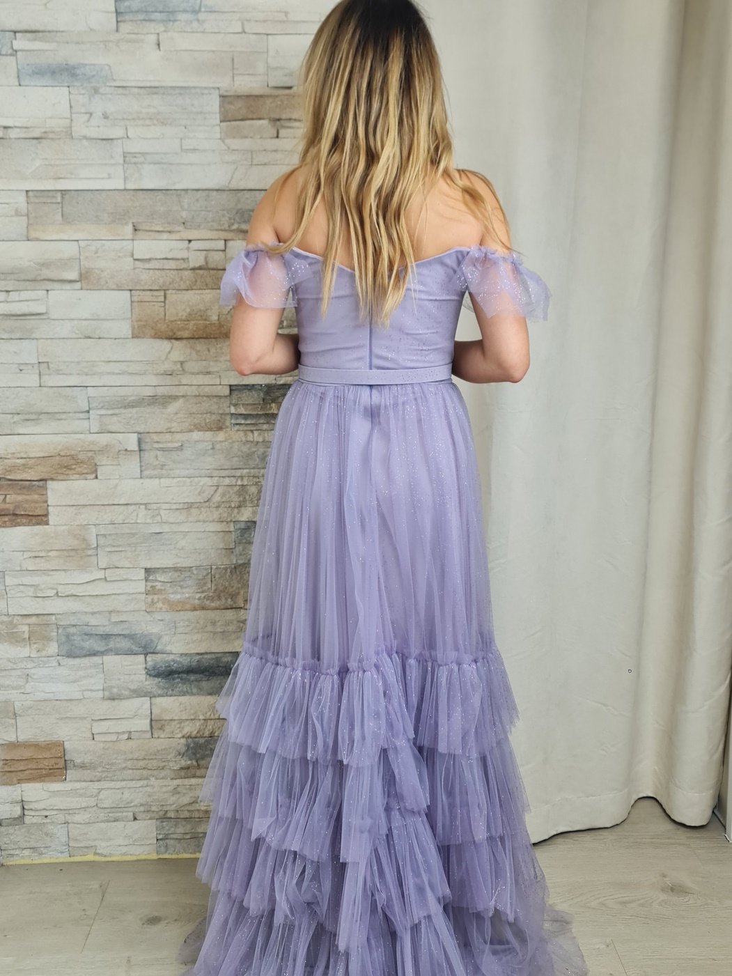 O vestido lilás é uma peça romântica e elegante, ideal para eventos especiais. O design apresenta um corpete caicai com detalhes de babados e aplicações de brilho, adicionando um toque sofisticado e delicado. A saia longa e fluida em tule, com várias camadas de babados, cria um efeito visual etéreo e glamoroso.