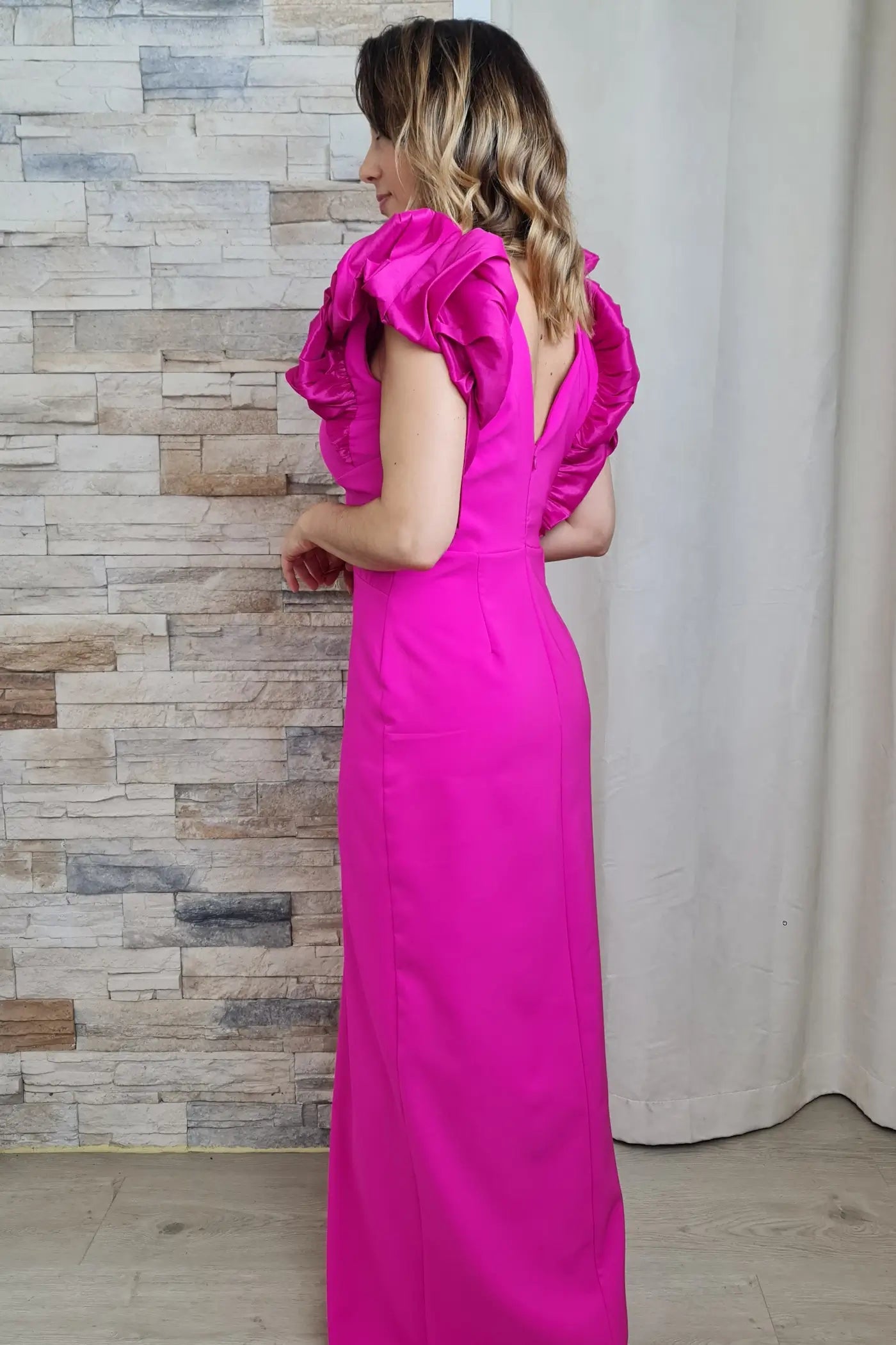 O vestido é uma peça moderna e elegante, ideal para eventos especiais. O design apresenta um corte longo com decote em V e mangas curtas volumosas com detalhes franzidos nos ombros. O tecido fúcsia vibrante confere um toque ousado e sofisticado ao look.