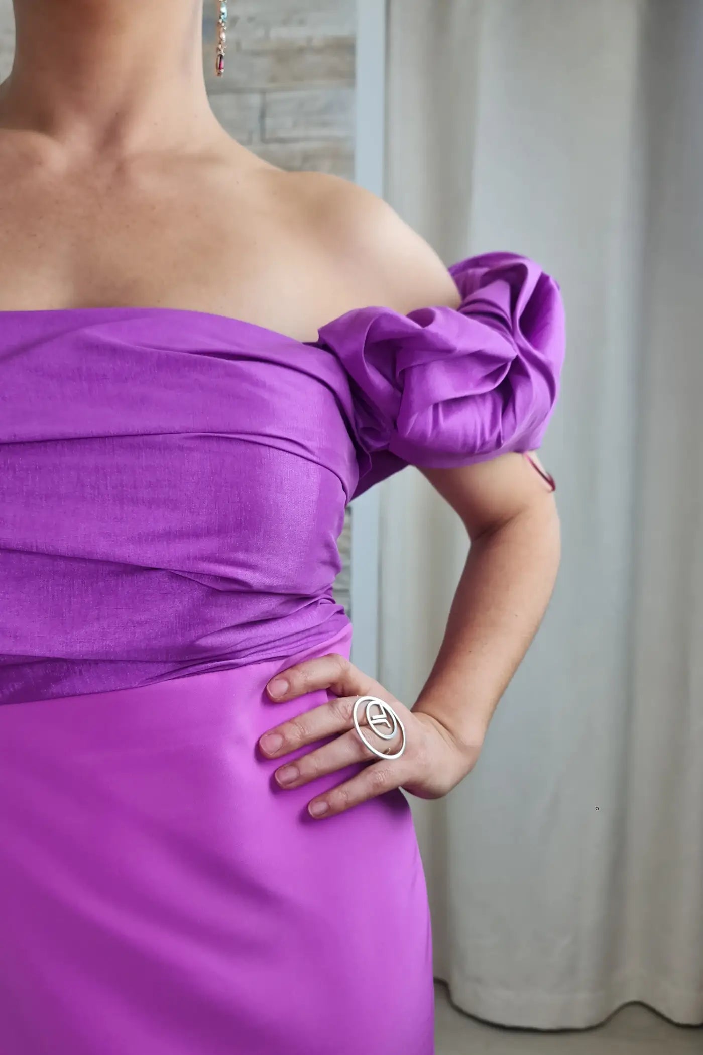 Este vestido midi exala elegância e modernidade, com um design que valoriza a silhueta feminina. O decote cai-cai, com um detalhe drapeado no busto, adiciona um toque de sofisticação e sensualidade. A manga única volumosa, com ideia de laço no ombro, cria um ponto focal dramático e original.