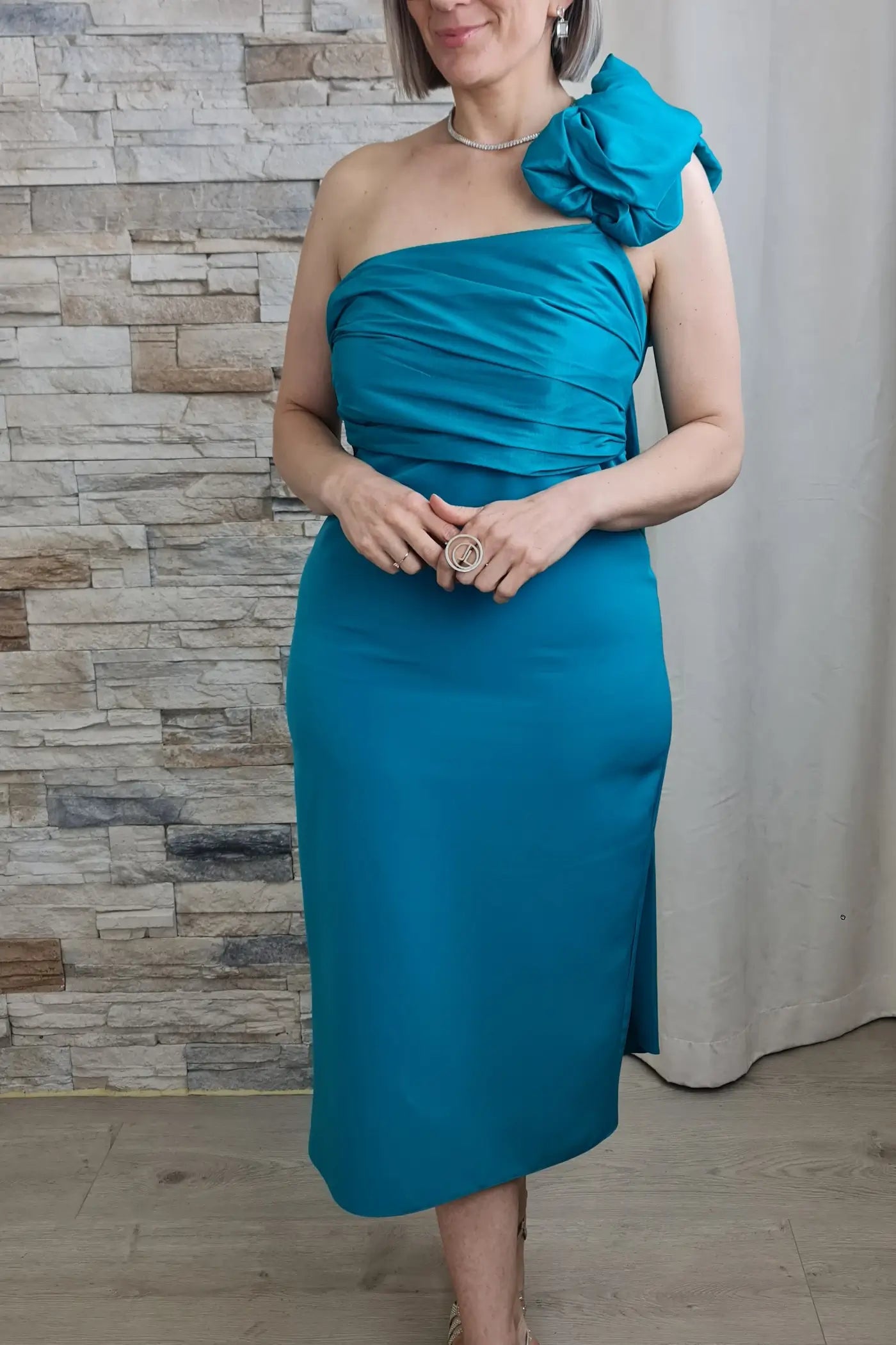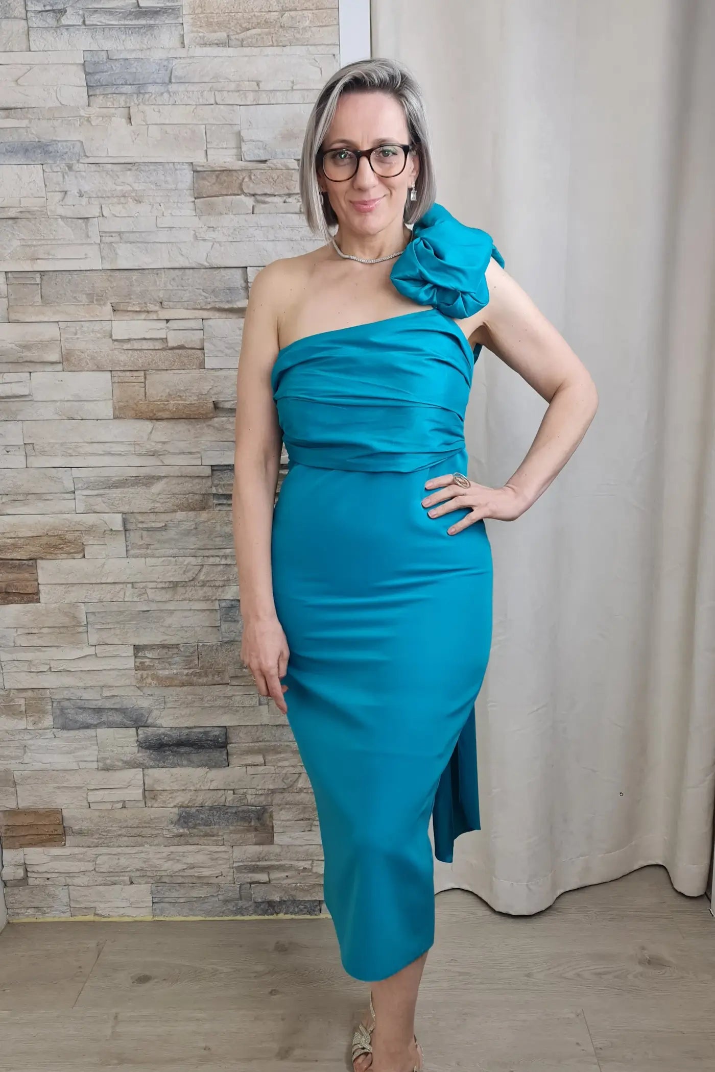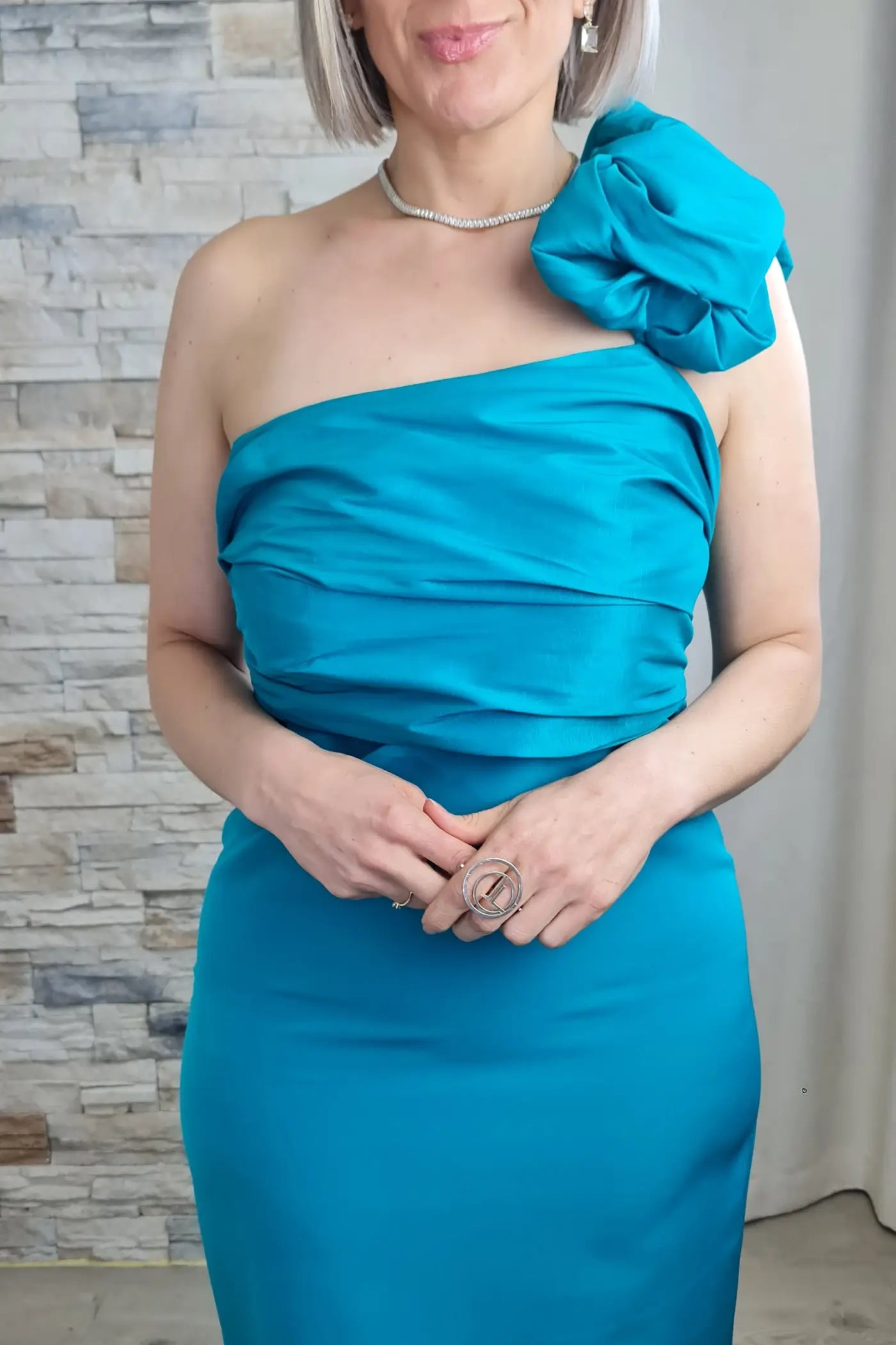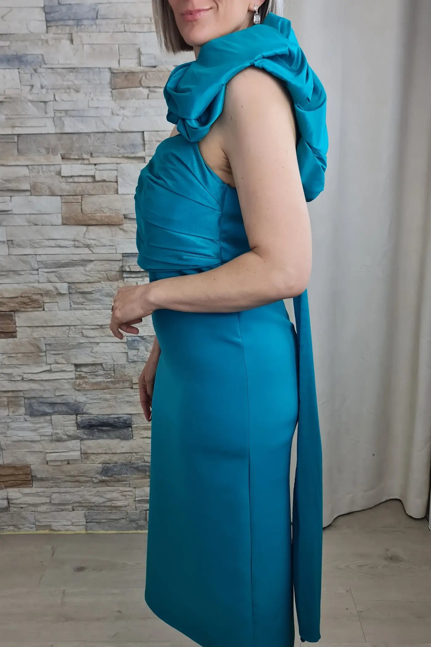 O vestido é de comprimento midi e na cor azul turquesa vibrante. É um modelo só um ombro, com um design drapeado que envolve o corpo de forma elegante. No ombro esquerdo, apresenta uma grande aplicação em forma de flor feita do mesmo tecido do vestido, adicionando um toque dramático e sofisticado. O vestido tem um corte ajustado que realça a silhueta e uma pequena abertura ou fenda na parte de trás da bainha. O tecido é estruturado, com um leve brilho.