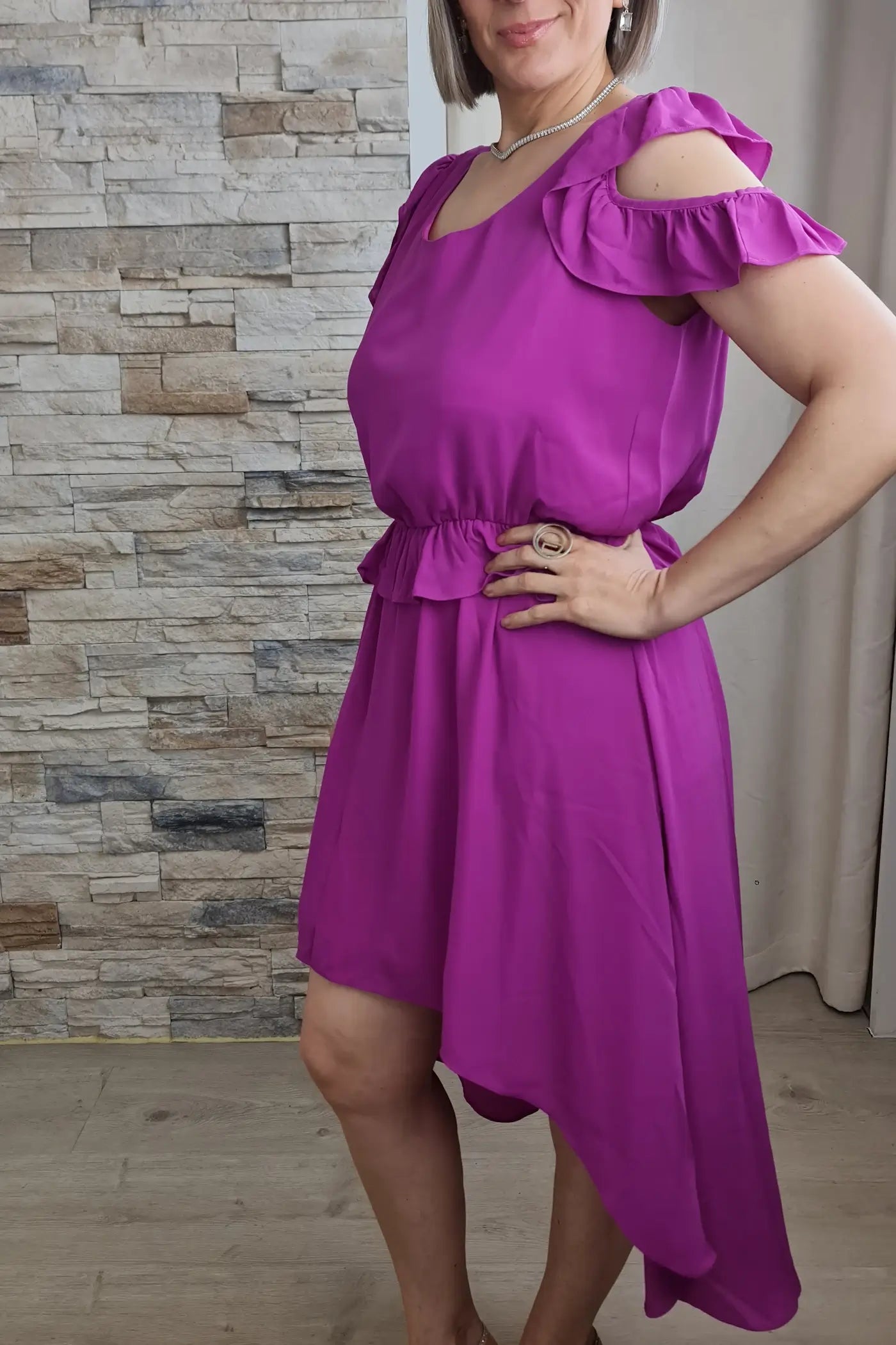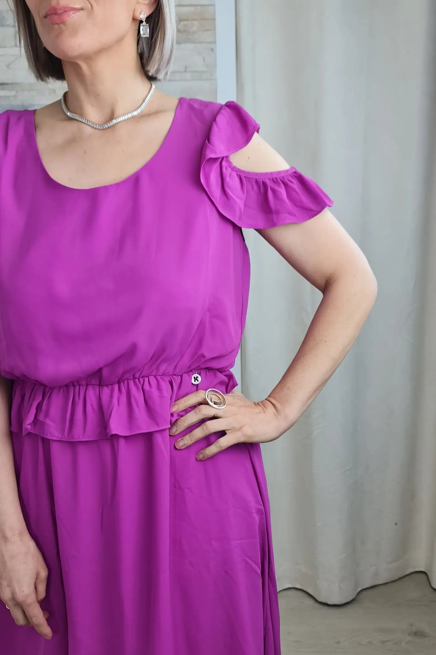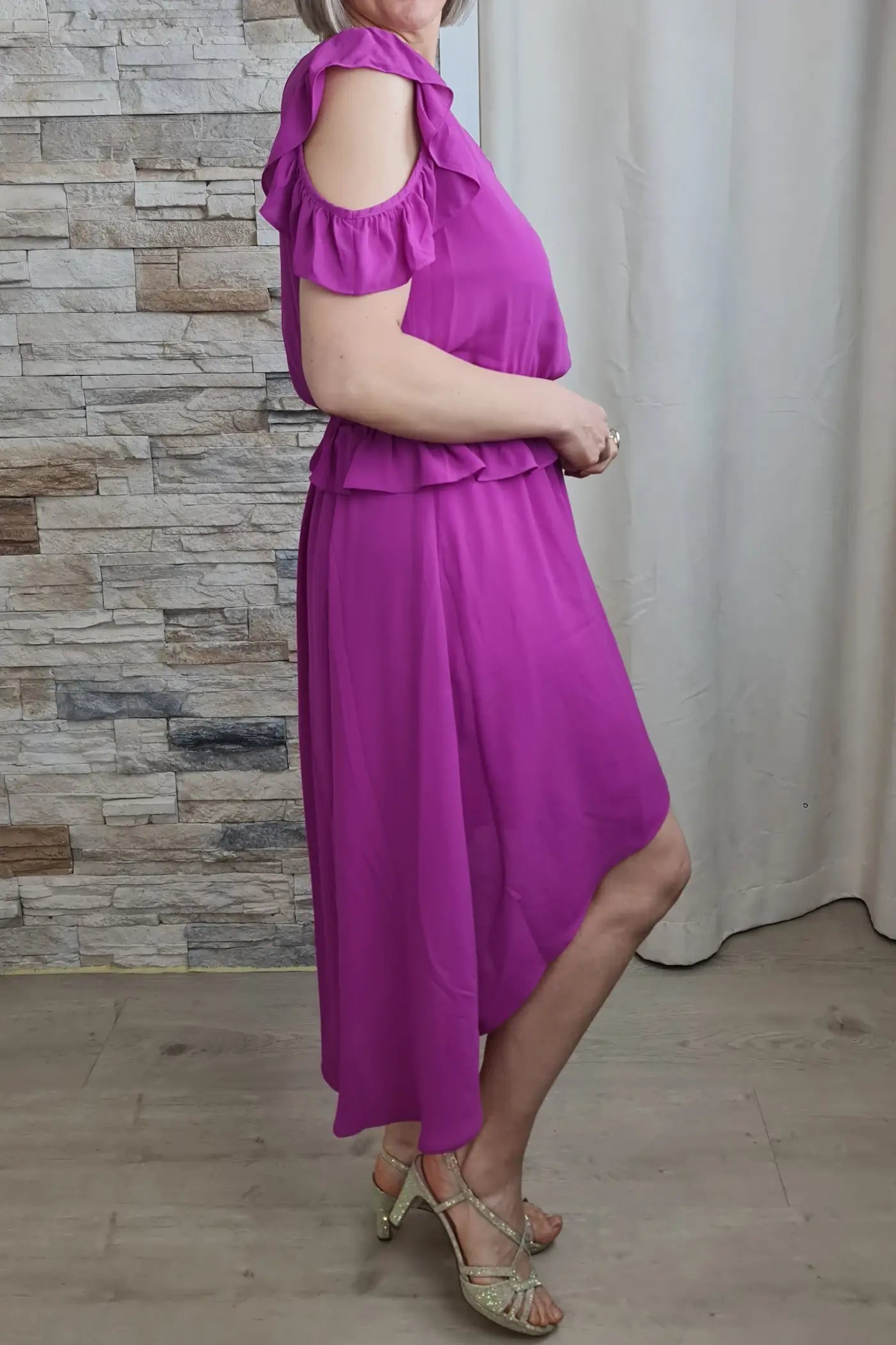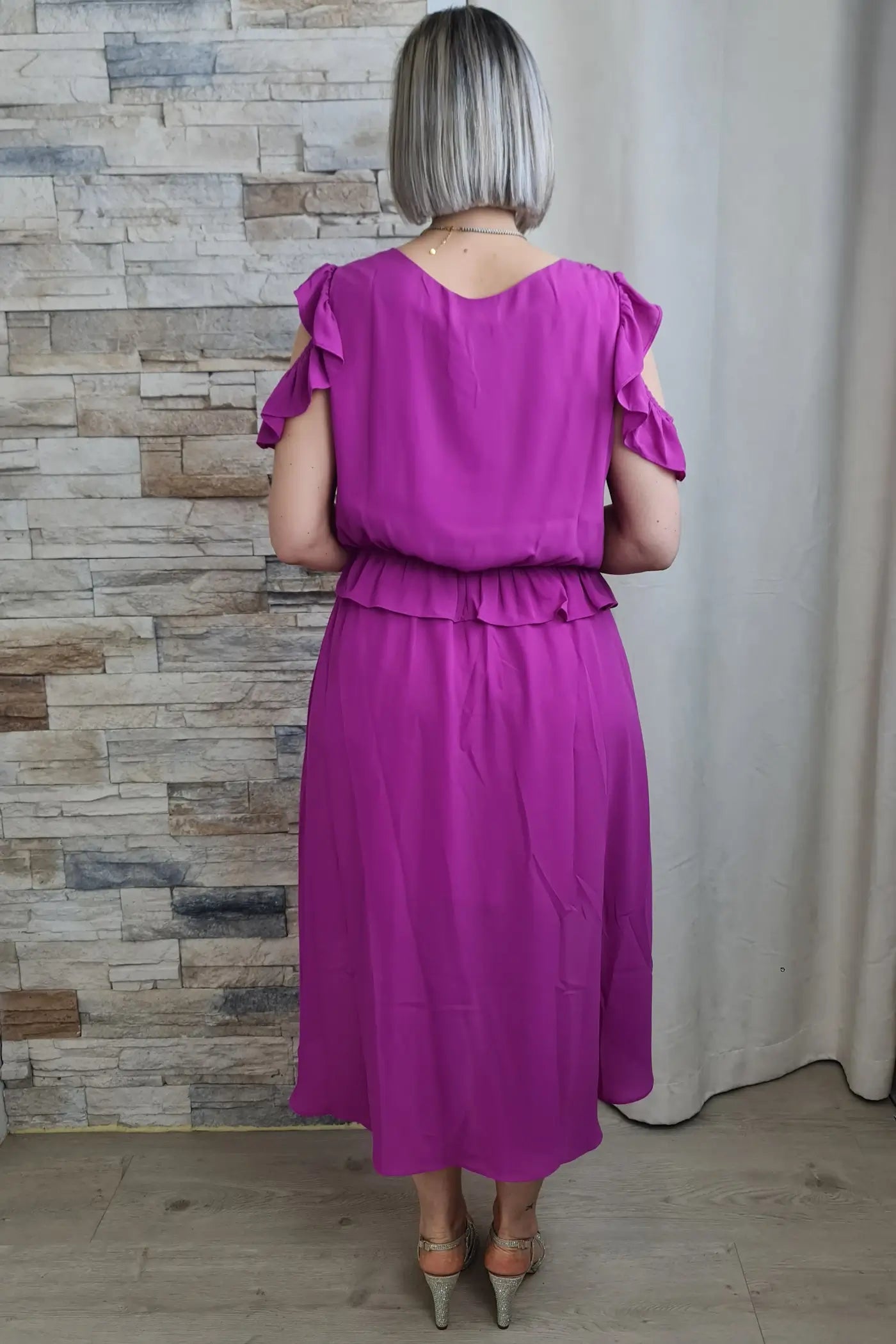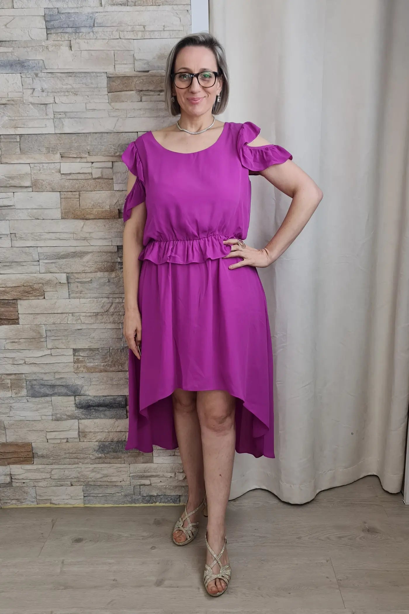 O vestido é de comprimento midi, com a parte da frente mais curta e a parte de trás mais comprida, criando uma bainha assimétrica. É na cor fúcsia. O vestido possui mangas curtas com detalhes de folhos nos ombros. O decote é redondo e simples. Na cintura, apresenta um corte com um folho ou babado que define a silhueta. O tecido é fluido, em chiffon e com bom caimento.