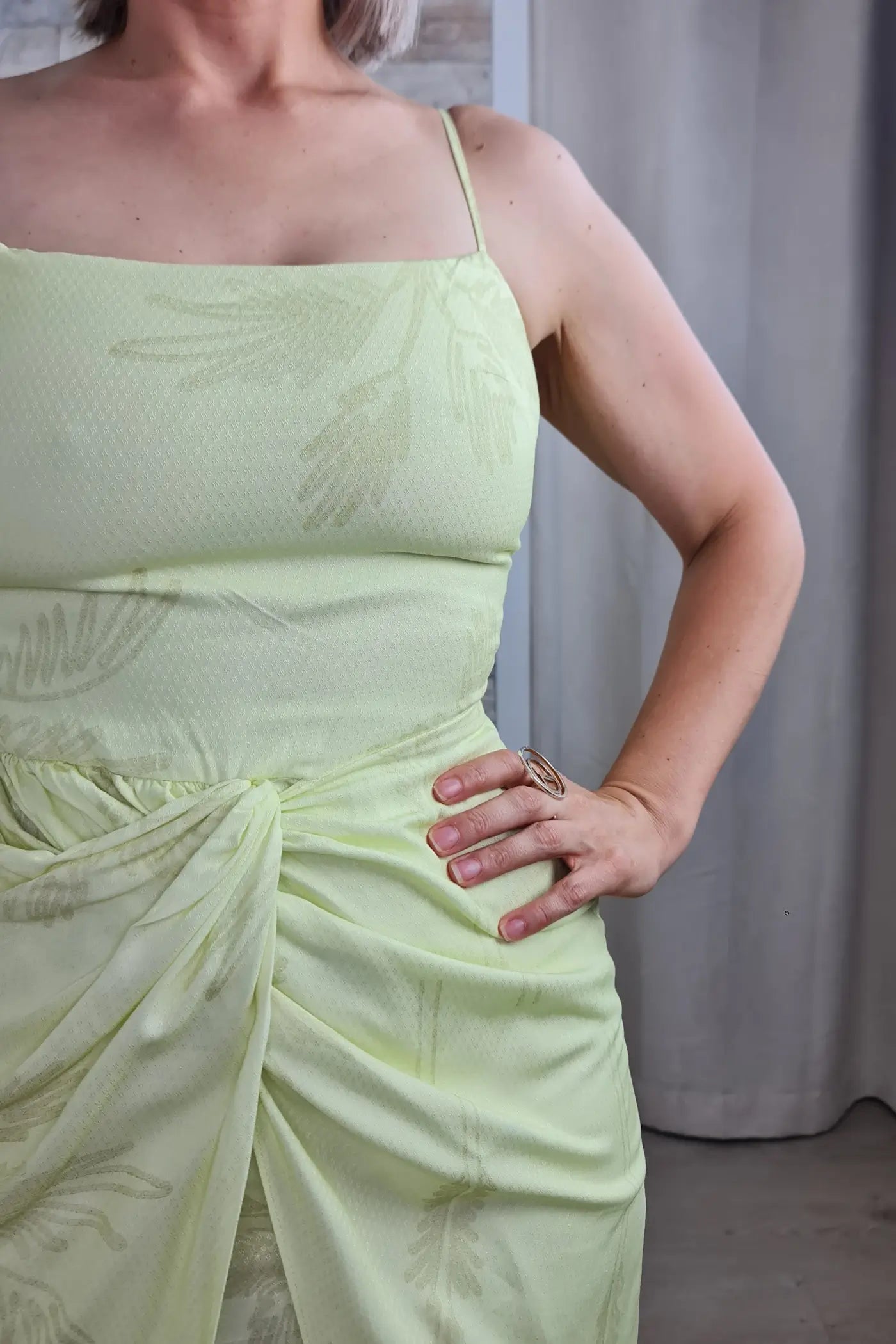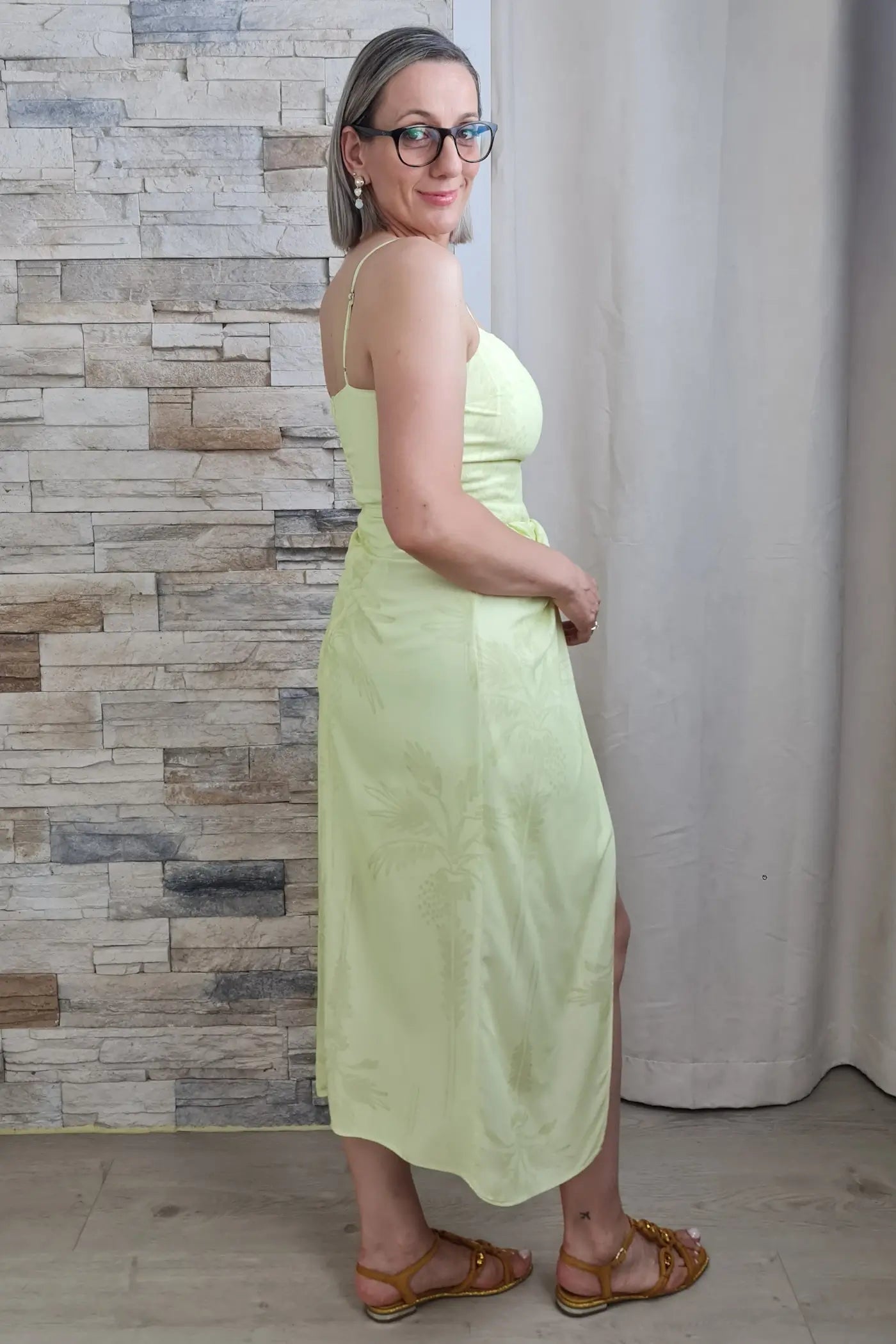 Ao vestir a "Luz Sutil", sentirá uma sensação de frescura e um toque de originalidade. O tecido acetinado em tom verde-limão pálido e o caimento ajustado no corpo proporcionam bem-estar e a convidam a expressar a sua personalidade marcante.