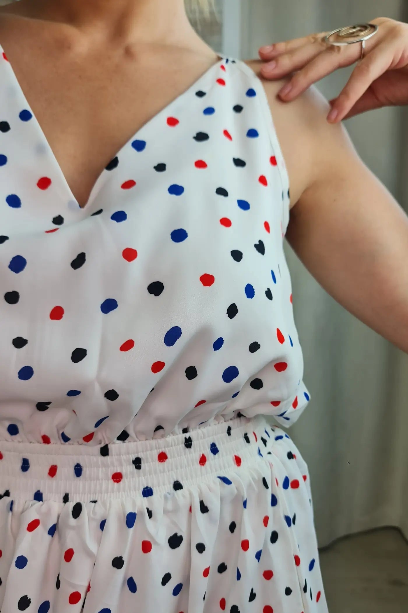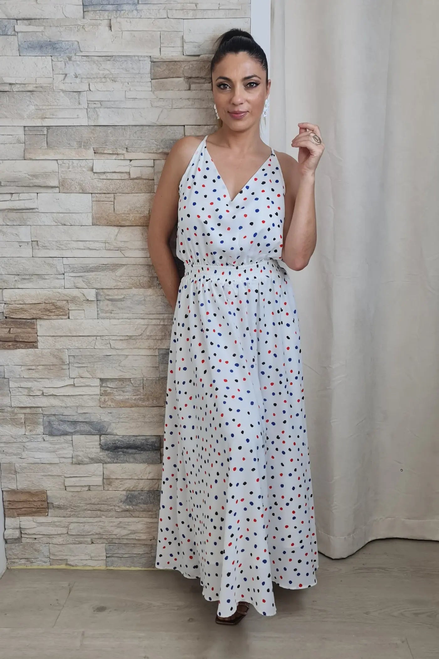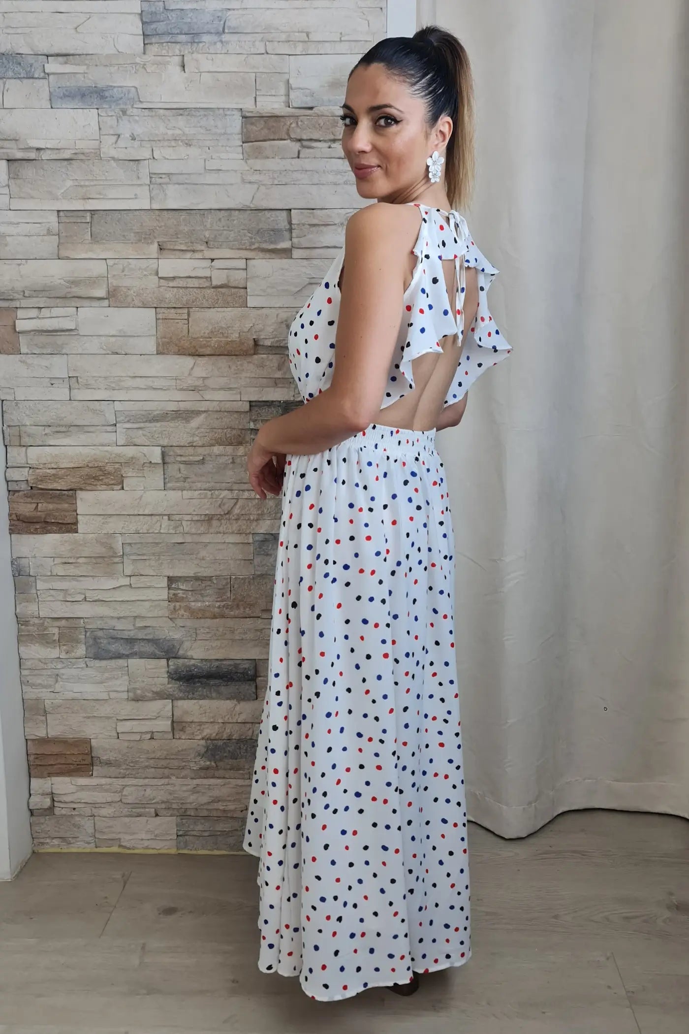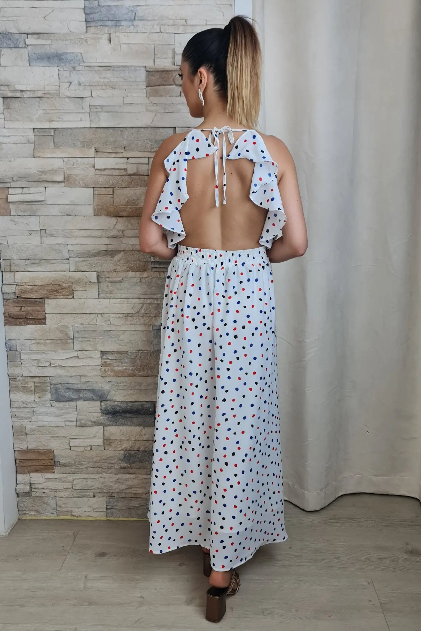 O design é prático e moderno. Em branco com bolinhas coloridas (azul, bordeaux, e pretas), destaca-se pelo decote nas costas com detalhe de folhos e tiras para atar, que adicionam um toque romântico e inesperado. A cintura é elástica e a saia maxi com comprimento high-low confere um ar descontraído e divertido.