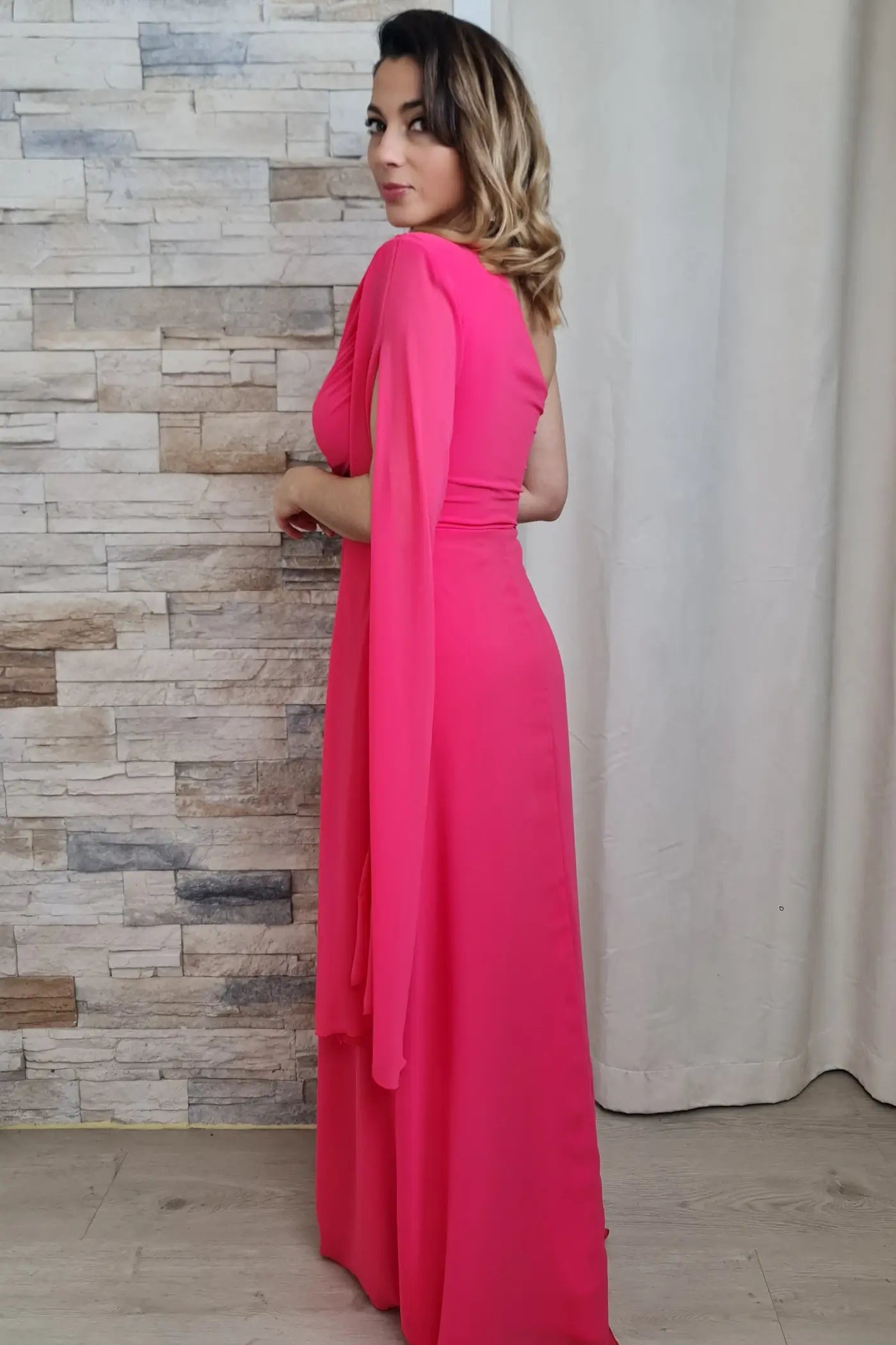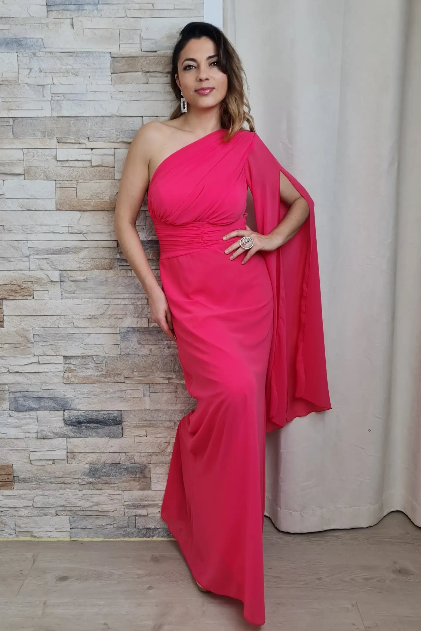 Este vestido apresenta um design moderno e elegante, ideal para eventos especiais. O corte longo com um ombro só e mangas amplas confere um toque sofisticado e glamoroso à peça. O tecido coral vibrante, com um leve brilho, adiciona um toque de cor e ousadia ao look. Os detalhes do drapeado no corpete e a fenda lateral definem a figura feminina.