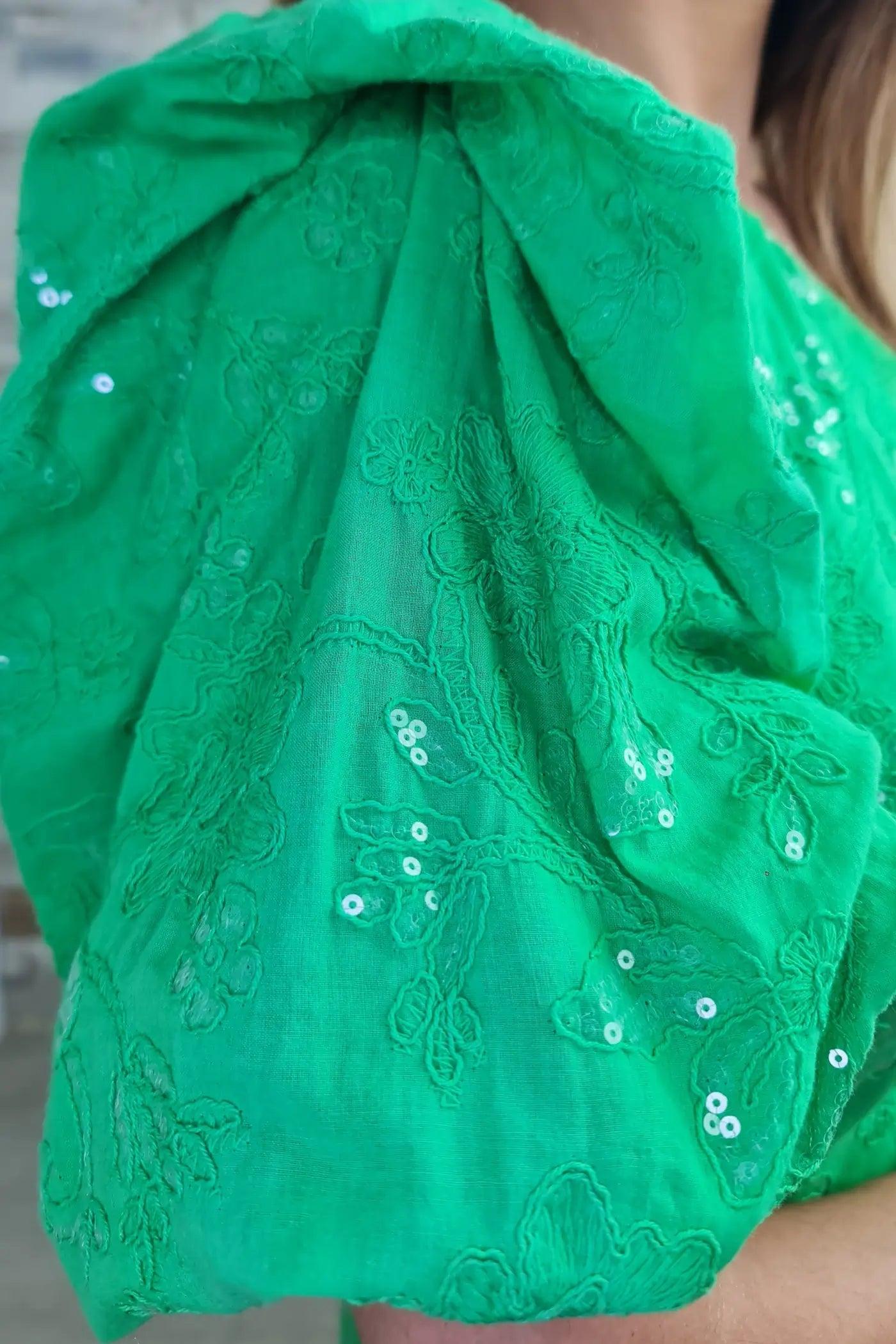 O design é prático e elegante. Em tom verde vibrante com um bordado floral subtil, destaca-se pelo corte de um ombro só e pelos folhos na manga, que adicionam um toque romântico e inesperado. O corte curto garante um visual descontraído e divertido.