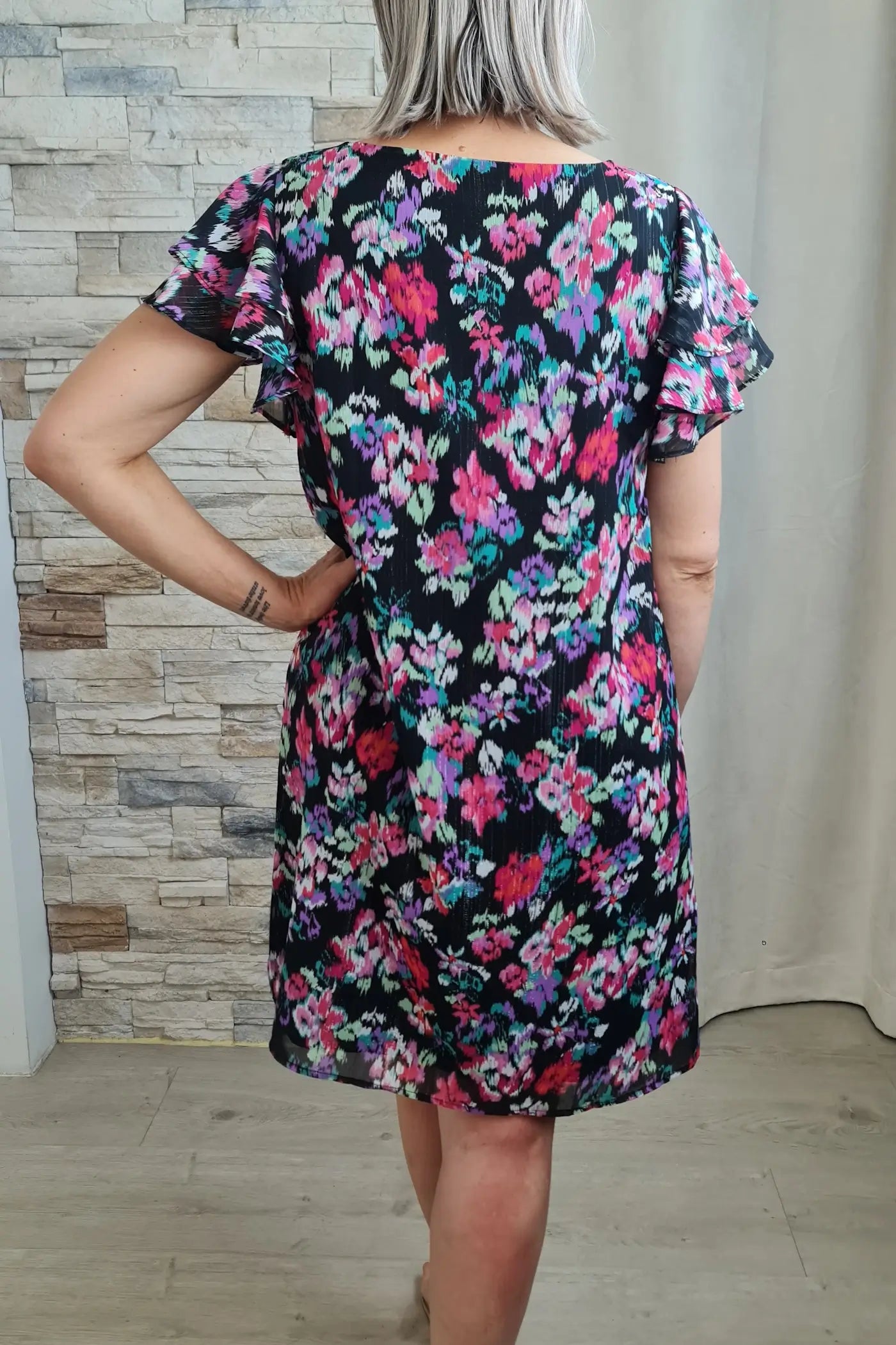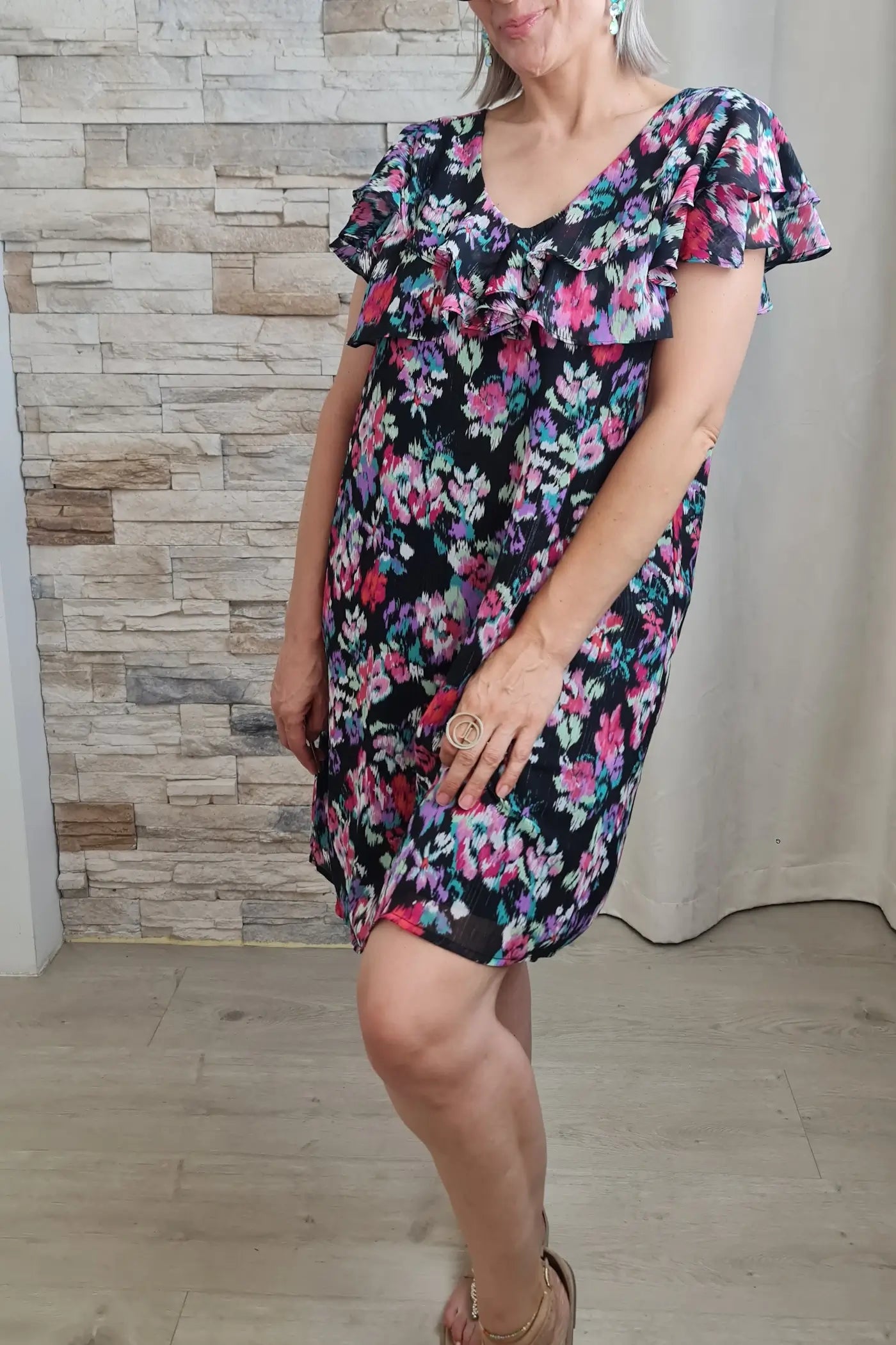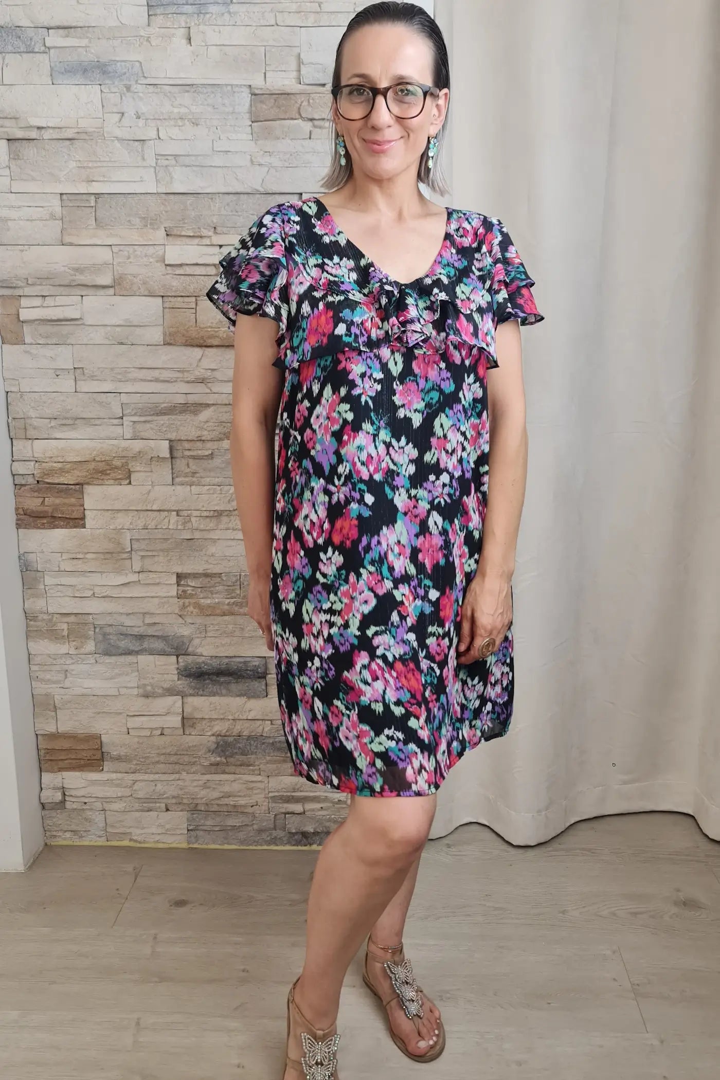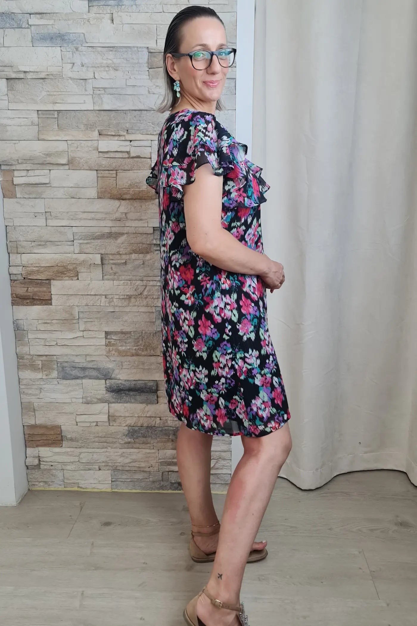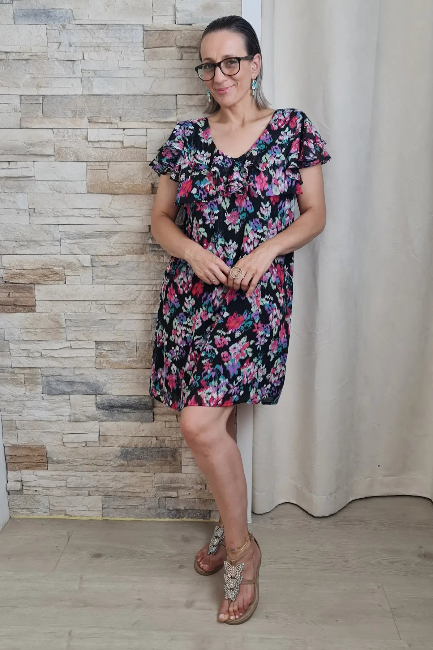O design é prático e elegante. Em fundo preto com um estampado floral colorido em tons de rosa, azul e verde, destaca-se pelo decote em V e pelos folhos que se estendem do decote para os ombros, criando um efeito de manga delicado e romântico. O corte reto e solto garante um visual descontraído e elegante.