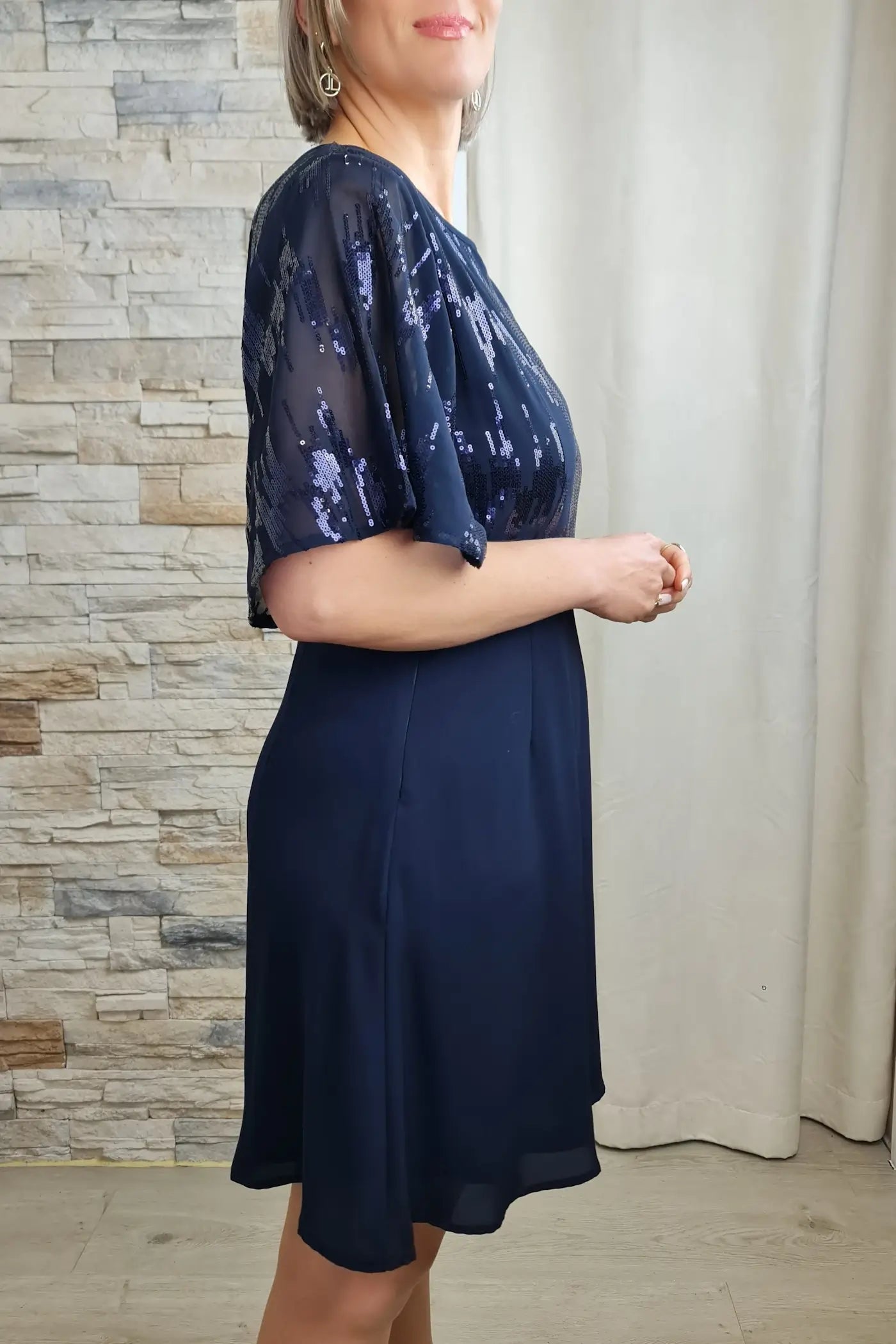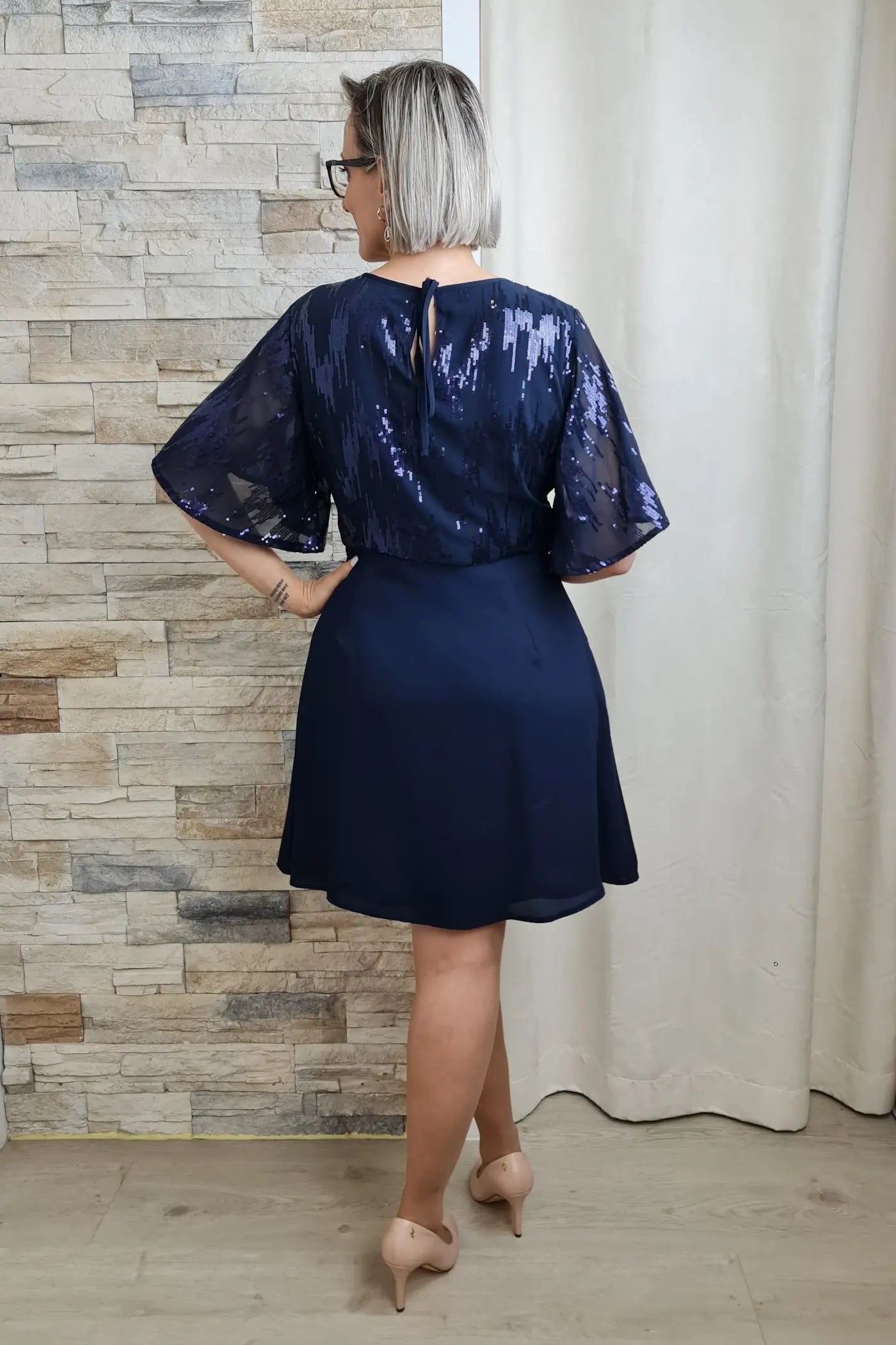 O vestido é uma peça elegante e moderna, ideal para diversas ocasiões. A parte superior do vestido é confeccionada em tecido azul-escuro com aplicações de lantejoulas brilhantes, criando um efeito sofisticado e festivo. Possui um decote redondo clássico e mangas curtas amplas, com um caimento solto e esvoaçante.