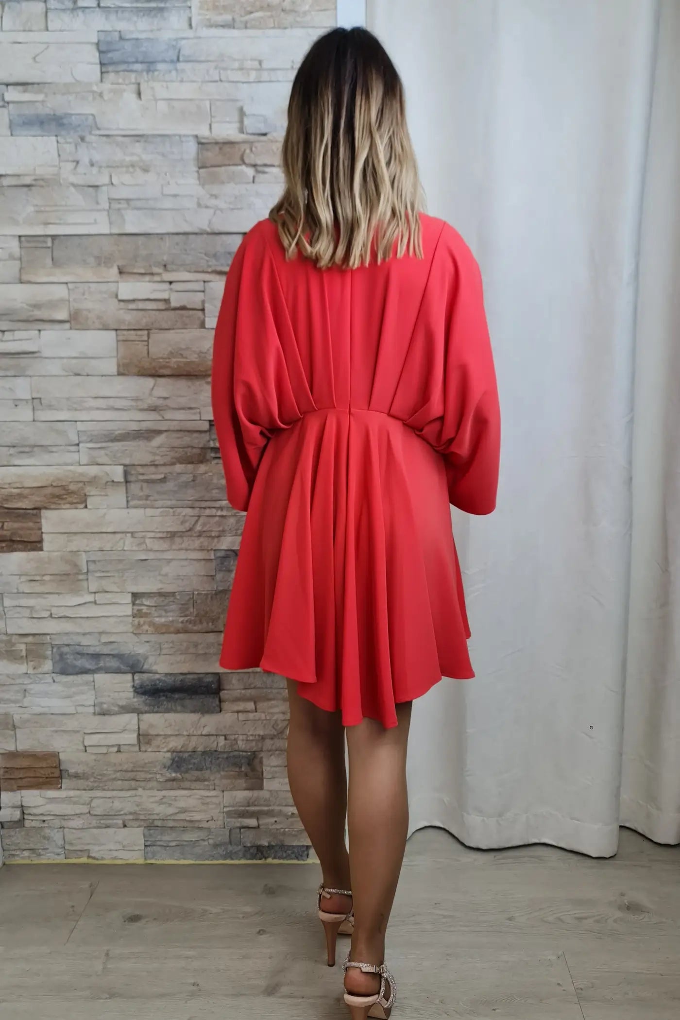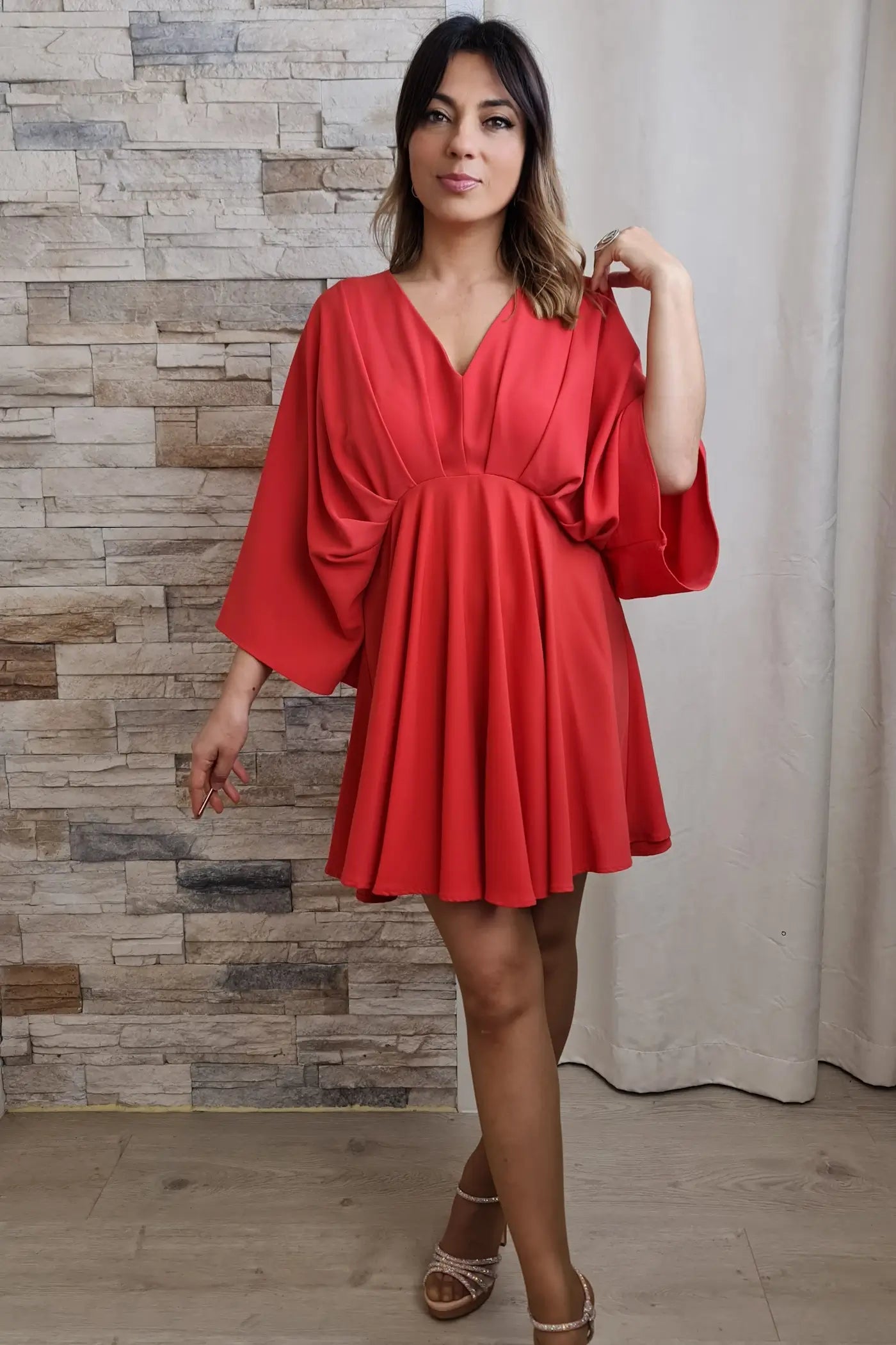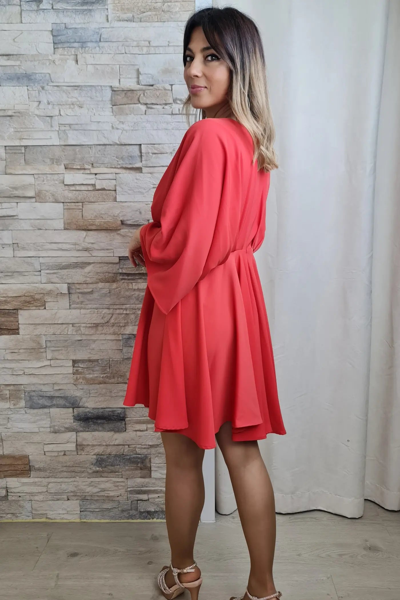 O vestido é uma peça moderna e elegante, ideal para diversas ocasiões. Apresenta um corte curto com um decote em V pronunciado e mangas amplas, no estilo quimono, que lhe conferem um toque sofisticado e fluido. A cor coral vibrante torna a peça marcante e alegre.