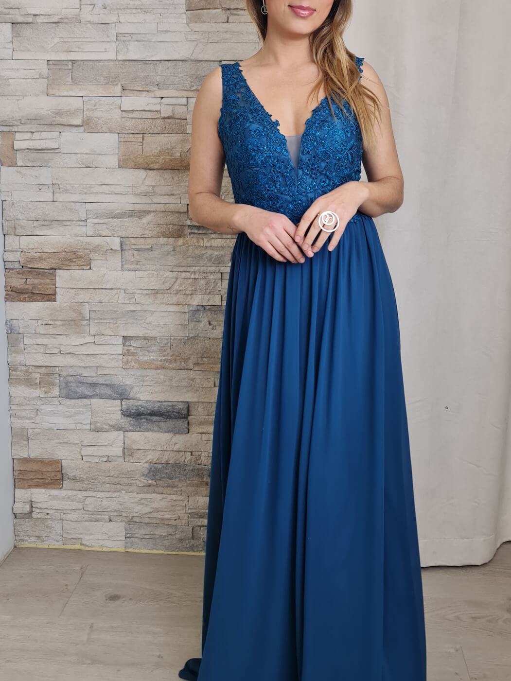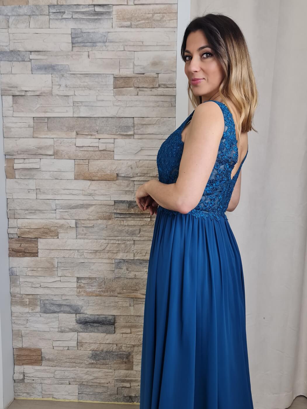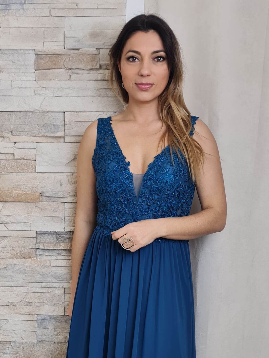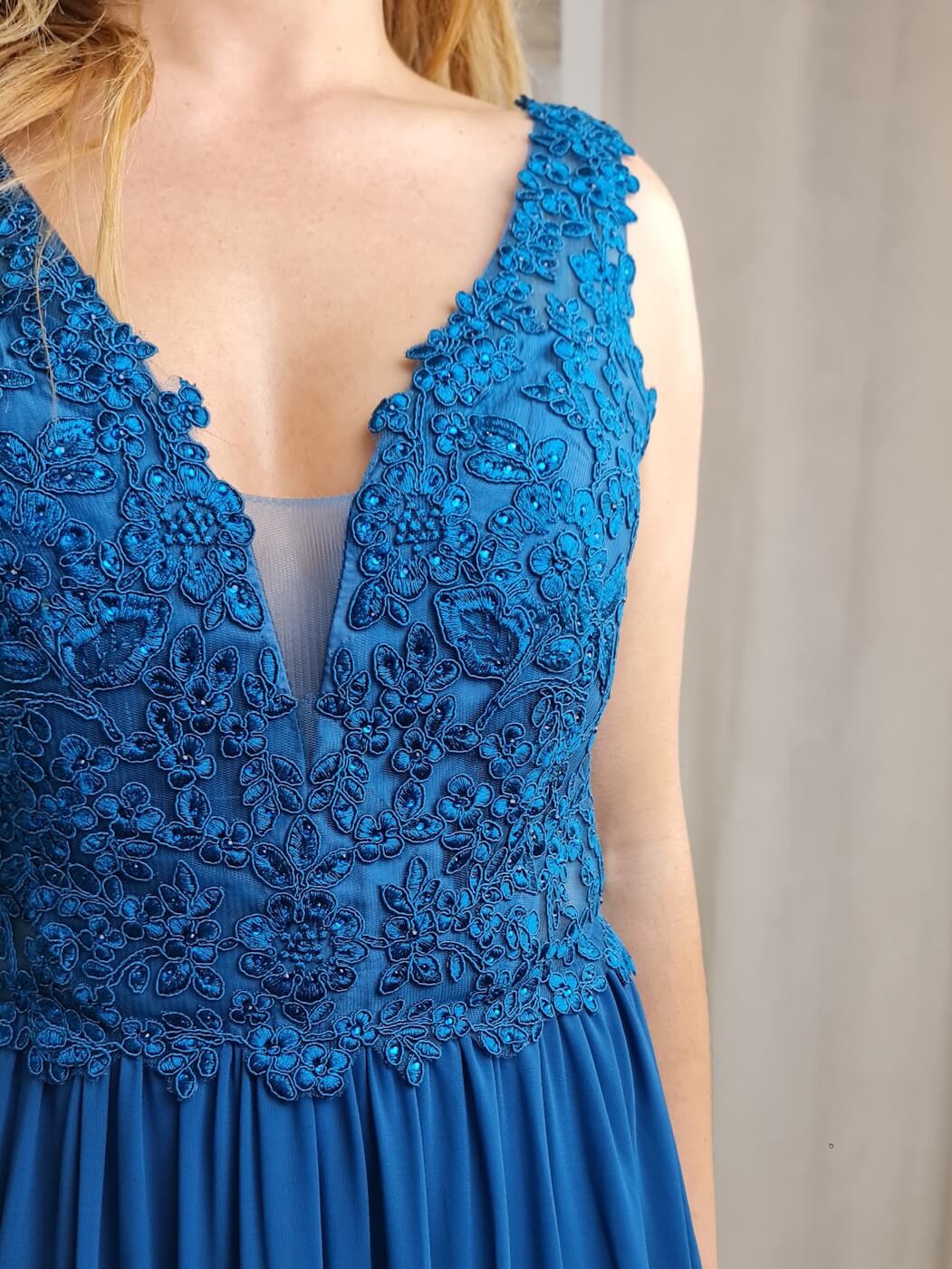 Um vestido azul profundo que combina elegância e sensualidade. O destaque é o corpete em renda floral com detalhes em brilho, que cria um efeito texturizado e sofisticado. O decote em V profundo valoriza o colo, enquanto a transparência sutil na parte central adiciona um toque de ousadia.