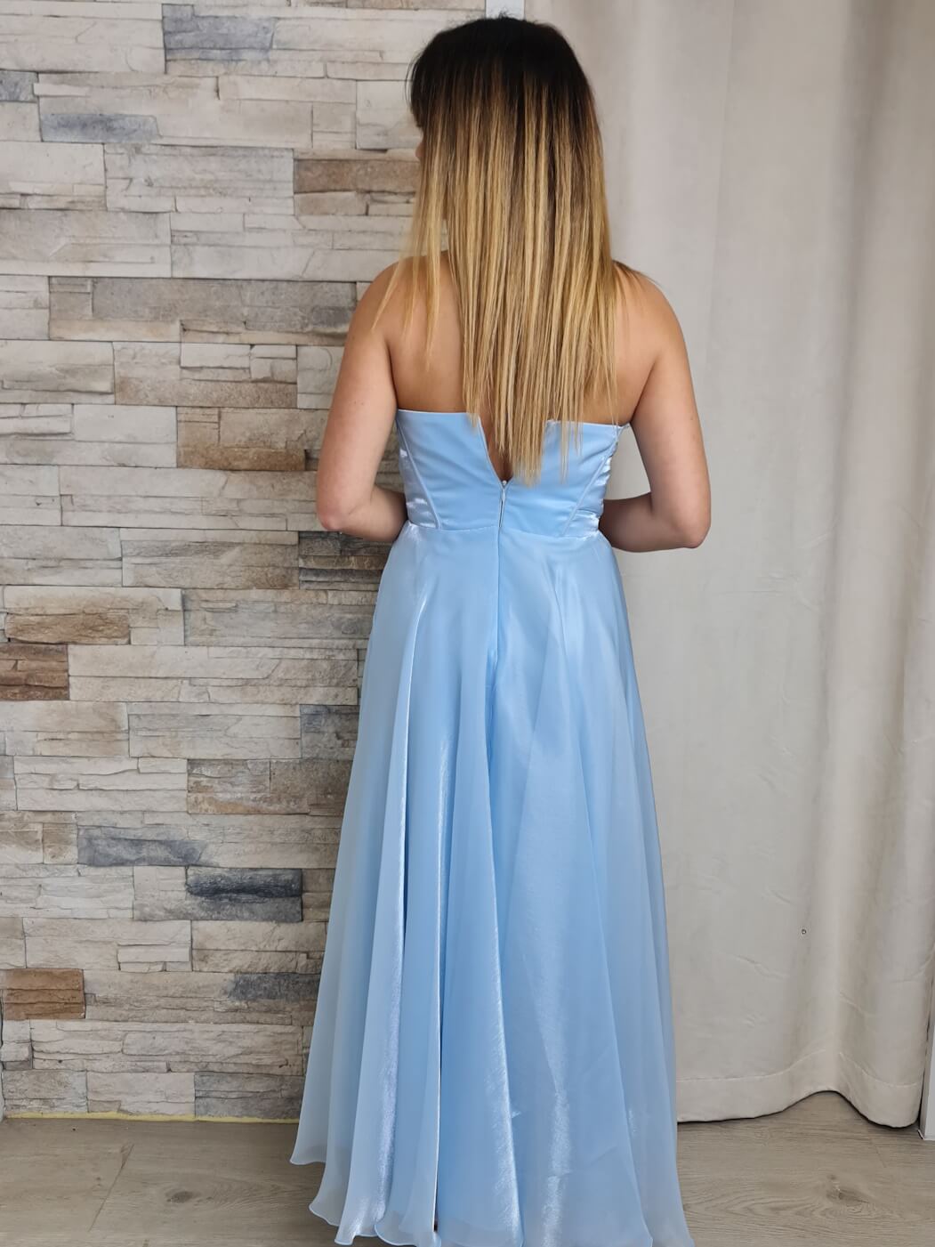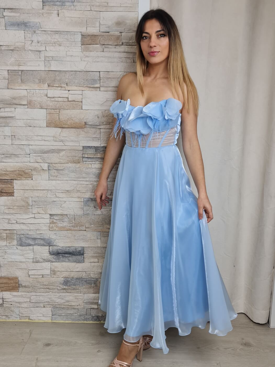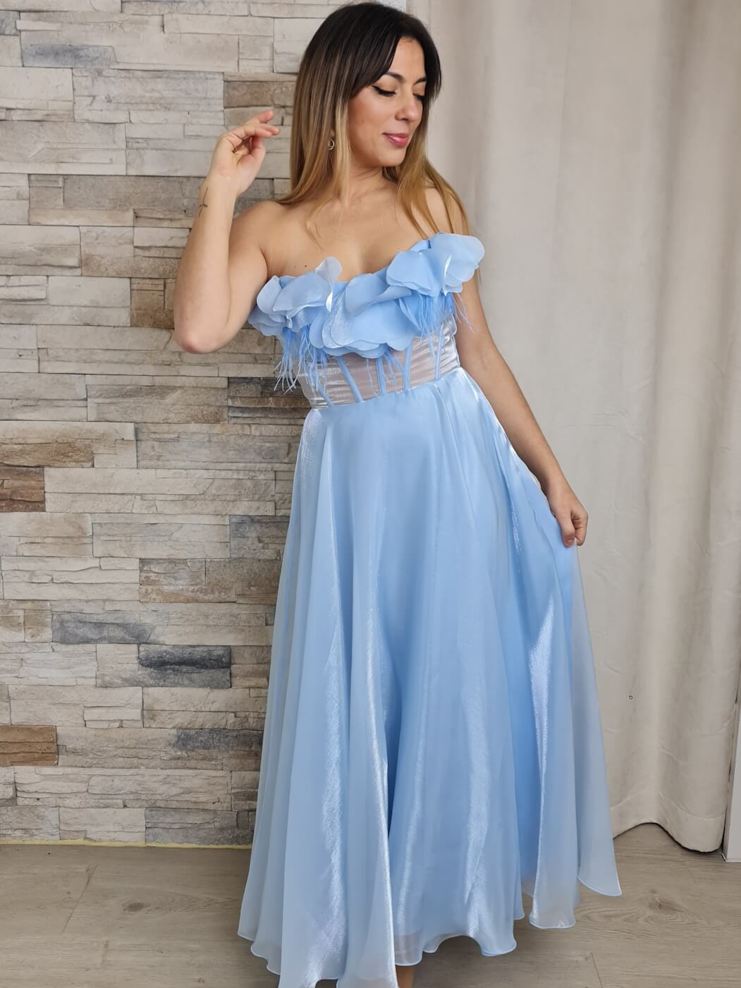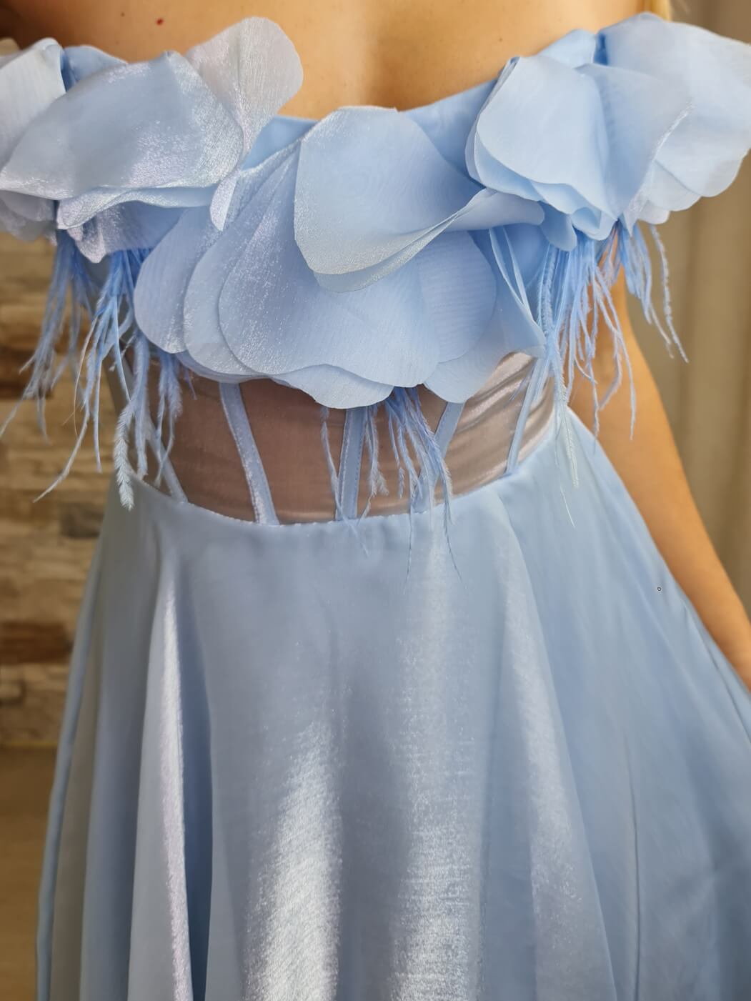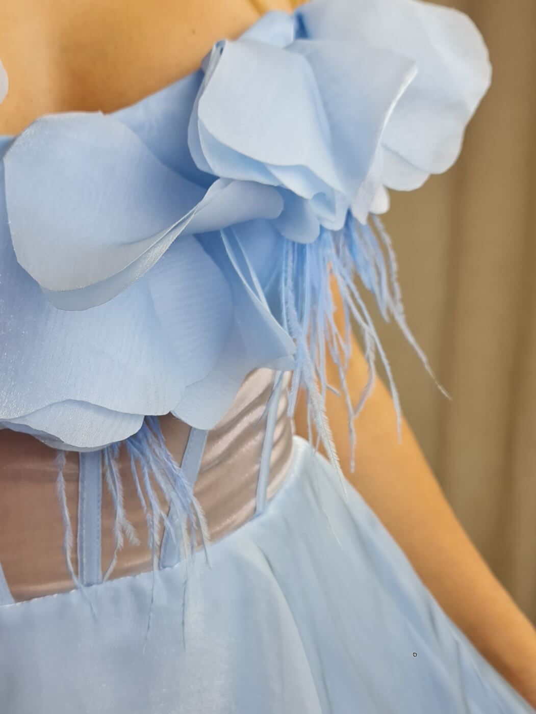 O vestido azul claro exala delicadeza e romantismo, ideal para eventos especiais. O design apresenta um corpete com detalhes de flores em tecido e plumas, adicionando um toque dramático e sofisticado. A saia fluida em tule, com um leve brilho, cria um efeito visual etéreo e elegante.