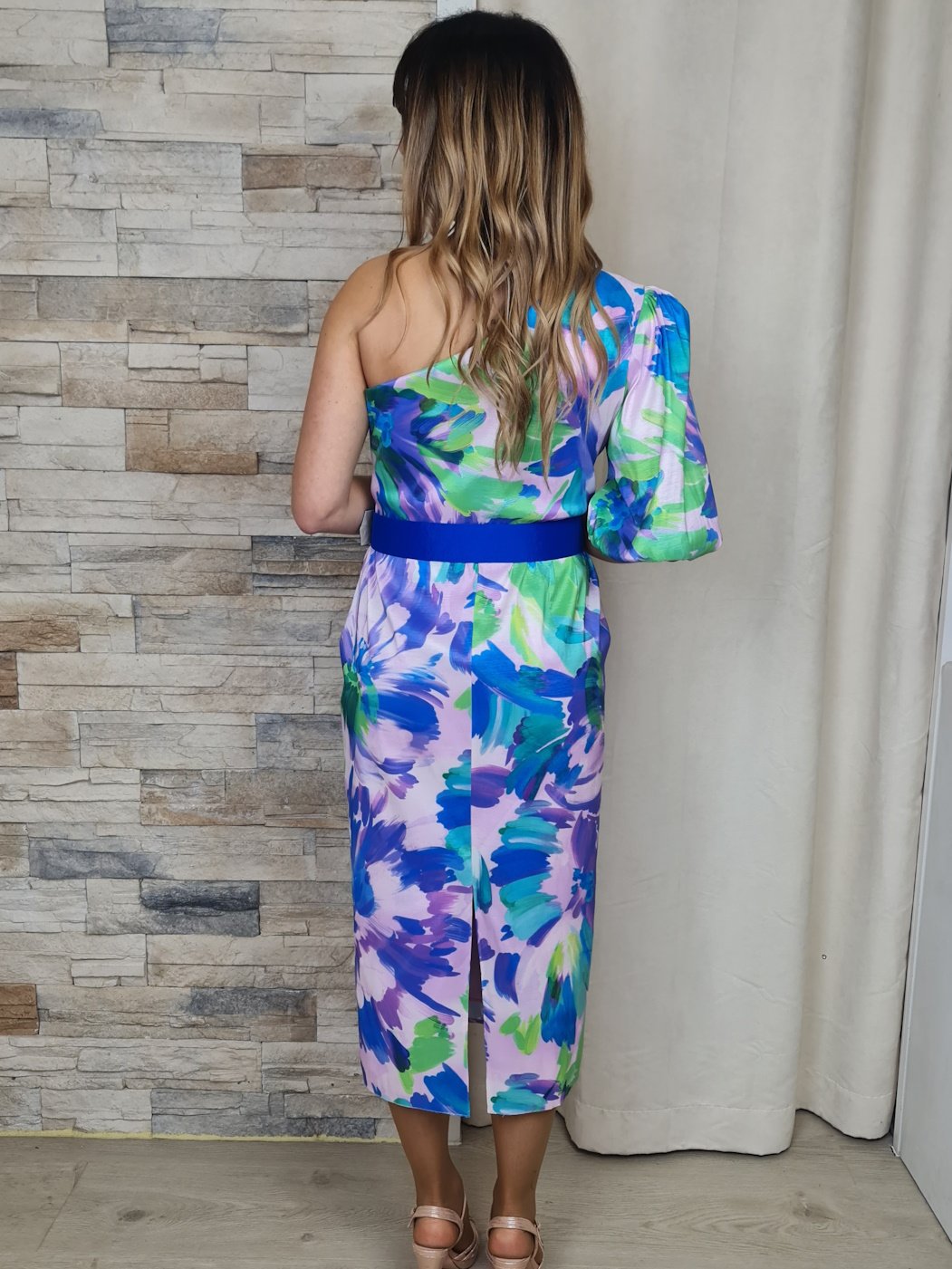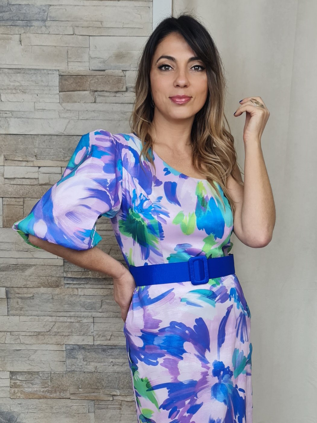 O vestido é uma peça vibrante e moderna, ideal para eventos especiais. O design assimétrico, com um ombro só e uma manga volumosa, adiciona um toque dramático e elegante. A estampa floral em tons de azul, verde e lilás cria um efeito visual interessante e sofisticado, enquanto o cinto azul vibrante define a cintura, valorizando a silhueta feminina.