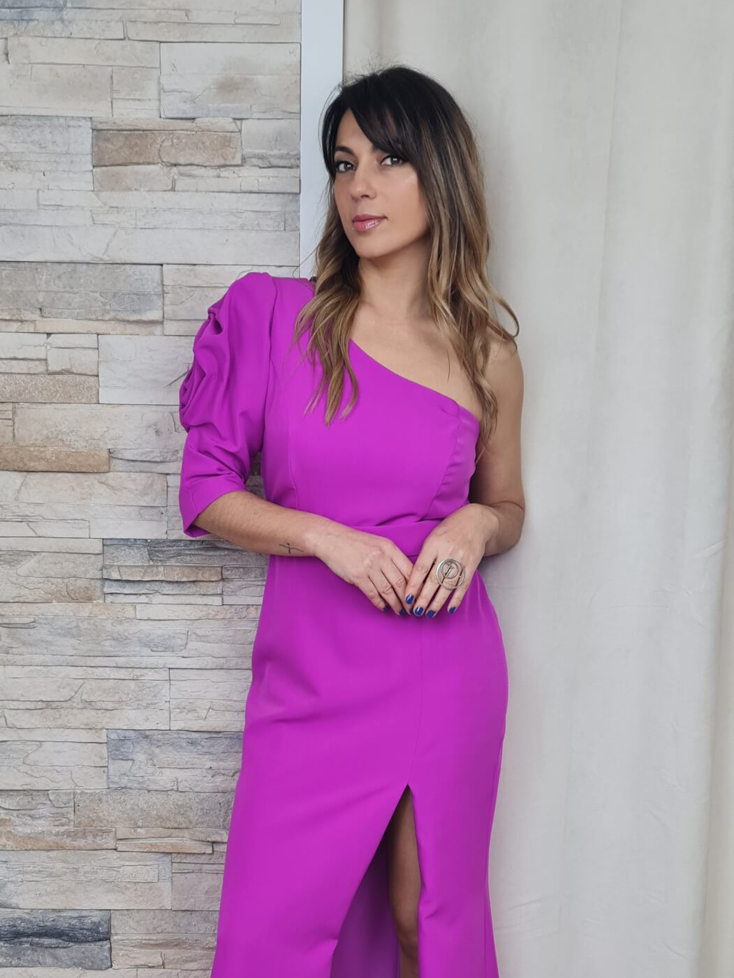 O vestido é uma peça moderna e sofisticada, ideal para eventos especiais. O design assimétrico, com um ombro só e uma manga volumosa, adiciona um toque dramático e elegante. A estampa floral em tons de azul, verde e lilás cria um efeito visual interessante e sofisticado, enquanto o cinto azul vibrante define a cintura, valorizando a silhueta feminina.