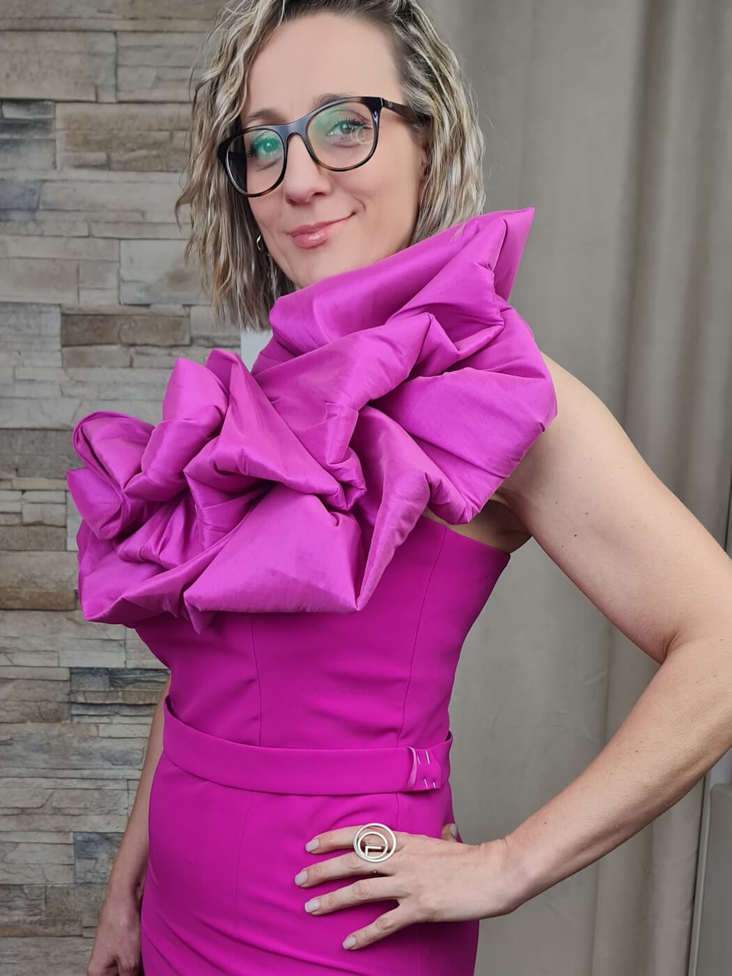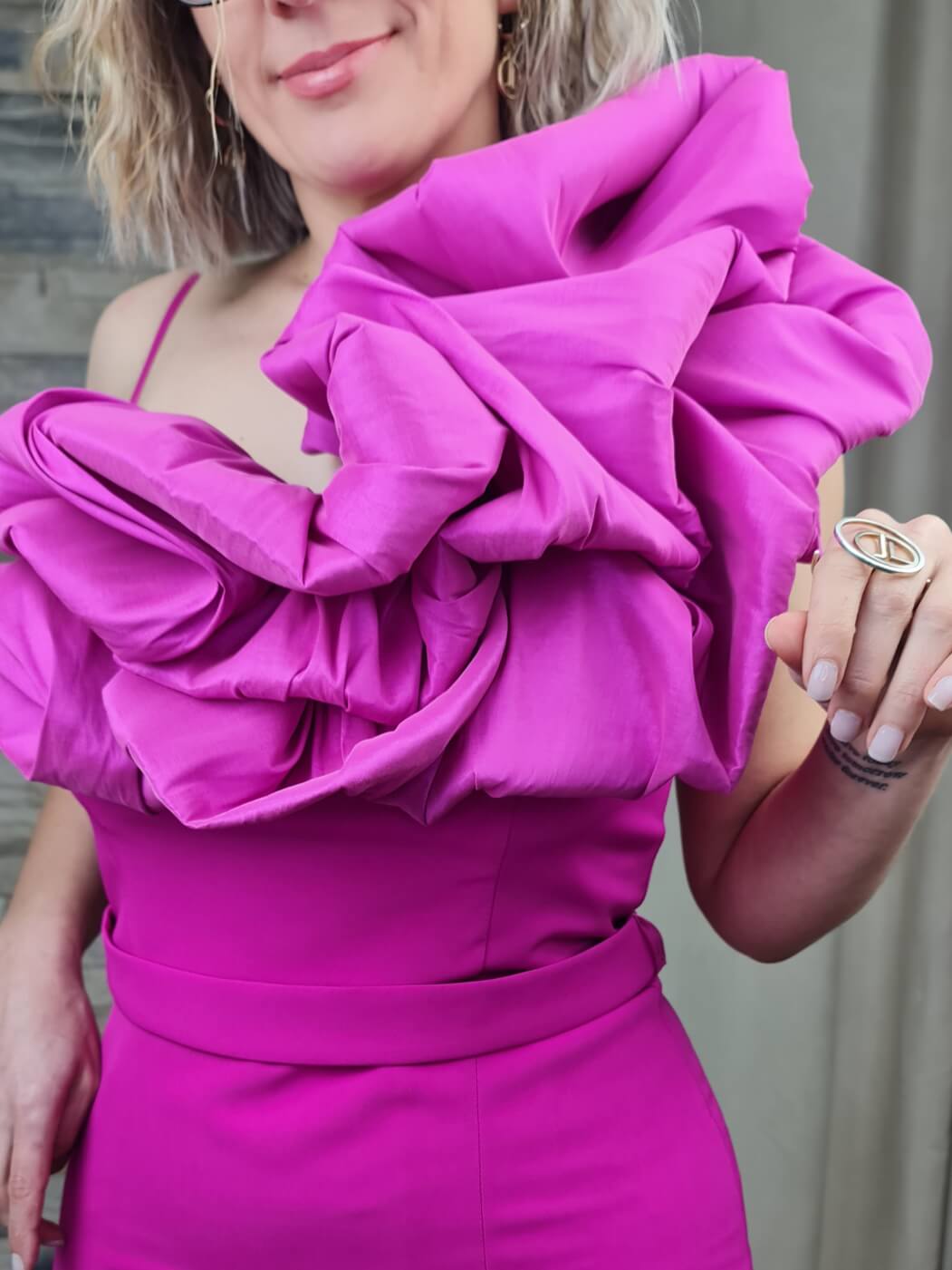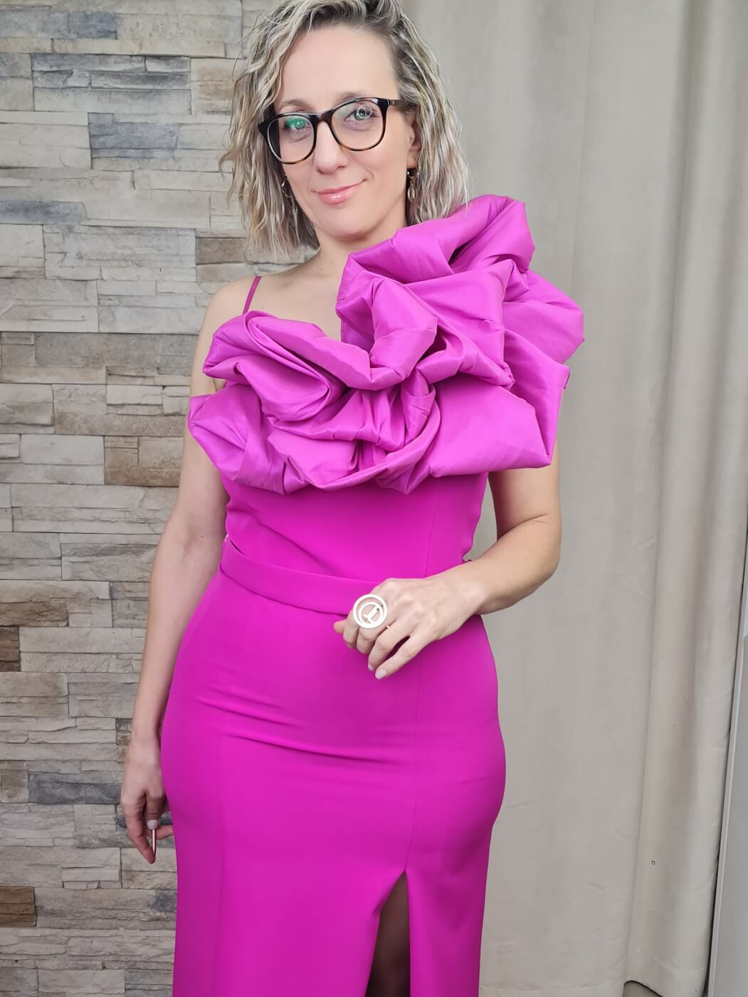 Este vestido magenta é uma declaração de estilo ousada e elegante. O design assimétrico, com uma capa fluida que se estende sobre um dos braços, cria um efeito dramático e sofisticado. O tecido estruturado e o comprimento longo garantem uma silhueta esguia e elegante, enquanto o drapeado frontal adiciona um toque de interesse visual.
