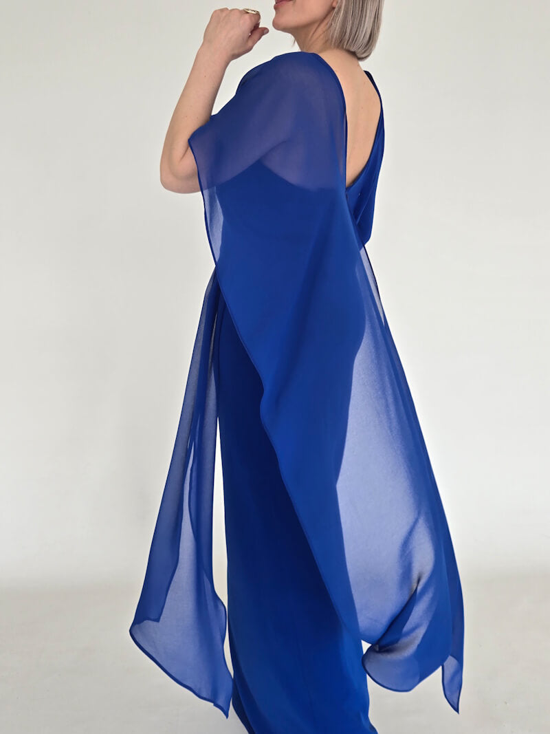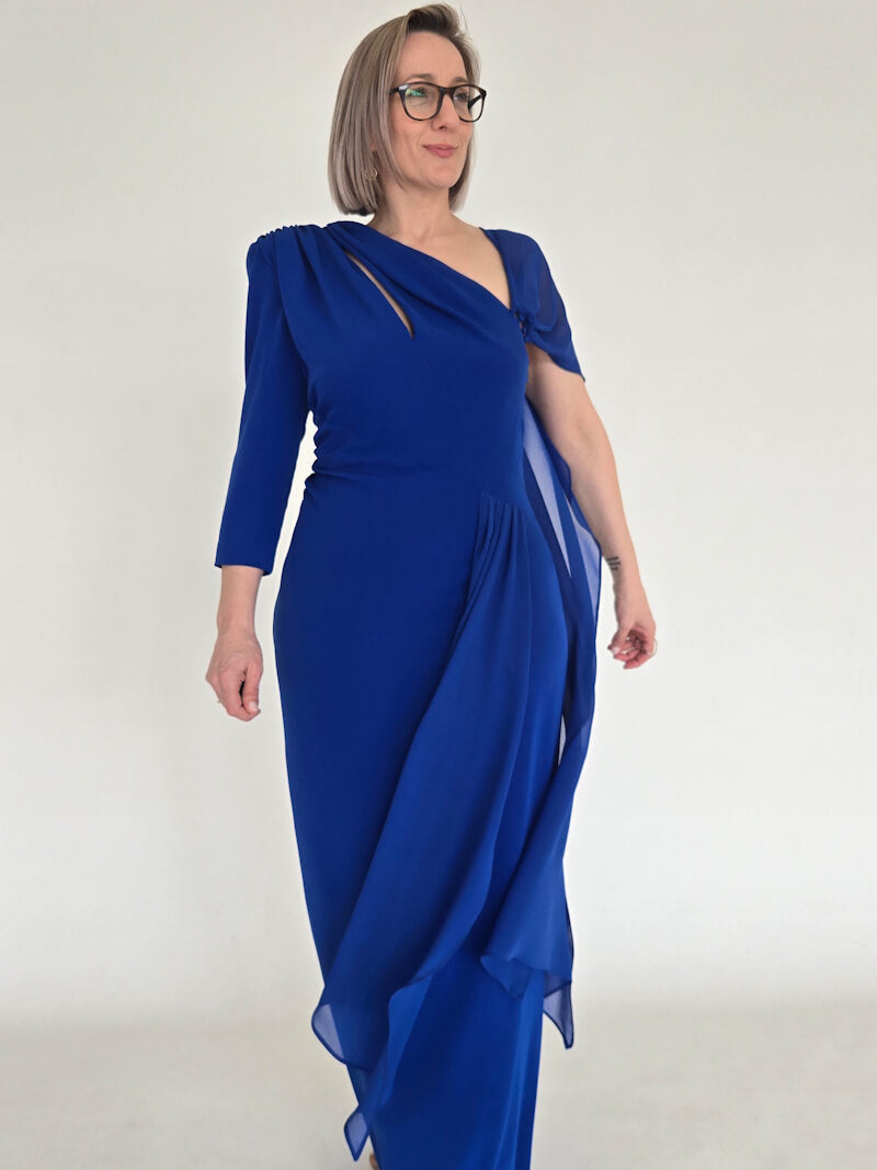 A cor azul, símbolo de serenidade e profundidade, e o decote irregular que desafia o comum, são um lembrete de que a sua diferença é o seu maior trunfo. Este vestido de cerimónia é a ferramenta para assumir o seu lugar com confiança e para criar memórias inesquecíveis, transformando a hesitação em certeza de que a sua presença é inconfundível.