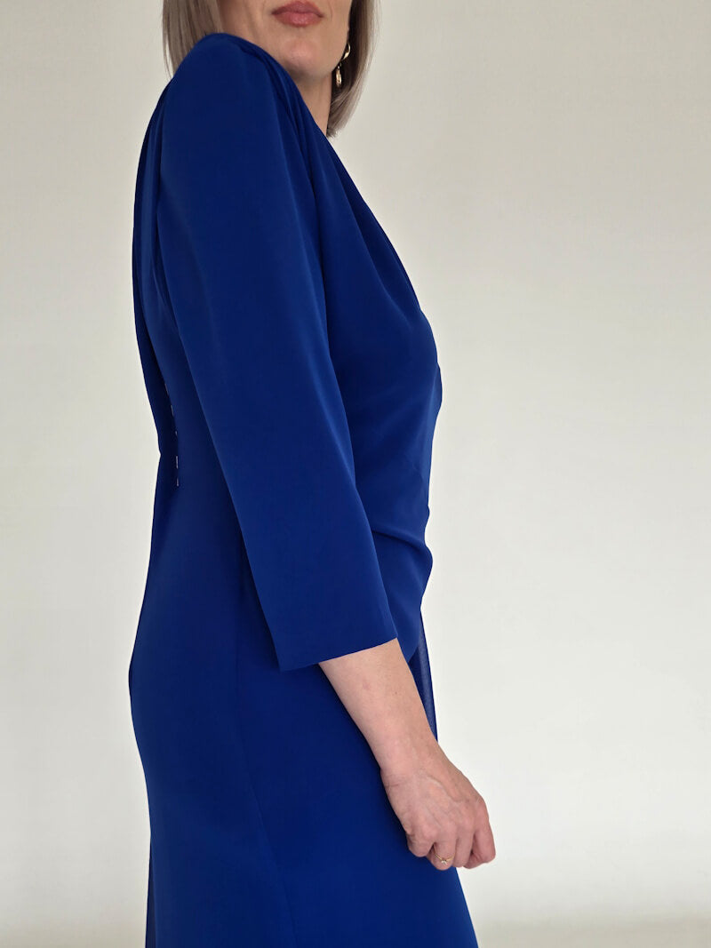 Ao vestir este vestido, o decote assimétrico quebra as regras da simetria convencional, proporcionando uma sensação de ousadia e autenticidade. O tom azul profundo, pensado para transmitir confiança e sofisticação, faz com que se sinta única e inesquecível, transformando a dúvida em certeza absoluta. O seu design assimétrico, que celebra a feminilidade com caráter e elegância, convida-a a abraçar a sua individualidade sem pedir desculpas.