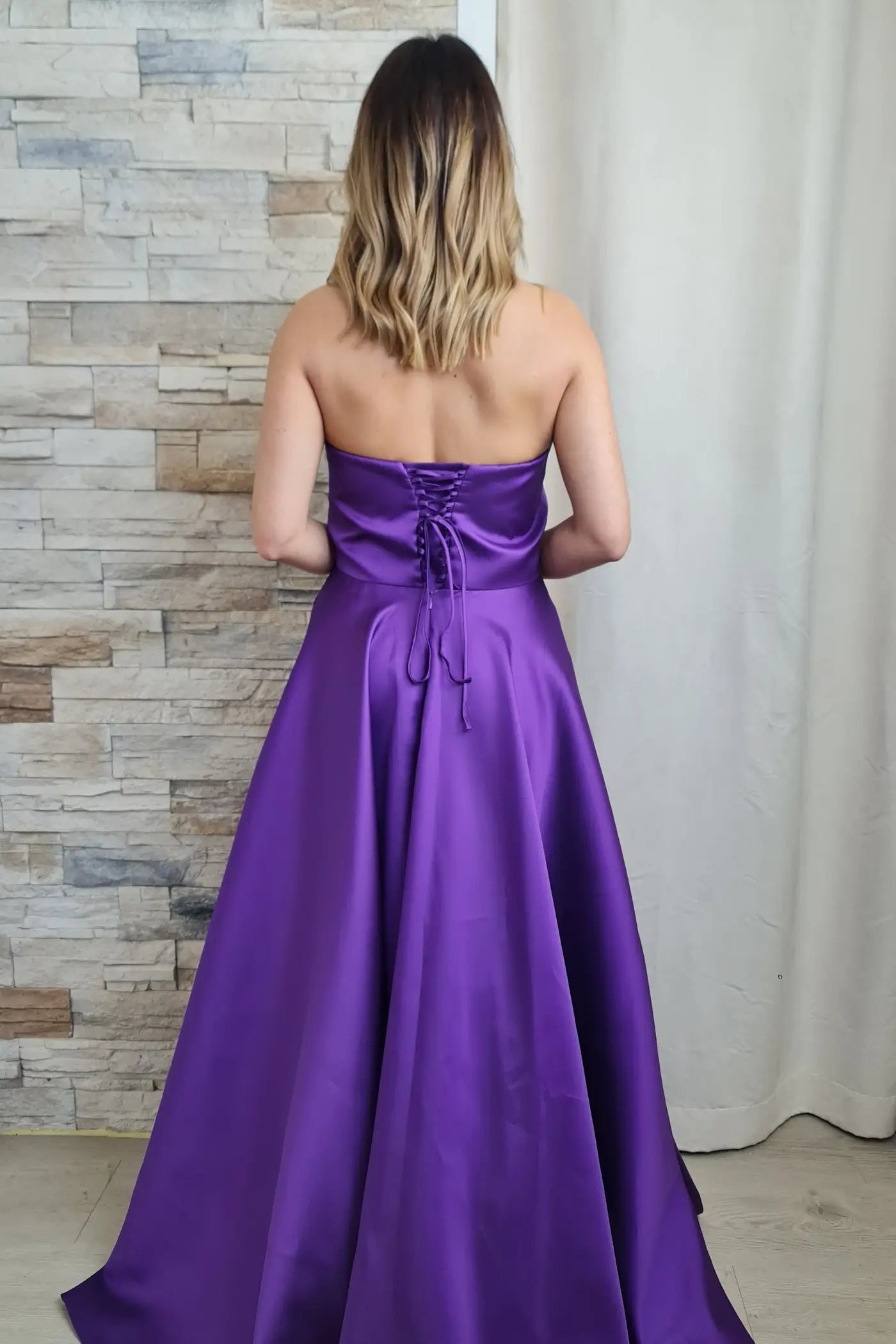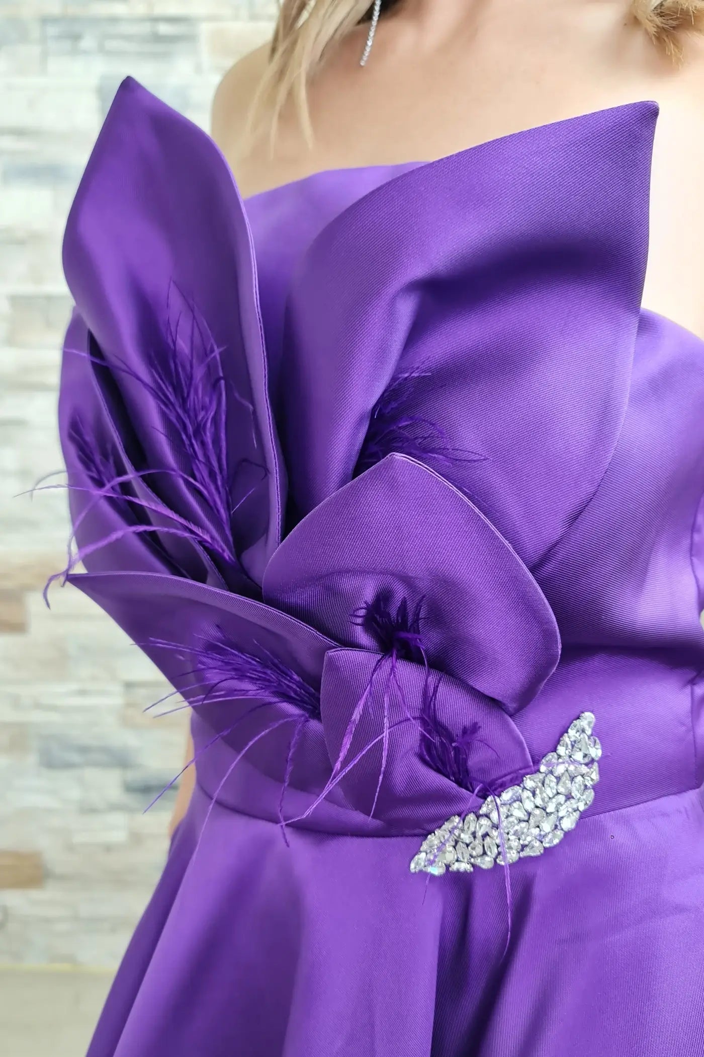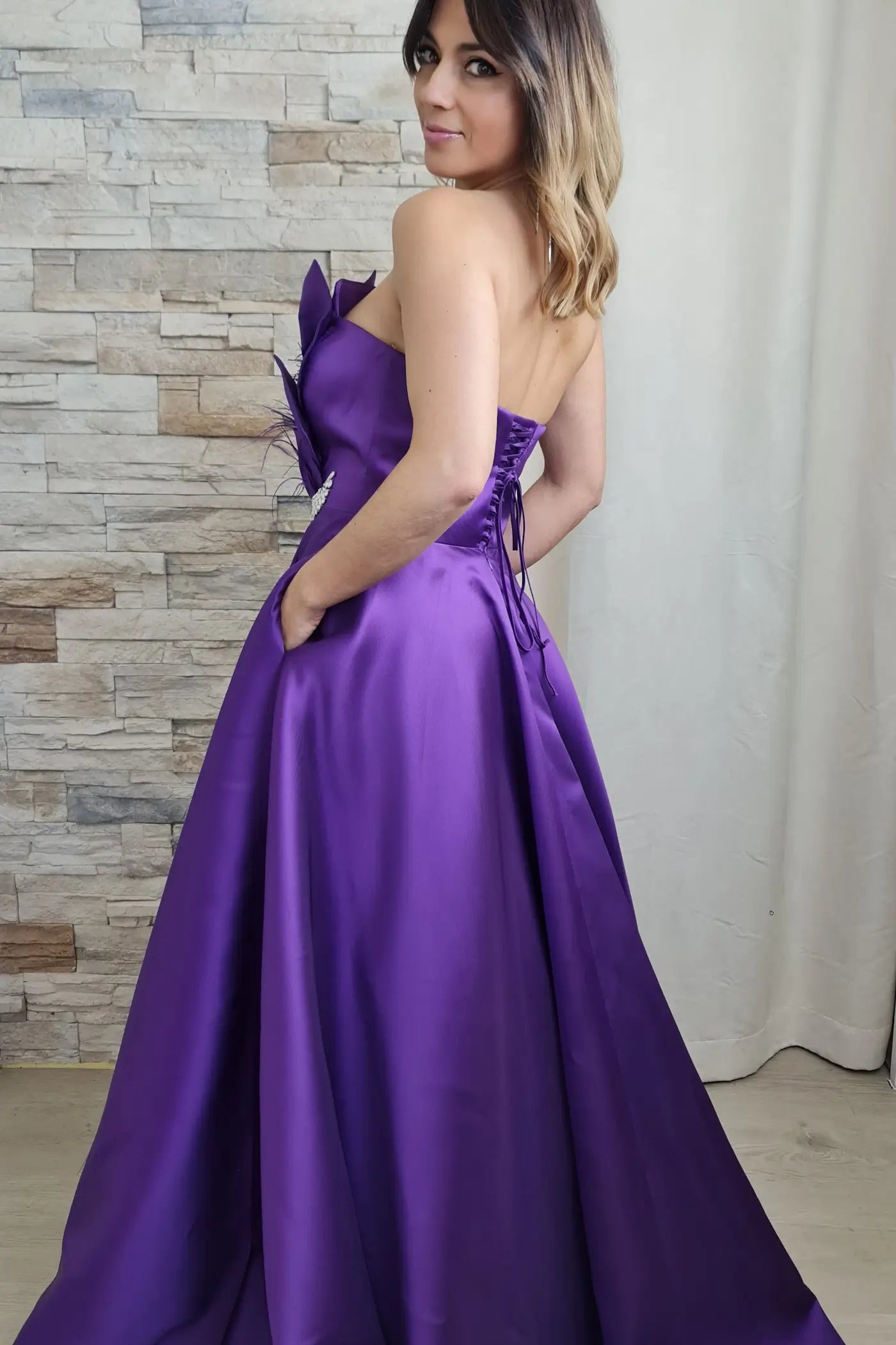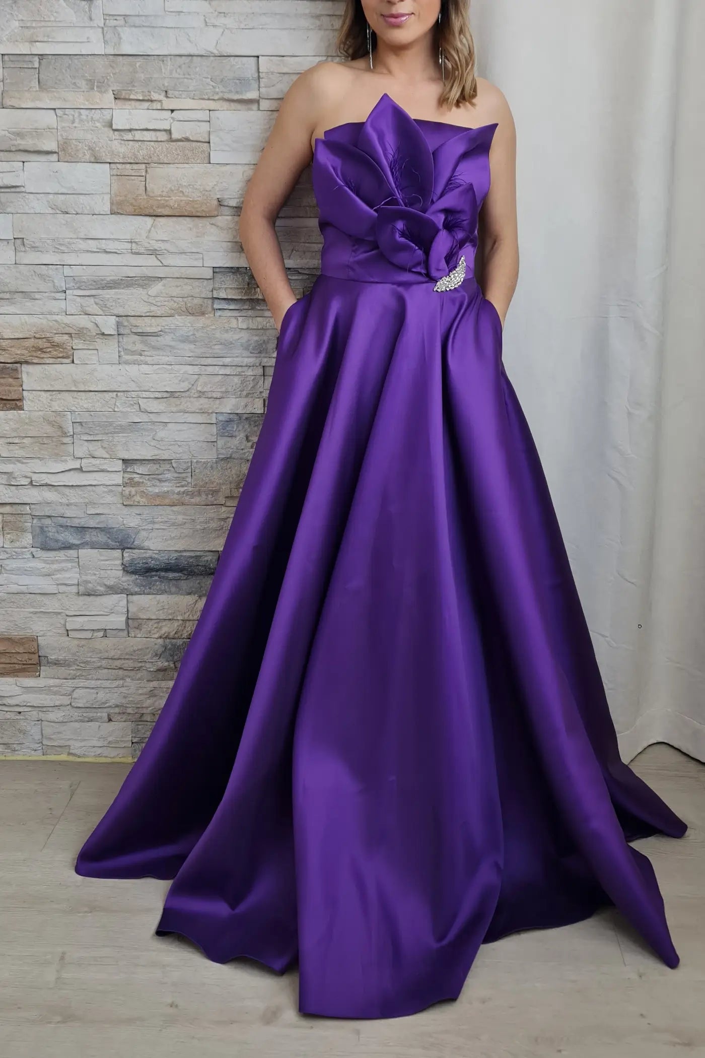 O vestido roxo vibrante é uma peça de alta costura, ideal para eventos de gala. O design apresenta um corpete tomara que caia com detalhes de flores em tecido, adicionando um toque dramático e romântico. A saia longa e fluida, em tecido acetinado, cria um efeito visual elegante e sofisticado.