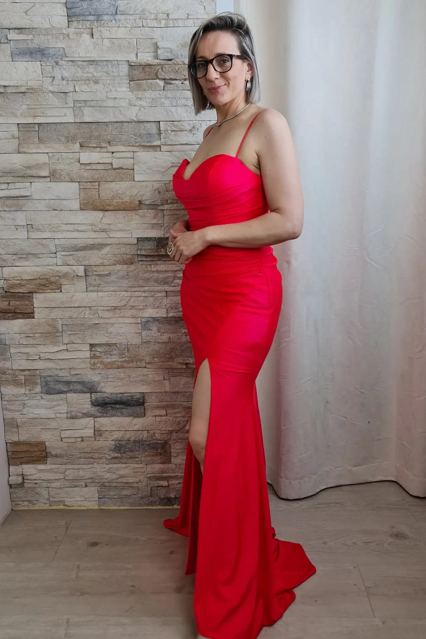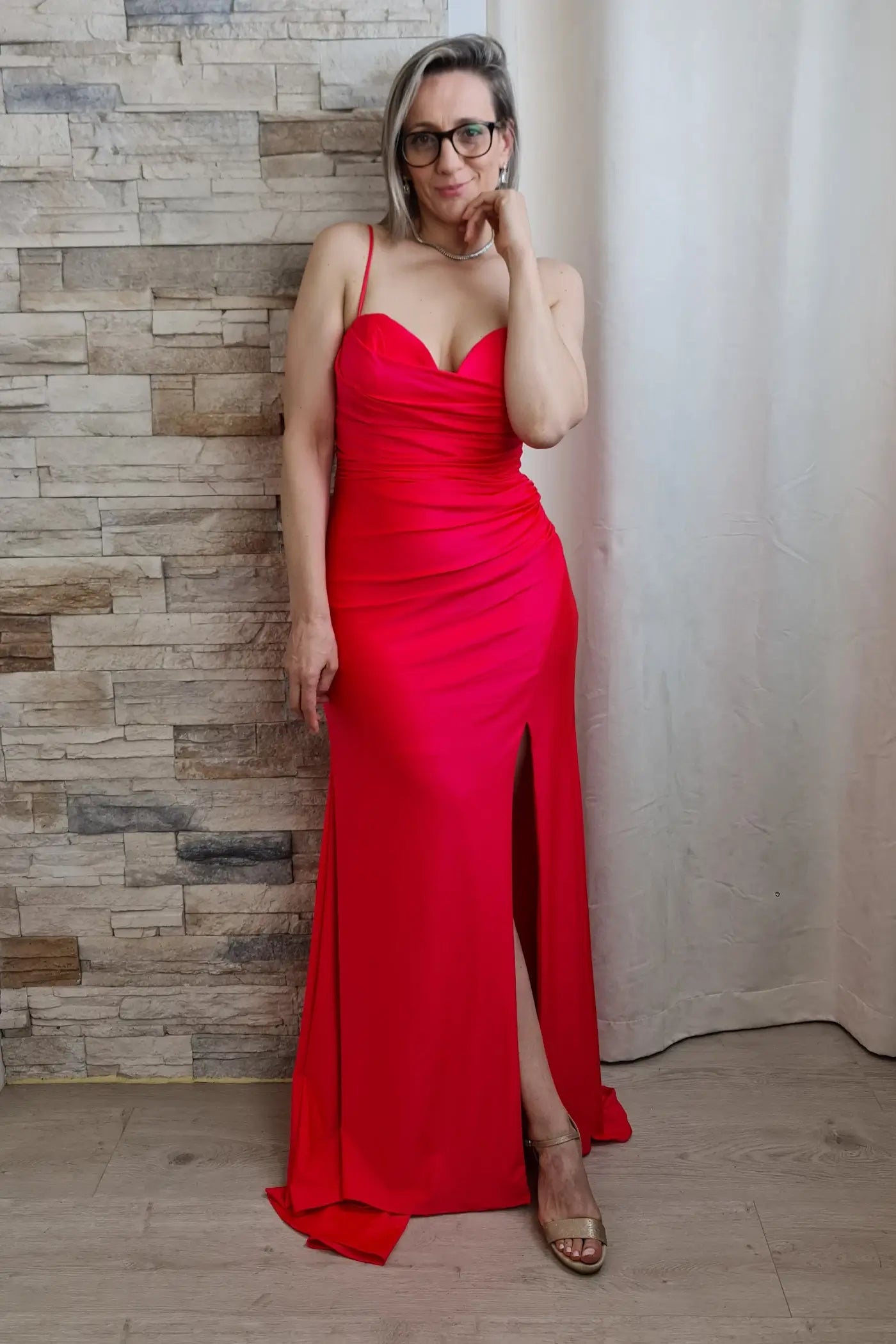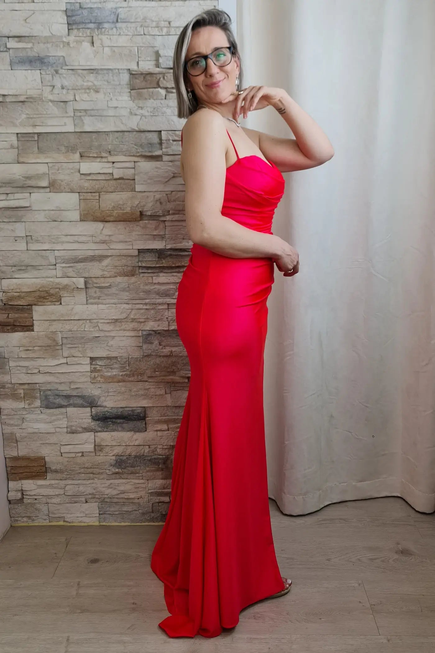 O vestido exibido é longo e de cor laranja avermelhada, com um brilho acetinado. Possui alças finas e um decote em V com um design drapeado no busto, que se estende para a cintura. O corpo do vestido é ajustado, seguindo a silhueta até a altura da coxa, onde a saia se alarga dramaticamente, criando um efeito de cauda de sereia. Há uma racha alta na perna esquerda que vai até a altura da coxa