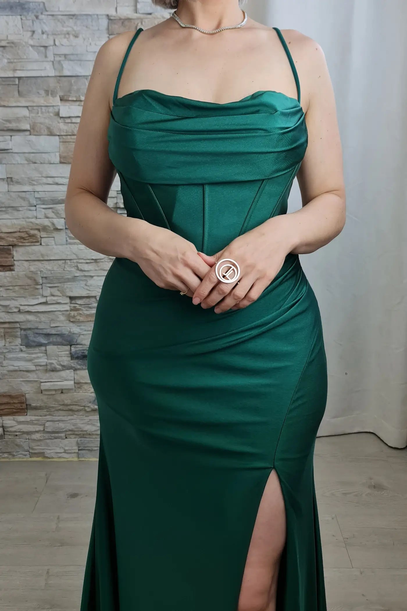 O vestido exibido é longo e de cor verde esmeralda. Possui alças finas e um decote reto com um drapeado que se estende pelo corpete, criando um efeito de espartilho na parte superior. O vestido tem um corte ajustado que realça a silhueta, e a saia se alarga na parte inferior, terminando com uma leve cauda de sereia. Há uma fenda na perna esquerda que vai até a altura da coxa. O tecido é acetinado e com um bom caimento.