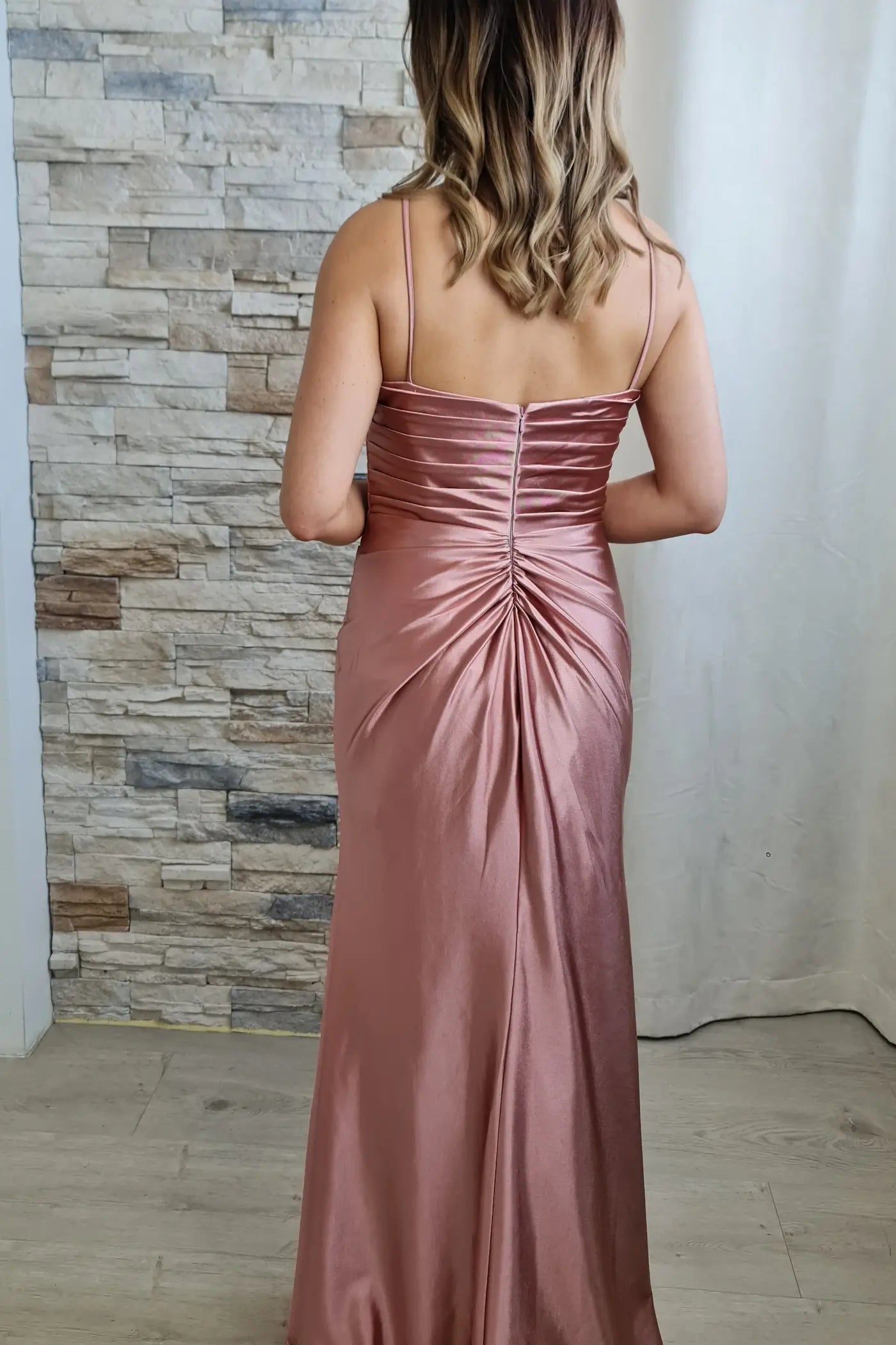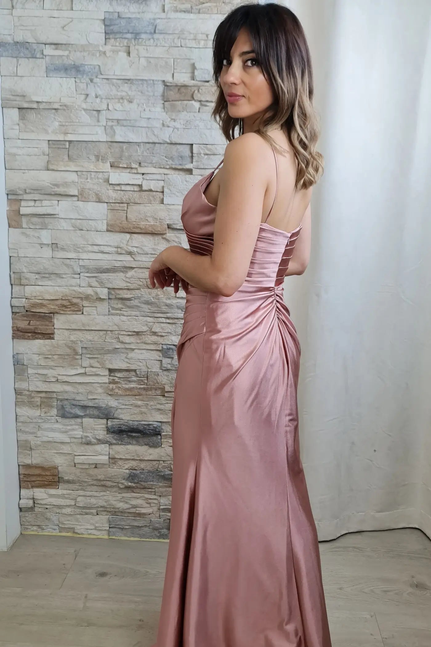 O vestido exibido é longo e de cor rosa velho, com um acabamento acetinado que confere um brilho suave. Possui alças finas e um decote em V com um design drapeado e cruzado que realça o busto. O corpo do vestido é ajustado, seguindo a silhueta até a altura da coxa, onde a saia se alarga dramaticamente, criando um efeito de cauda de sereia. Há um franzido e um drapeado estratégico na lateral esquerda, que adiciona textura e movimento à peça.