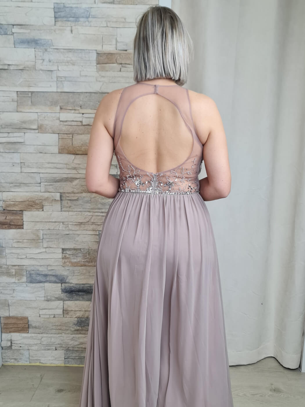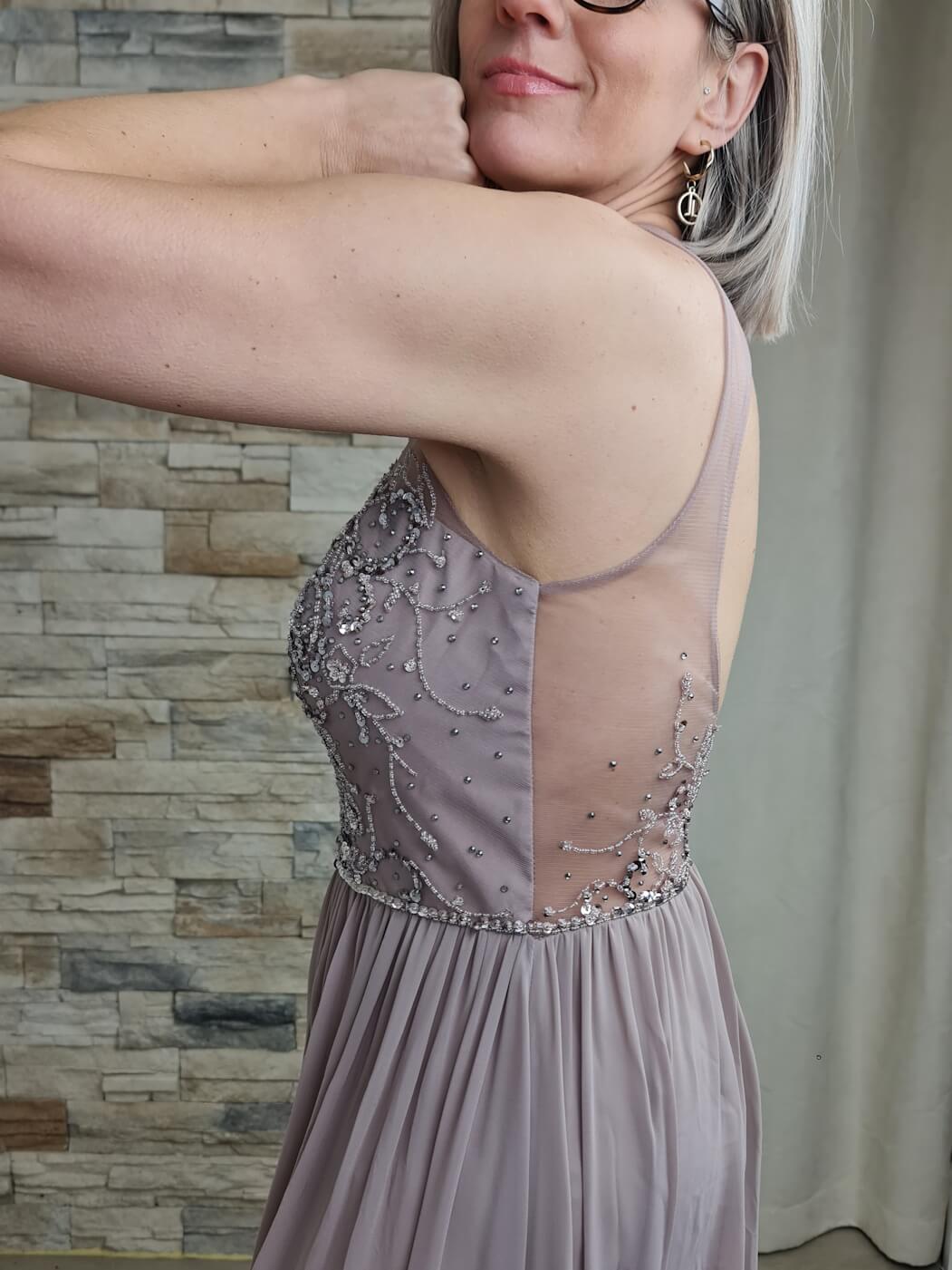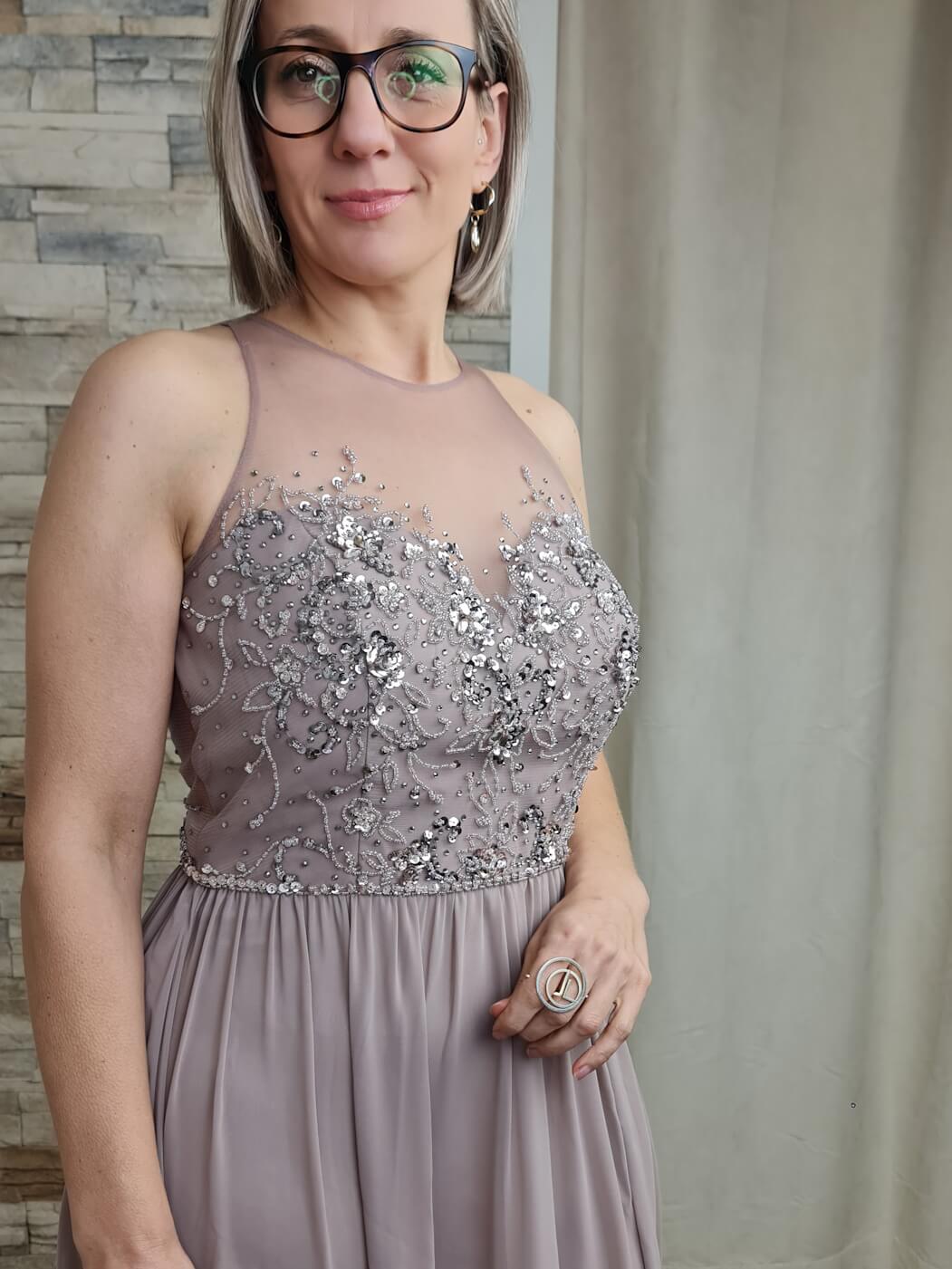 O vestido é uma peça elegante e romântica, ideal para eventos especiais. O design apresenta um corpete com detalhes de renda floral e aplicações de brilho, adicionando um toque sofisticado e delicado. A saia longa e fluida, em um tom de malva suave, cria uma silhueta esguia e elegante.