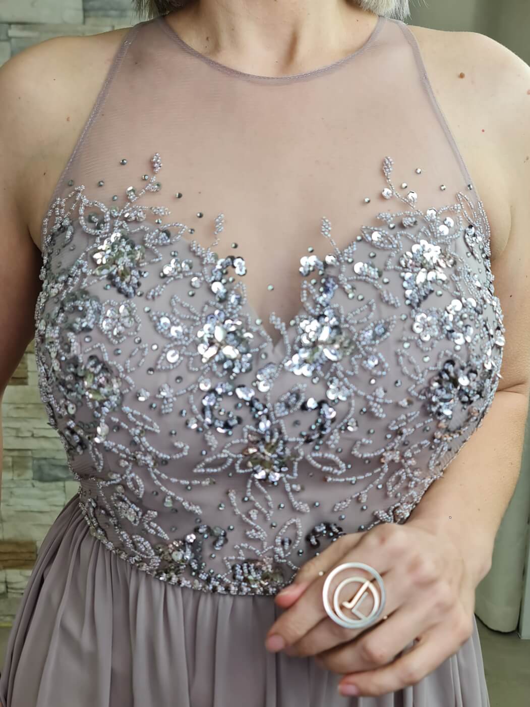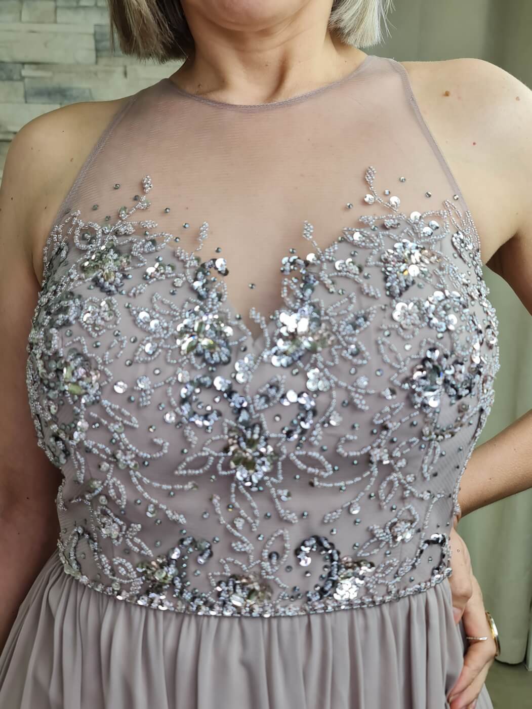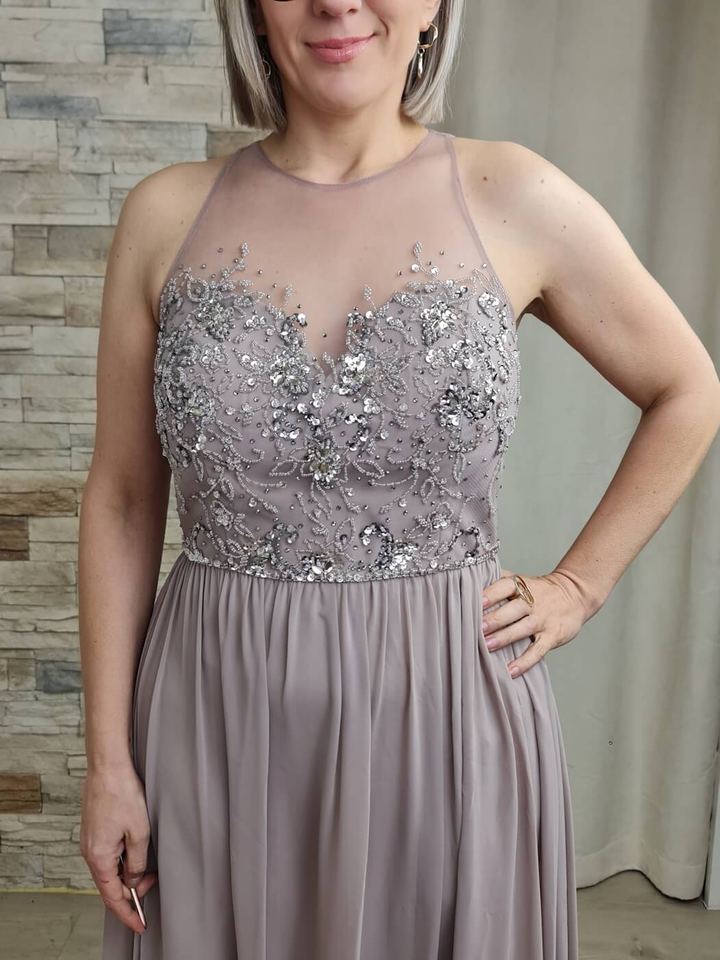 O vestido é uma peça elegante e romântica, ideal para eventos especiais. O design apresenta um corpete com detalhes de renda floral e aplicações de brilho, adicionando um toque sofisticado e delicado. A saia longa e fluida, em um tom de malva suave, cria uma silhueta esguia e elegante.