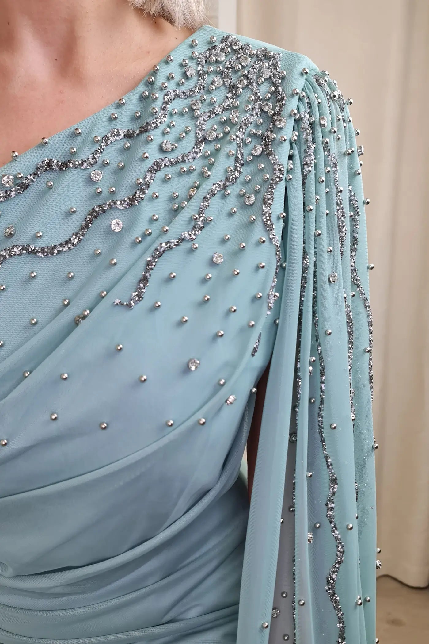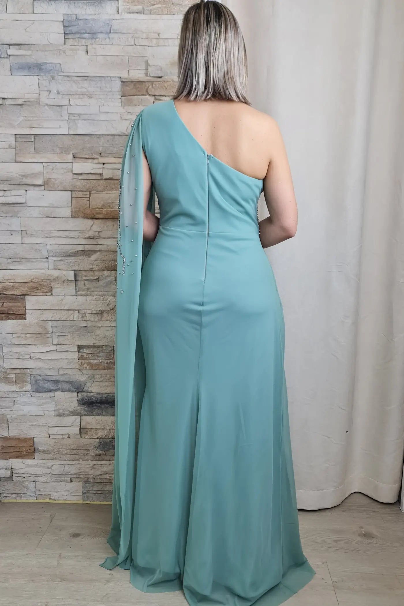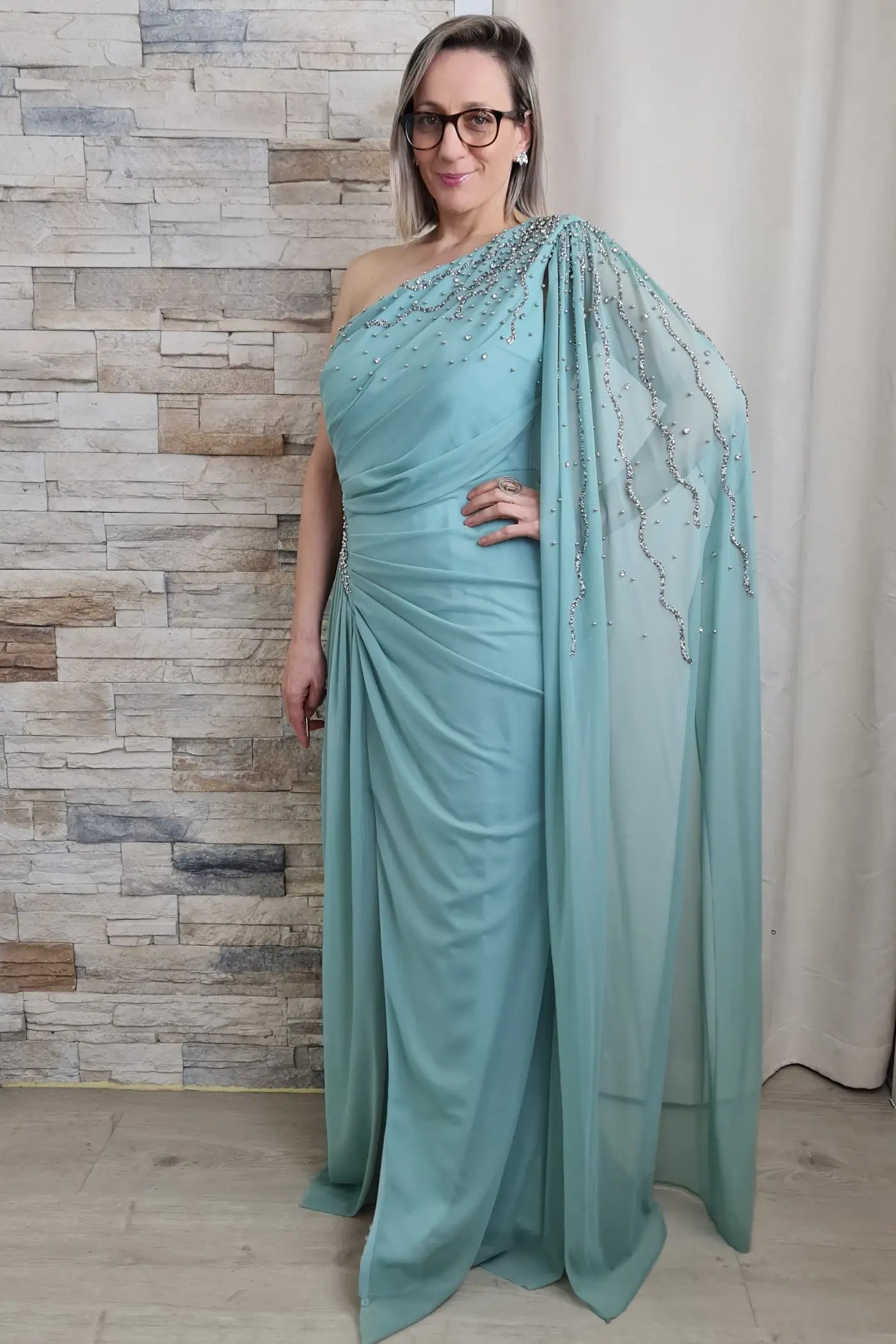 O vestido verde água é uma peça elegante e sofisticada, ideal para eventos especiais. O design apresenta um ombro só, com detalhes drapeados no corpete, que adicionam um toque dramático e romântico. As mangas longas e fluidas, com aplicações de brilho, criam um efeito visual interessante e luxuoso.