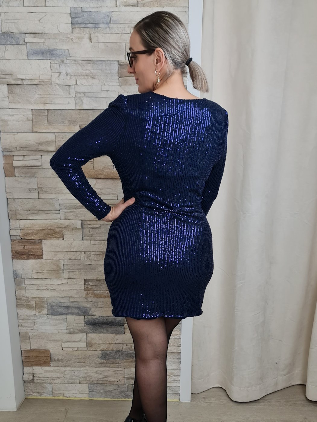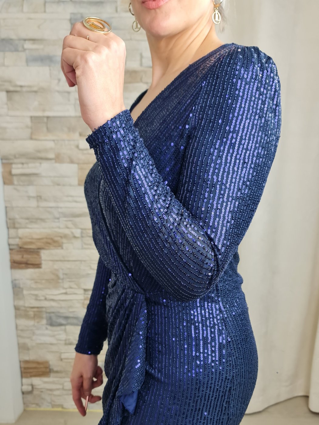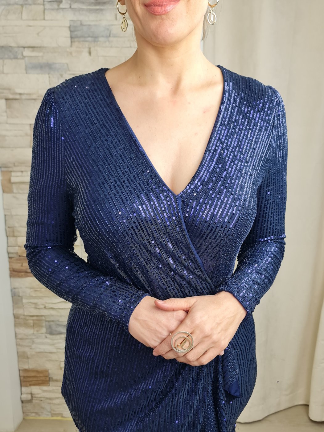 O vestido é uma peça moderna e elegante, ideal para eventos especiais. É todo coberto por lantejoulas azuis brilhantes, criando um efeito glamoroso e sofisticado. O vestido possui um decote em V transpassado e mangas compridas.